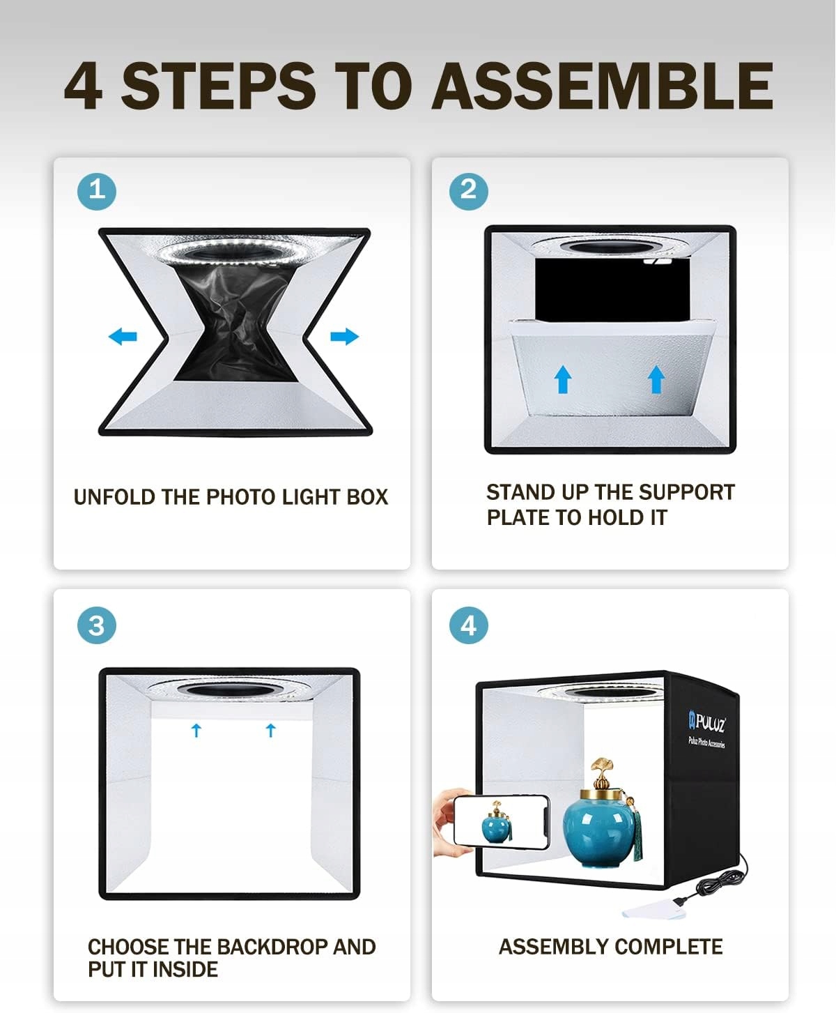 【Зйомка під різними кутами】Портативний світловий короб розроблений відповідно до ваших різноманітних вимог, які включають зйомку предметів під різними кутами, переднє вікно підтримує горизонтальну зйомку, а верхній отвір підтримує вертикальну зйомку під кутом 90 градусів, ви можете робити чіткі фотографії на тлі різних кольорів за допомогою різних пристроїв, таких як смартфони, фотоапарати чи професійні камери.