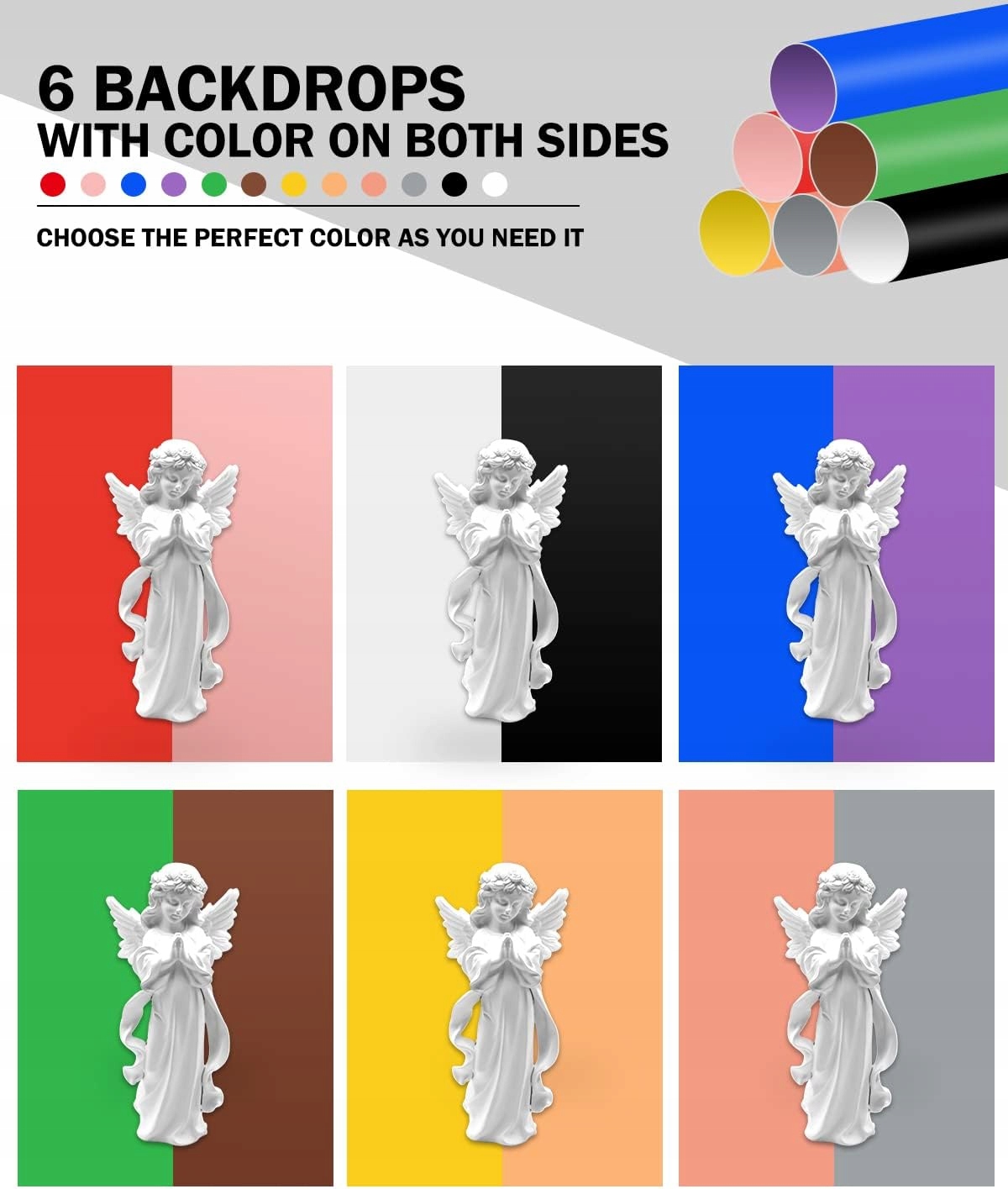 【12 барвистих фонів】Лайтбокс для фотографії з 6 двосторонніми знімними фонами. Він виготовлений з крейдованого паперу, обидві сторони кольорові (білий/чорний, червоний/рожевий, жовтий/помаранчевий, синій/фіолетовий, зелений/коричневий, золотий/сірий). Папір з покриттям має певну товщину та стандарт кольору, ви можете налаштувати колір фону відповідно до ваших потреб для створення різних фотосцен.