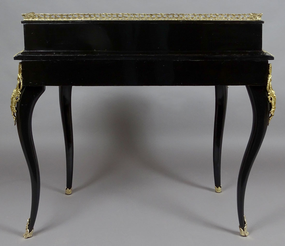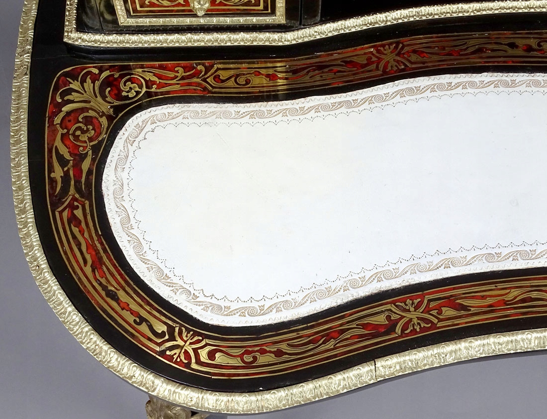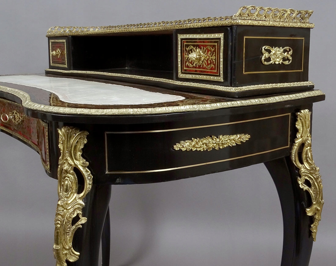 зі стільницею, подібною до овальної форми, з хвилястим контуром, що спирається на чотири ніжки-кабріоли. Верх і рама інкрустовані вигравіруваним латунним листом у вигляді вусиків рослин, квітів і листя на черепаховому тлі. Ящик має висувний ящик зі сталевим замком і ключем. Верх обрамлений латунною смугою, як і бічні частини меблів, включаючи ящик. Надбудова з двома маленькими ящиками з боків, прикрашена зверху тонкою латунною прожилкою і ажурною галереєю. Ажурні бронзові аплікації на ніжках вгорі. Тиснена шкіра на стільниці меблів.
