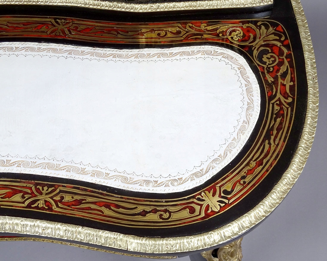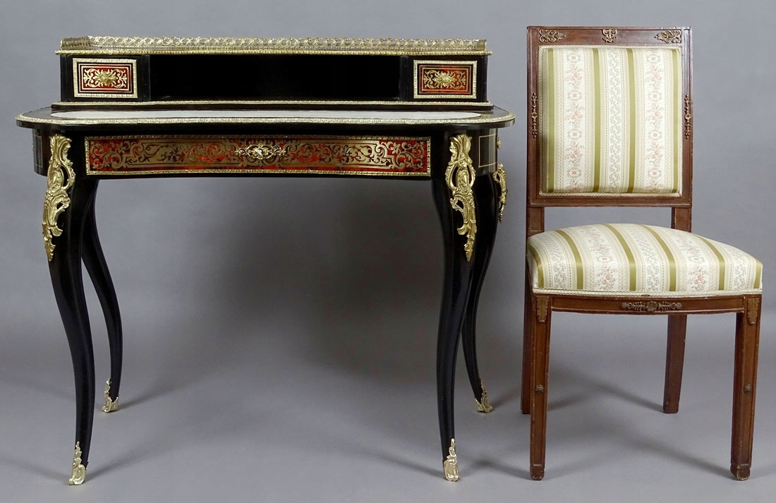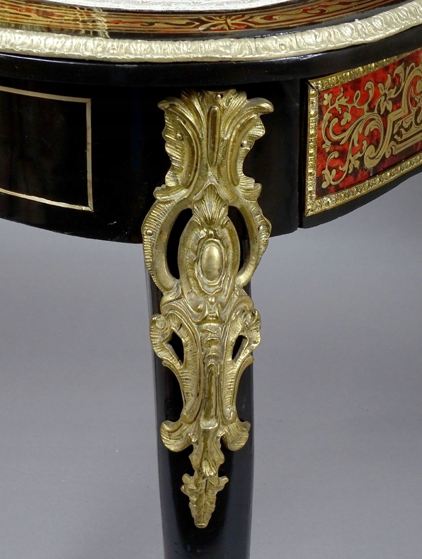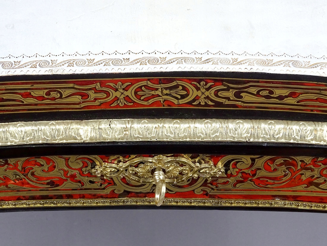 зі стільницею, подібною до овальної форми, з хвилястим контуром, що спирається на чотири ніжки-кабріоли. Верх і рама інкрустовані вигравіруваним латунним листом у вигляді вусиків рослин, квітів і листя на черепаховому тлі. Ящик має висувний ящик зі сталевим замком і ключем. Верх обрамлений латунною смугою, як і бічні частини меблів, включаючи ящик. Надбудова з двома маленькими ящиками з боків, прикрашена зверху тонкою латунною прожилкою і ажурною галереєю. Ажурні бронзові аплікації на ніжках вгорі. Тиснена шкіра на стільниці меблів.