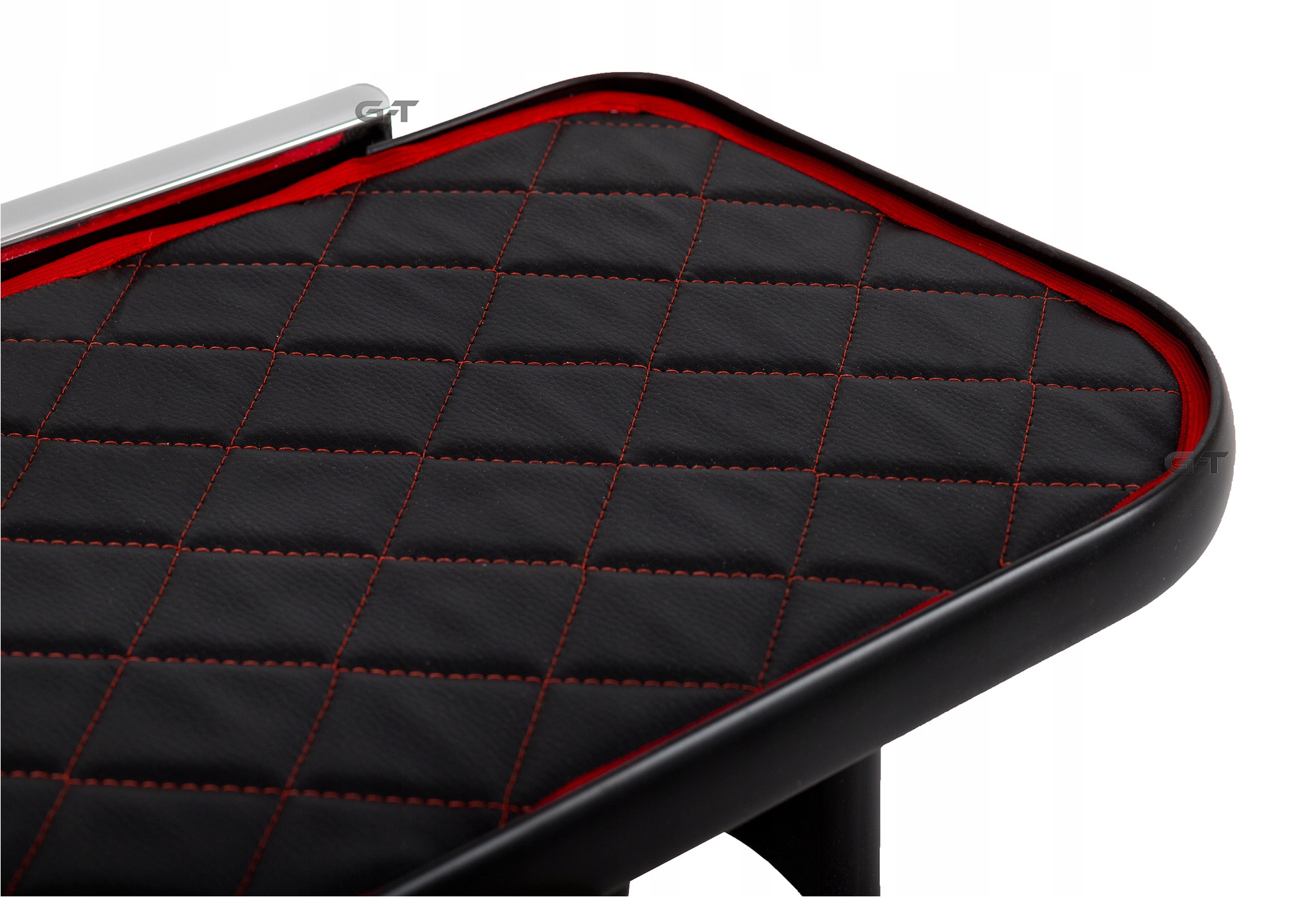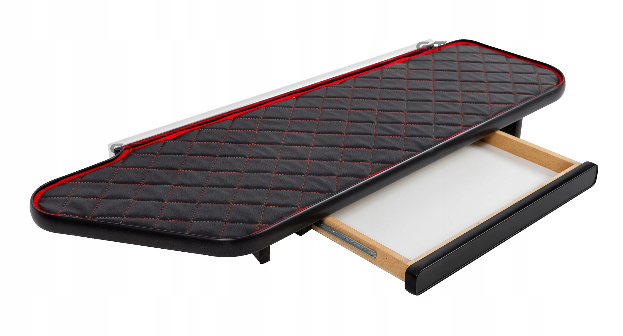 Етажерка з високоякісної дерев'яної дошки, обшита чорним стьобаним килимком з червоною ниткою та червоним труб, з фрезер лапки.