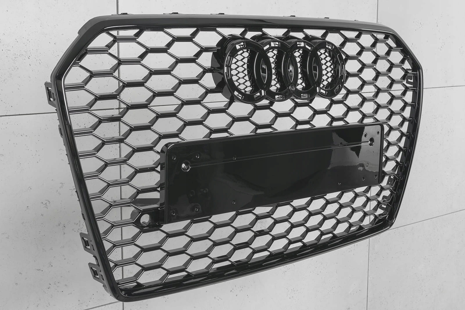 Спеціальна решітка розроблена в стилі, типовому для автомобілів сегменту RS. Решітка радіатора з характерним стільниковим візерунком неминуче нагадує респектабельні потужні спортивні автомобілі найвищої якості. Елемент вражає своїм спортивним характером, а глянець пофарбованих в чорний колір елементів додає елегантності, завдяки чому він ідеально поєднується з вражаючим дизайном AUDI S6.