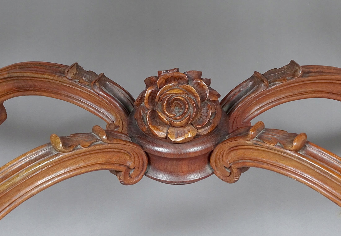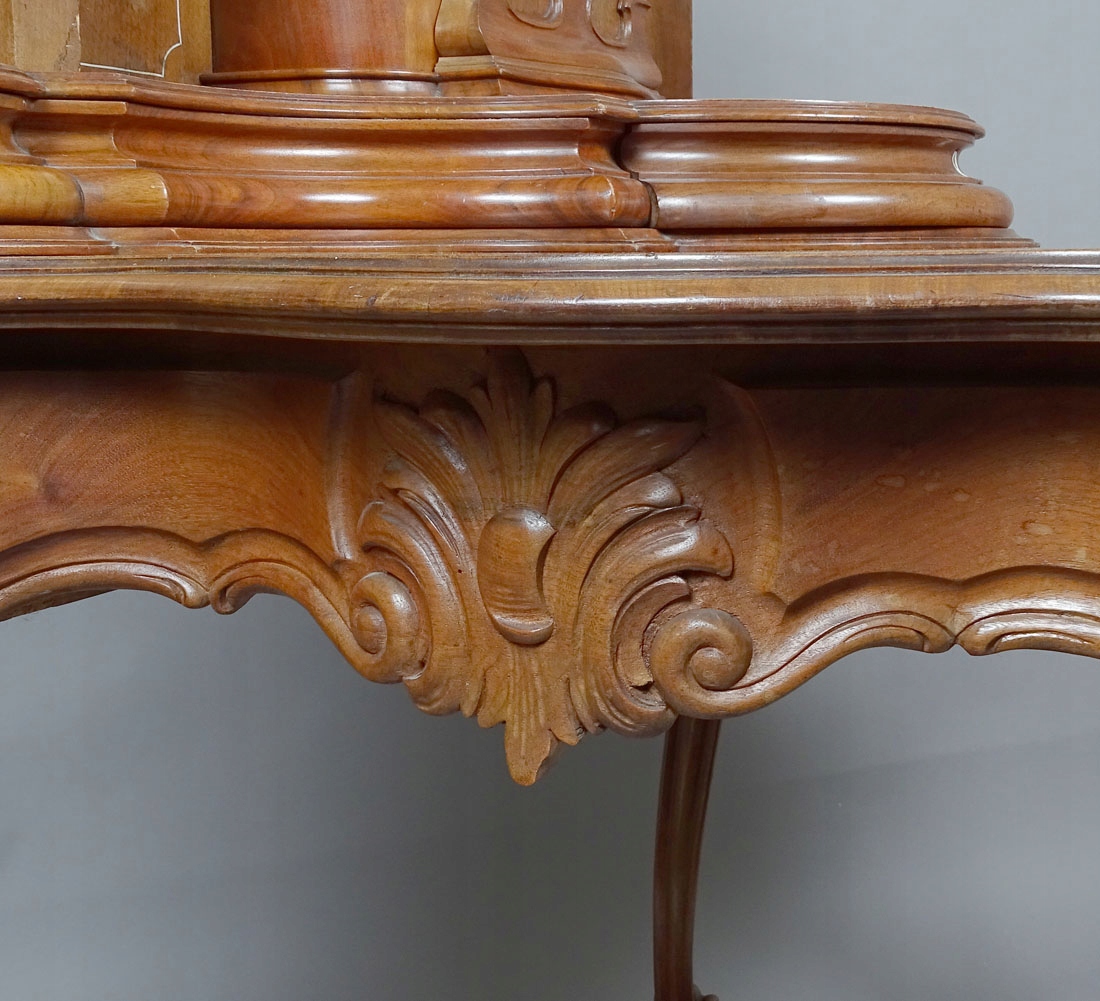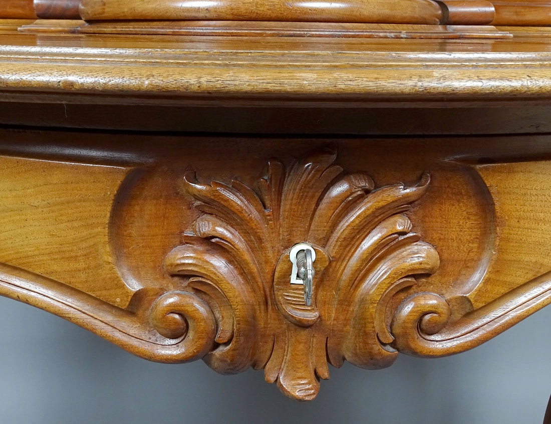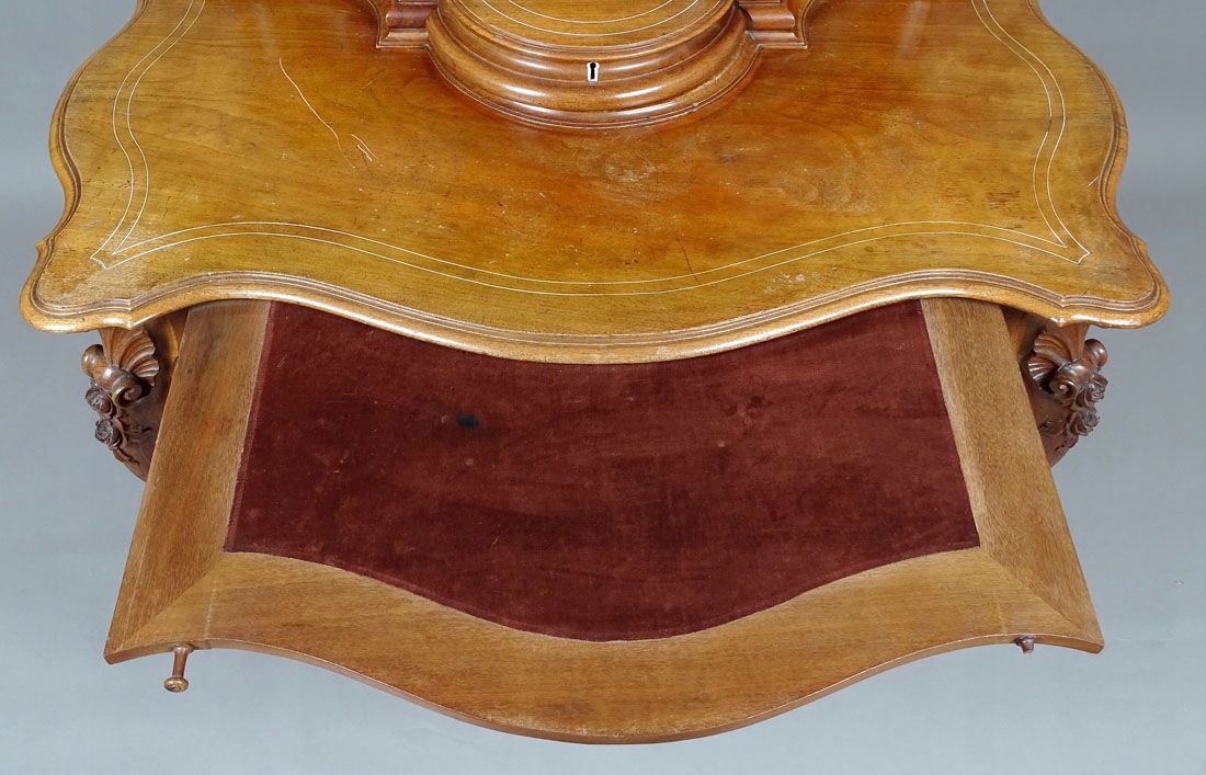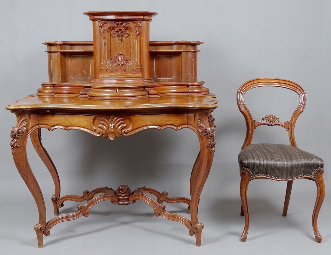 4 Зверху з хвилястим краєм, прикрашеним інкрустаціями у вигляді подвійної кісткової лінії. У глазур'ю ящик з блискавкою та висувна стільниця письма з бордовим полотном. Поклавши з багатьма уявами та увігненнями, з невеликим ящиком на дні, з боків з поличками, а в середині ключовим зберіганням, прикрашеним дерев’яним вирізом у вигляді тонких троянд і листя. Подвійні кісткові вени на панелях і дверях. Ноги, прикрашені різьбленими трояндами та дубовим листям, складними внизу профіленого лугу з квіткою посередині.