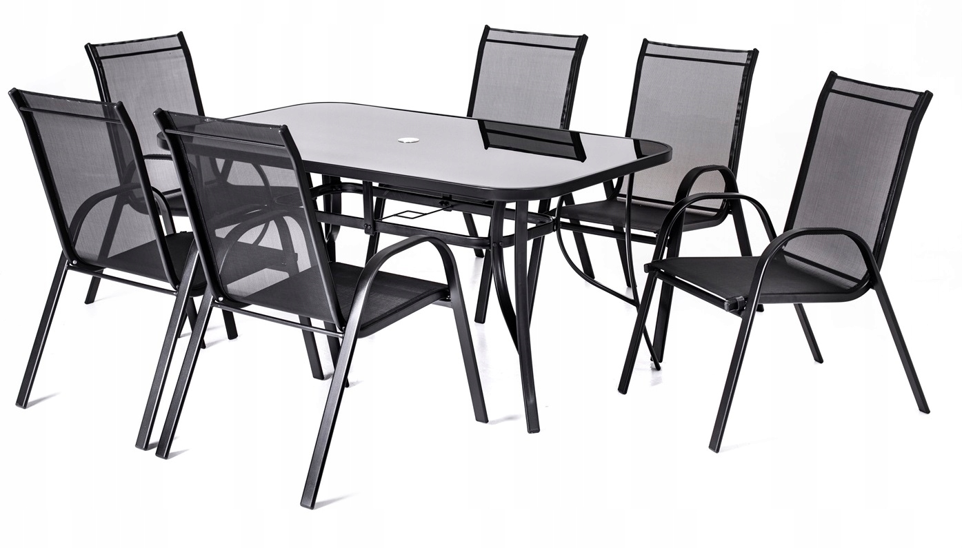 Садовий стіл ідеально підходить для вашого саду. Рама має подвійне порошкове покриття, що робить цей виріб ідеальним як для внутрішнього, так і зовнішнього використання. Використані матеріали не вимагають частого догляду, стійкі до погодних умов і не потребують спеціальних засобів догляду. Ніжки додатково оснащені пластиковими накладками. Стіл має стільницю з чорного загартованого скла. 5 мм, з отвором для садової парасольки.