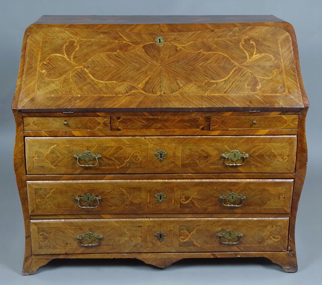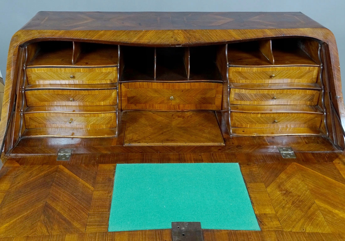 з вигнутою лінією каркаса, спирається на чотири консольні ніжки, які є продовженням каркасу меблів. У ящику внизу є три великі шухляди з латунними кріпленнями з боків і ключами посередині та сталевими вставними замками всередині. Лицьові сторони шухляд оточені скошеним шпоном, всередині — вставки з геометричним візерунком, аналогічні прикраси на опуклих сторонах секретера. Над цими ящиками є два менших з боків з маленькими ящиками. Під висувною кришкою, встановленою на сталевих петлях з двома упорами з боків, розташовано шість ящиків у два ряди і один трохи більшого розміру по центру. Над ними розташовані відділення, а під ними — відділення для речей під висувною кришкою. Клапан стайні має тканину зеленого кольору та сталевий кований накладний замок. Транспортна етикетка на прикріпленій задній частині.