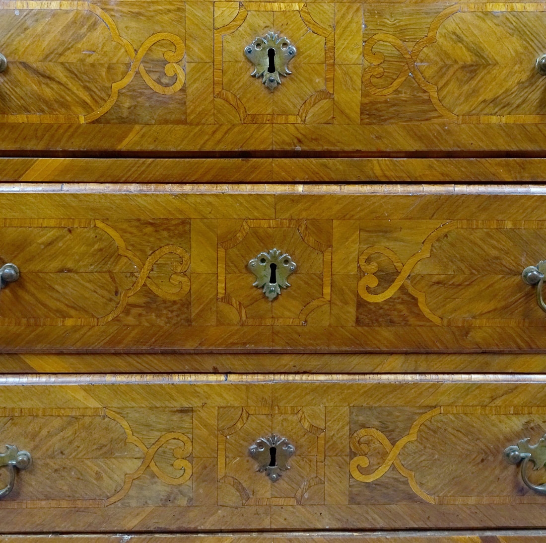 Конструкція з хвойного дерева, шпон палісандра та волоського горіха, пізніше латунні фітинги, середина 18 століття.