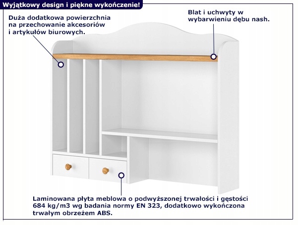 Надставка SO-04 — це предмет меблів, який дозволить вам перетворити свій стіл на елегантний секретер всього за кілька хвилин. Чудова надставка SO-04 від Lenart, завдяки додатковим полицям, відділенням і ящикам, дозволить вам ефективно сортувати аксесуари та демонструвати прикраси та прикраси. Чудове поєднання білих фасадів із вставками дуба Неш надає йому унікального характеру. Оформлена таким чином полиця ідеально підійде для інтер’єру в скандинавському, бохо, прованському або класичному стилях.