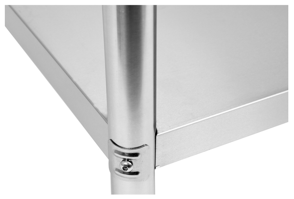 Центральний стіл із полицею виготовлено звисокоякісної нержавіючої сталі SS201, адаптованої для використання в гастрономії в умовах інтенсивного використання. Ретельно зроблені зварні з’єднання та гладкі поверхні дуже легко підтримувати в чистоті.
