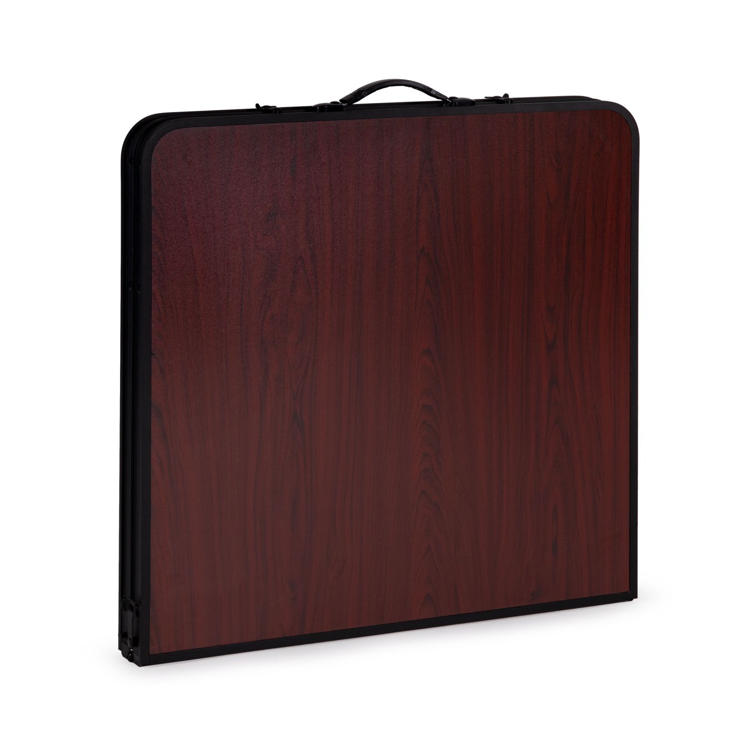 Стіл виготовлений з якісних матеріалів. Поєднання алюмінієвої каркасної конструкції зі стільницею з МДФ забезпечує міцність і стійкість столу. Перевагою є його мала вага, що забезпечує безпроблемне транспортування. Стіл легко розкладається, а в складеному вигляді набуває форму зручної валізи. Вбудована ручка полегшує перенесення. Додатковою функцією є можливість регулювання висоти.