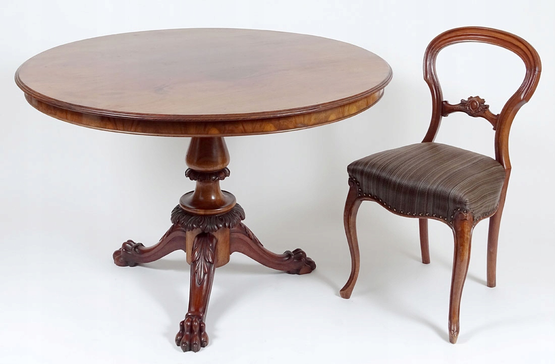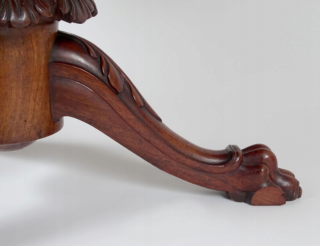 з круглою стільницею з витонченою скошеною смугою по всьому колу. Знизу під стільницею злегка заглиблена планка з червоним деревом. Спирався на точений конічний древок, прикрашений різьбленим листям, що переходить внизу в три масивні стійкі ніжки, які також були прикрашені різьбленням у вигляді листя та пташиних лап з кігтями.