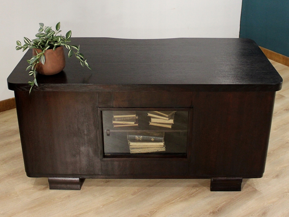 Темний простий письмовий стіл із вітриною з іншого боку.