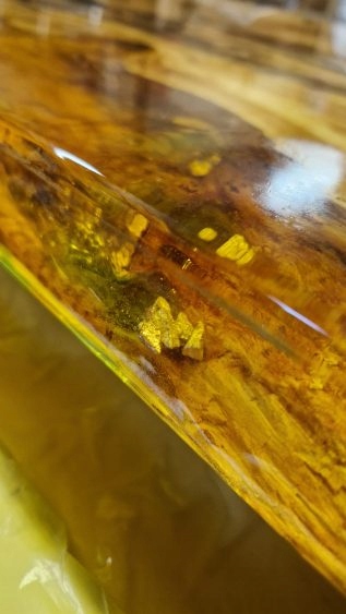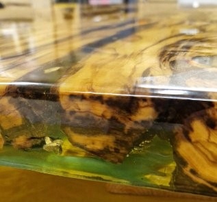 - Епоксидна смола: смола бурштинового кольору, впроваджена в поверхню, створює ефект глибини та блиску, нагадуючи капсулу природи, закриту в часі та просторі. Смола акуратно розливається, створюючи гладку, блискучу поверхню, яка підкреслює унікальні текстури деревини.