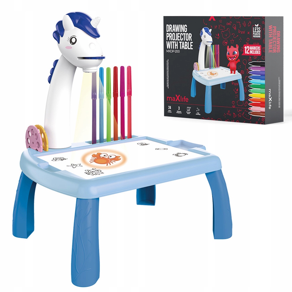 Проектор для малювання - ідеальний набір для кожного маленького художника. Набір складається з білої дошки з проектором, який відображає 24 різні візерунки на сухостираній дошці, що дозволяє дитині легко копіювати та малювати.