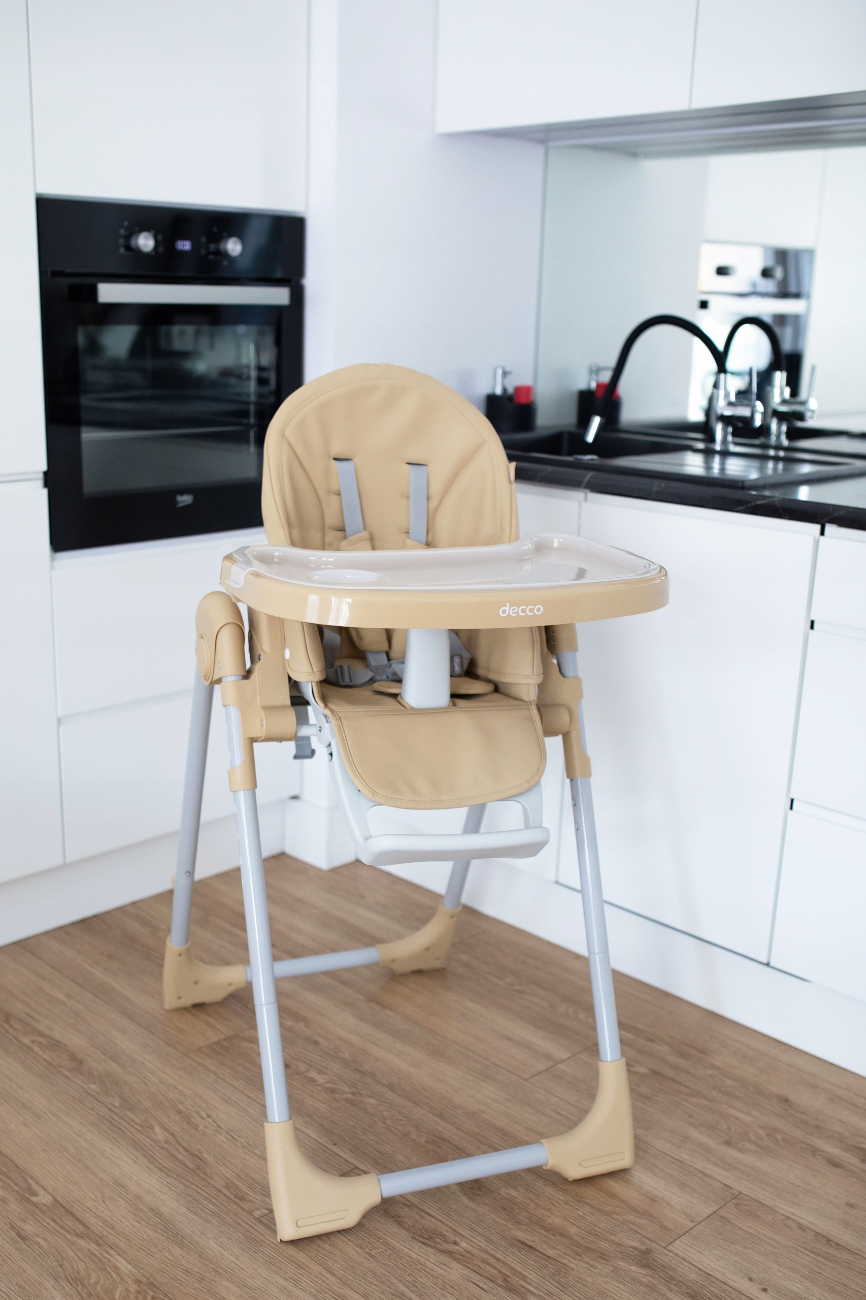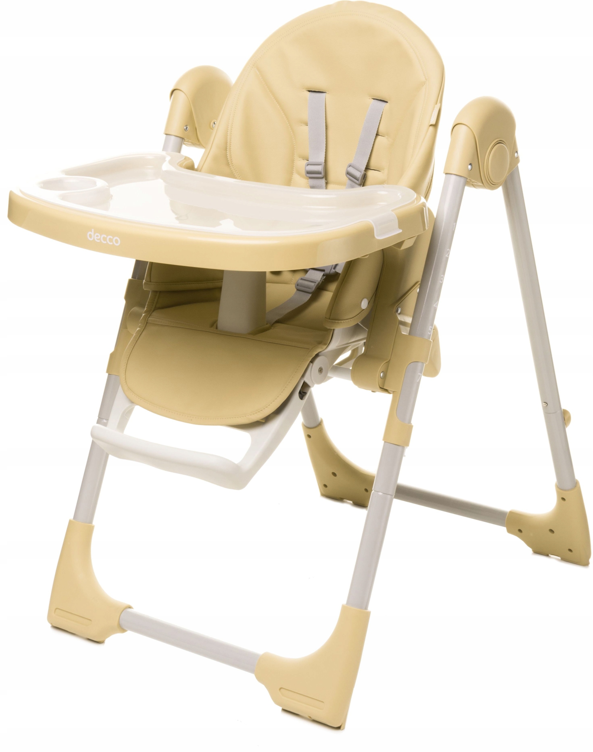 DECCO - це функціональний стільчик для годування в сучасному стилі в поєднанні з класичною елегантністю. М’яка оббивка з екошкіри забезпечує комфорт і легкість чищення, а практична кришка підносу з місцем для чашки або пляшки полегшує подачу та прибирання після їжі. Для безпеки дитини він оснащений п'ятиточковим ременем безпеки з плечовими чохлами і додатковим елементом, що запобігає вислизання дитини з крісла. Decco оснащений семиступінчастим регулюванням висоти, тому його можна розмістити на будь-якому столі. Спинка крісла має п'ятиступінчасте регулювання і розкладається до лежачого положення в поєднанні з триступеневим регулюванням підніжки, що дозволяє індивідуально налаштувати стілець відповідно до віку дитини. Вбудовані колеса в задні ніжки дозволяють легко пересувати, а легка і стійка конструкція і знімний піднос, прикріплений до ніжок стільця, дозволяють скласти стілець майже повністю. Стільчик для годування Decco рекомендований для дітей з максимальною масою тіла 15 кг і віком від 6 до 36 місяців.