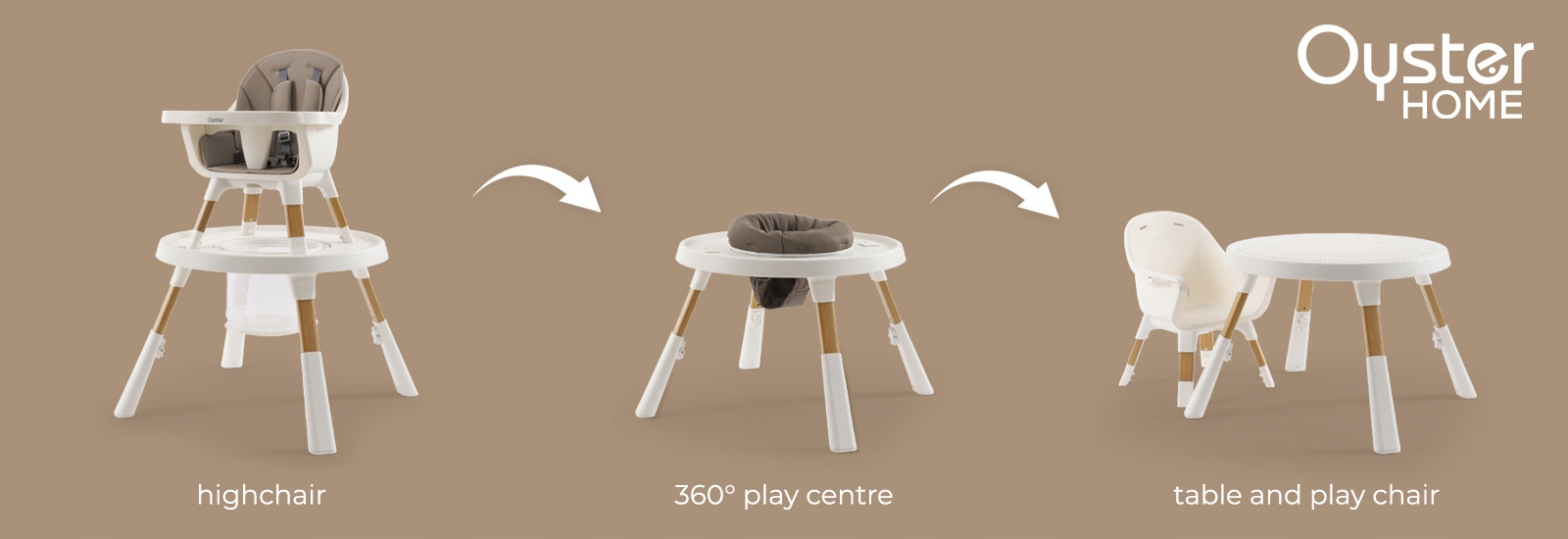 Стільчик для годування Oyster 4 в 1 містить сітчастий кошик для зберігання іграшок, який легко знімається. Додатковою перевагою є можливість перетворити крісло на ігровий центр, який обертається на 360°. Завдяки виключно м'яким тканинам вашій дитині буде комфортно гратися та працювати над розвитком моторики та когнітивних здібностей. У міру зростання дитини стільчик може трансформуватися в самостійний стіл і ігровий стілець.