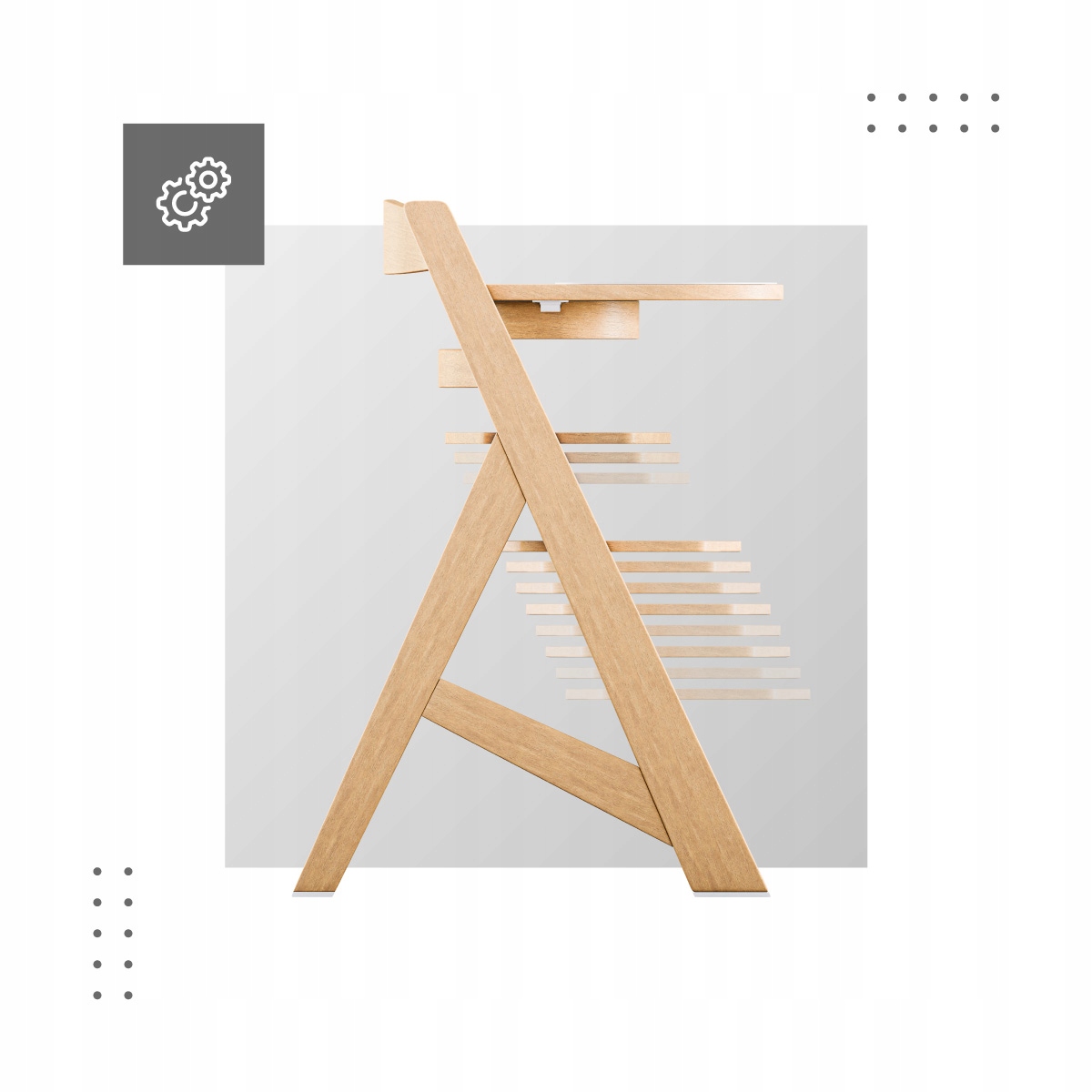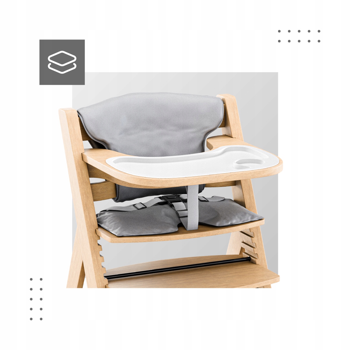 - Функціональність стільчика для годування збільшена на знімний лоток з пластиковою кришкою штучний. Це рішення є гігієнічним і запобігає знебарвленню, яке може з’явитися на дерев’яних лотках.