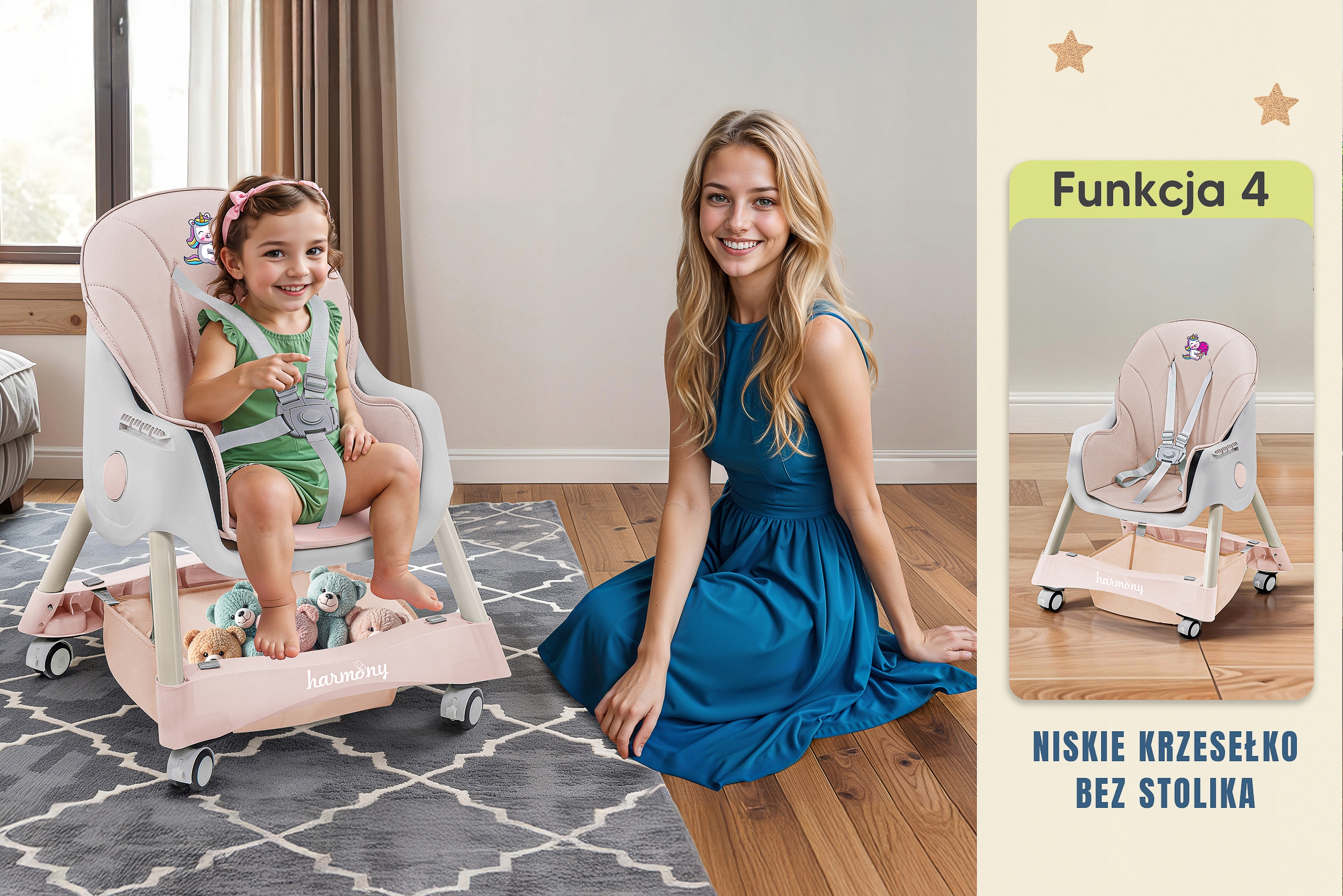 Стільчик для годування HARMONY CINNAMON 4в1. Бути батьком - це щоденний виклик, тому ми створили стільчик для годування HARMONY CINNAMONEK, який полегшить вам догляд за дитиною. Це інноваційне багатофункціональне крісло 4 в 1 росте разом з вашою дитиною та адаптується до її мінливих потреб. Завдяки чотирьом режимам використання - від високого стільчика з підносом до низького, окремо стоячого стільця - повсякденні справи стають простішими та менш трудомісткими. HARMONY CINNAMON стане вашою надійною підтримкою на кожному етапі розвитку вашої дитини.