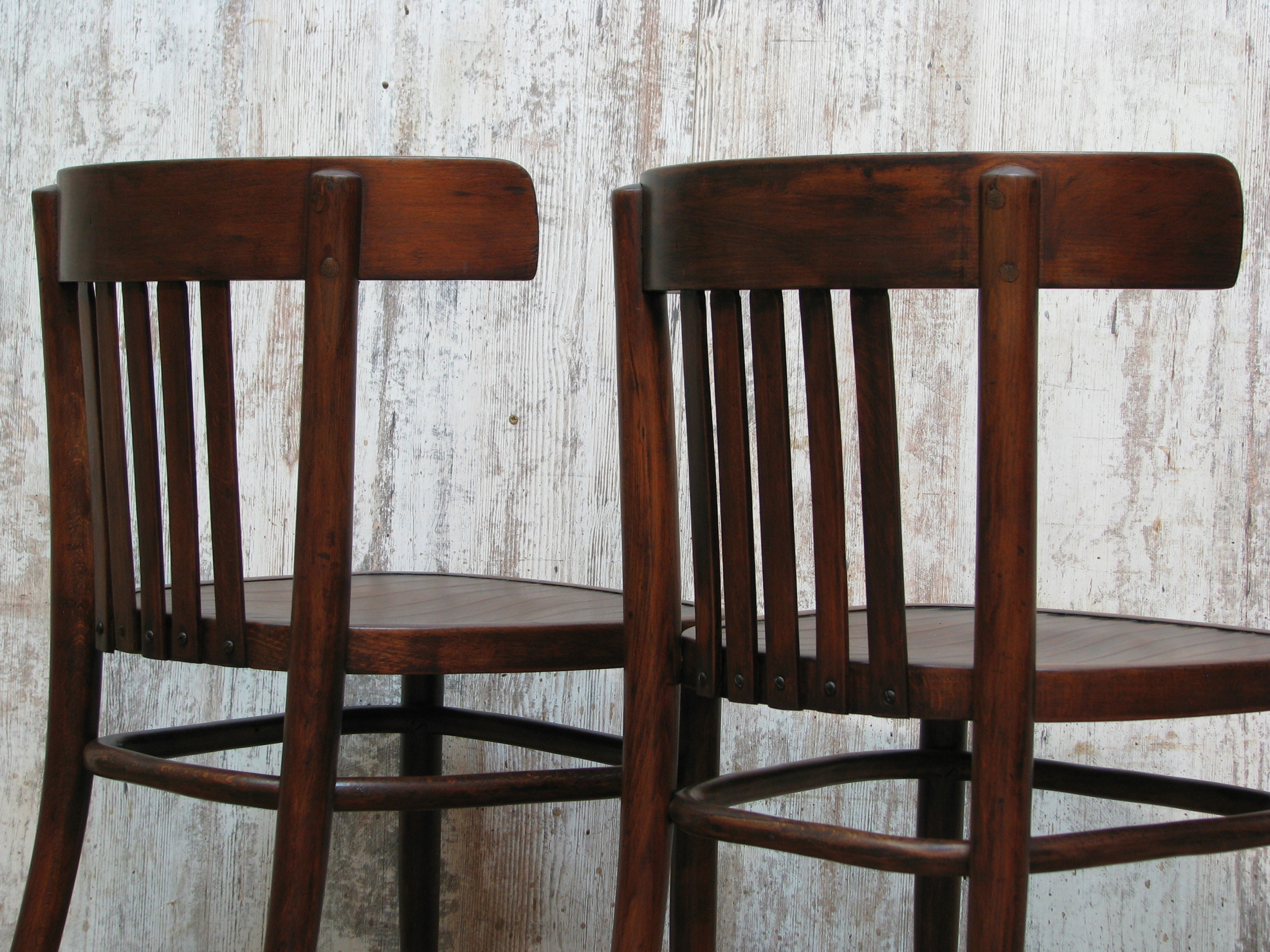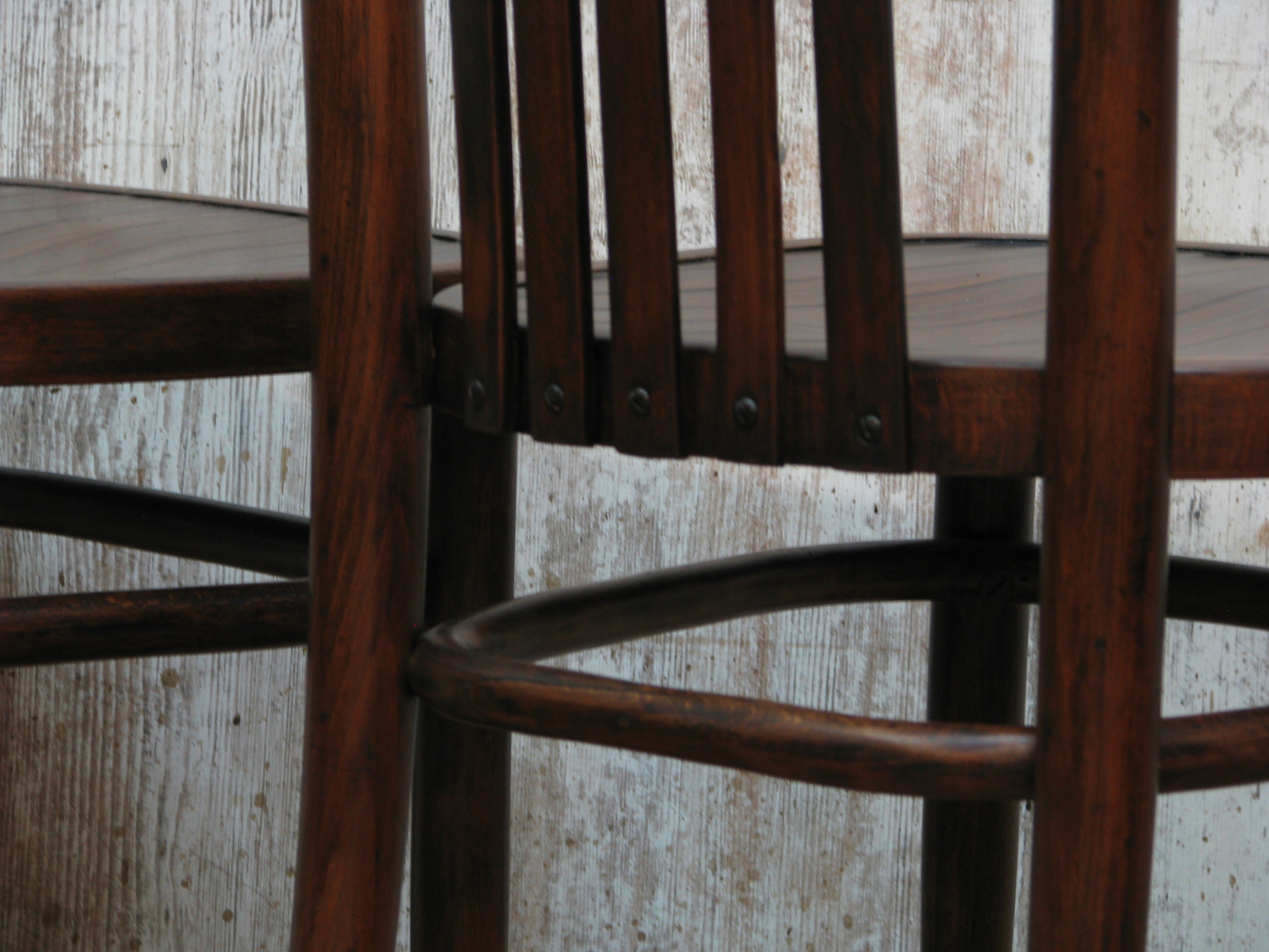 Видається оригінальна красива текстура старого дерева, меблі виготовлені з масиву бука, видно рифлені сидіння. Стільці виготовлені на фабриці Thonet в Radomsko, каталожний номер 788.