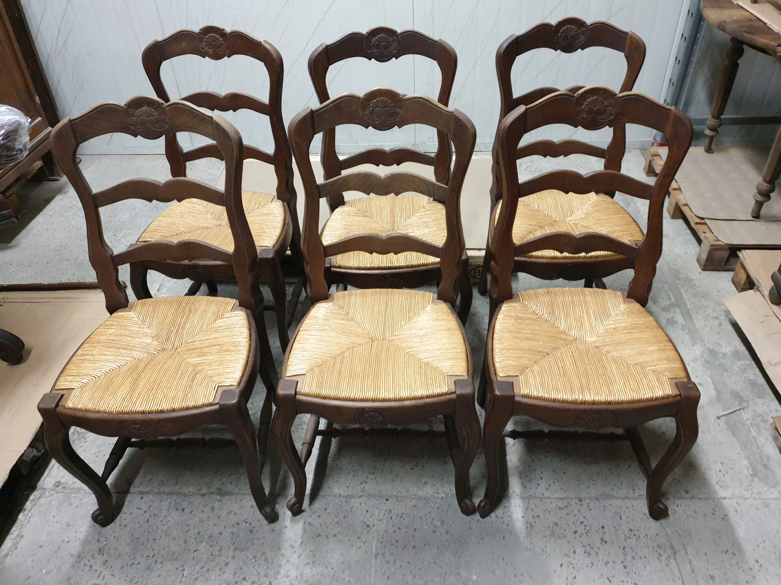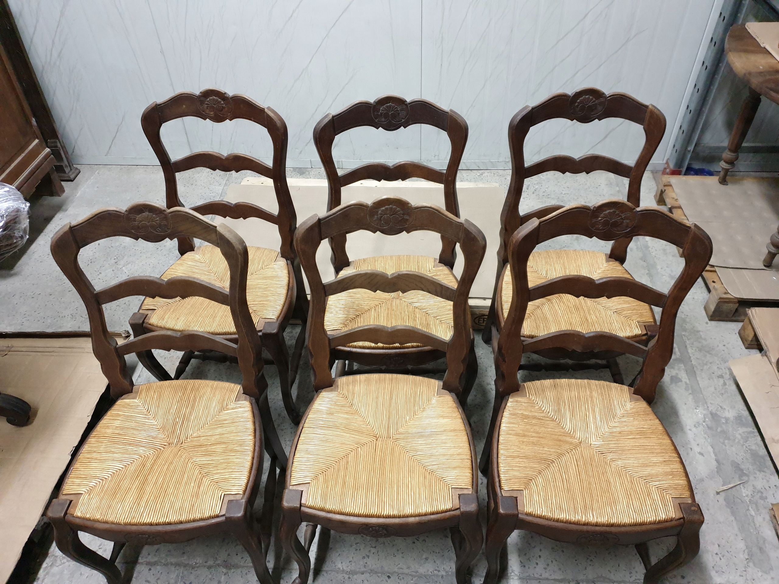 Предметом аукціону є красиві стільці з сидіннями з морської трави, декоровані, на стійких ніжках, з різьбленими спинками, з мотивом мушлі святого. Jakub. В наявності 4 штуки.