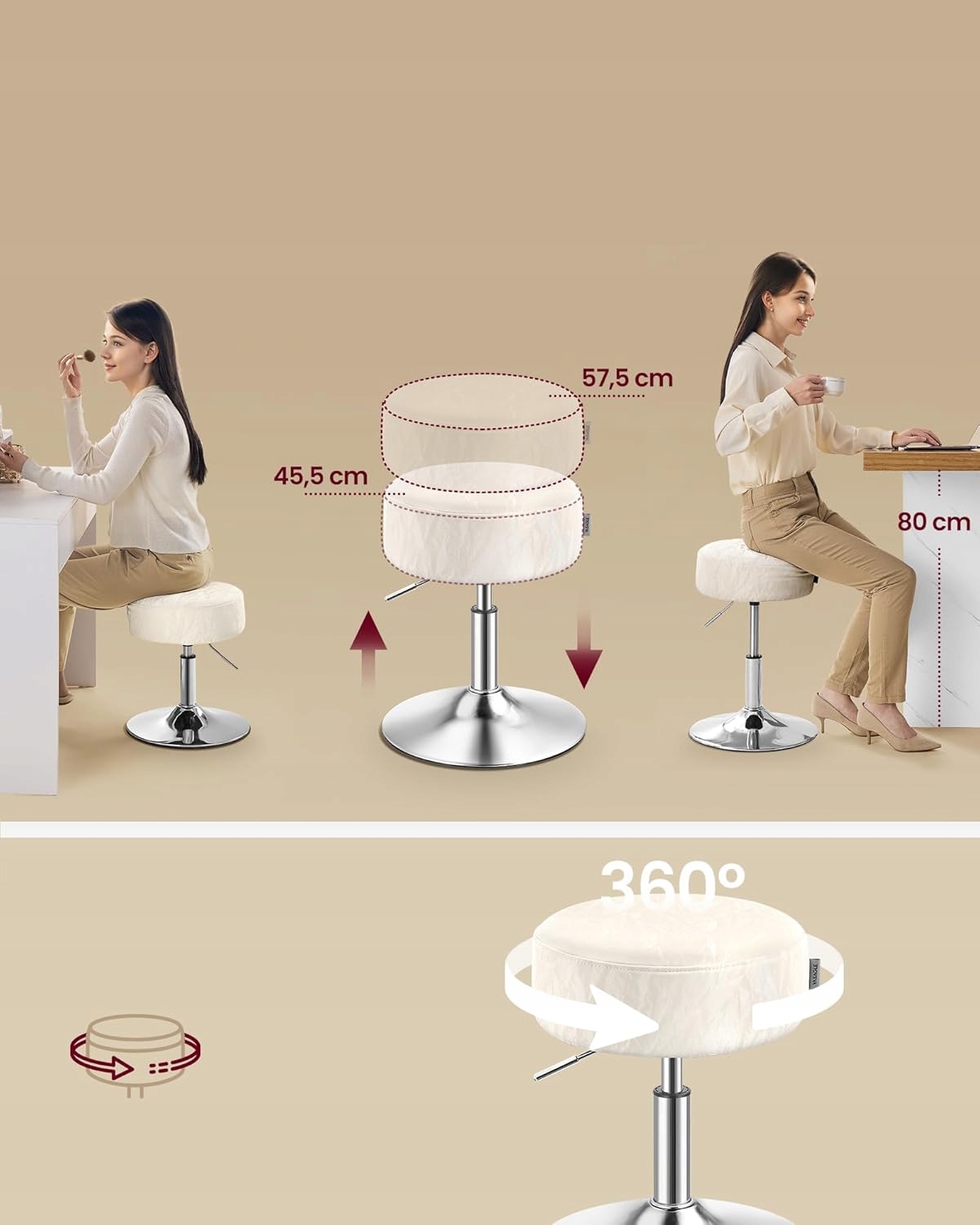 p> коригування та стабільної роботи: Ви можете обертати 3600000, що регулюється та стабільно: Ви можете обертати 3600000, що регулюється та стабільно: ви> ви можете обертатися: в діапазоні 45,5 - 57,5 см, залежно від ваших потреб. Кругла основа діаметром 38,5 см гарантує високу стабільність та безпеку при скрученні.Легко очистити: Поверхня ПУ є водонепроникною та легкою для обслуговування. Не хвилюйтеся, якщо ви щось розсипаєте, просто вдячні його хусткою