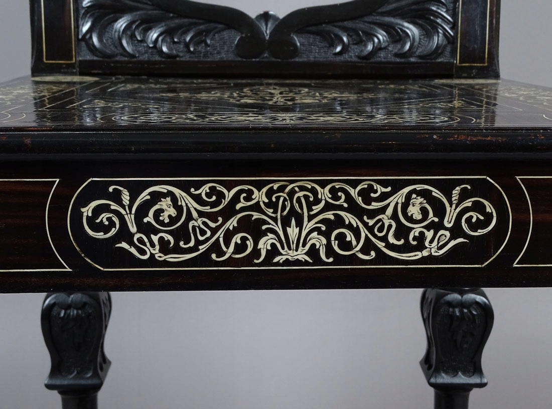 з прямим сидінням і нахиленою назад спинкою, що підтримується чотирма точеними і різьбленими ніжками, що закінчуються сплощеним м'яч ногою. Вся конструкція багато прикрашена кісткою, із зображенням інкрустації вусиків рослин, пегасів, голов драконів і бюстів жінок з крилами на спинці в чотирьох полях по периметру. По центру в круглому полі – чашечка квітки та маскарони. Зверху дві спинки, а на сидінні чотири кістки із зображенням Діани, коня та сови. Саме сидіння також багато інкрустовано кістками, переплетеними гілочками та квітами, вазою та візерунками, ідентичними тим, що на спинці. Подібні прикраси на точених і різьблених ніжках, з'єднаних Н-подібним з'єднанням. Додатково злегка нахилена спинка з різьбленням квітів і тонкої раковини в кінці.