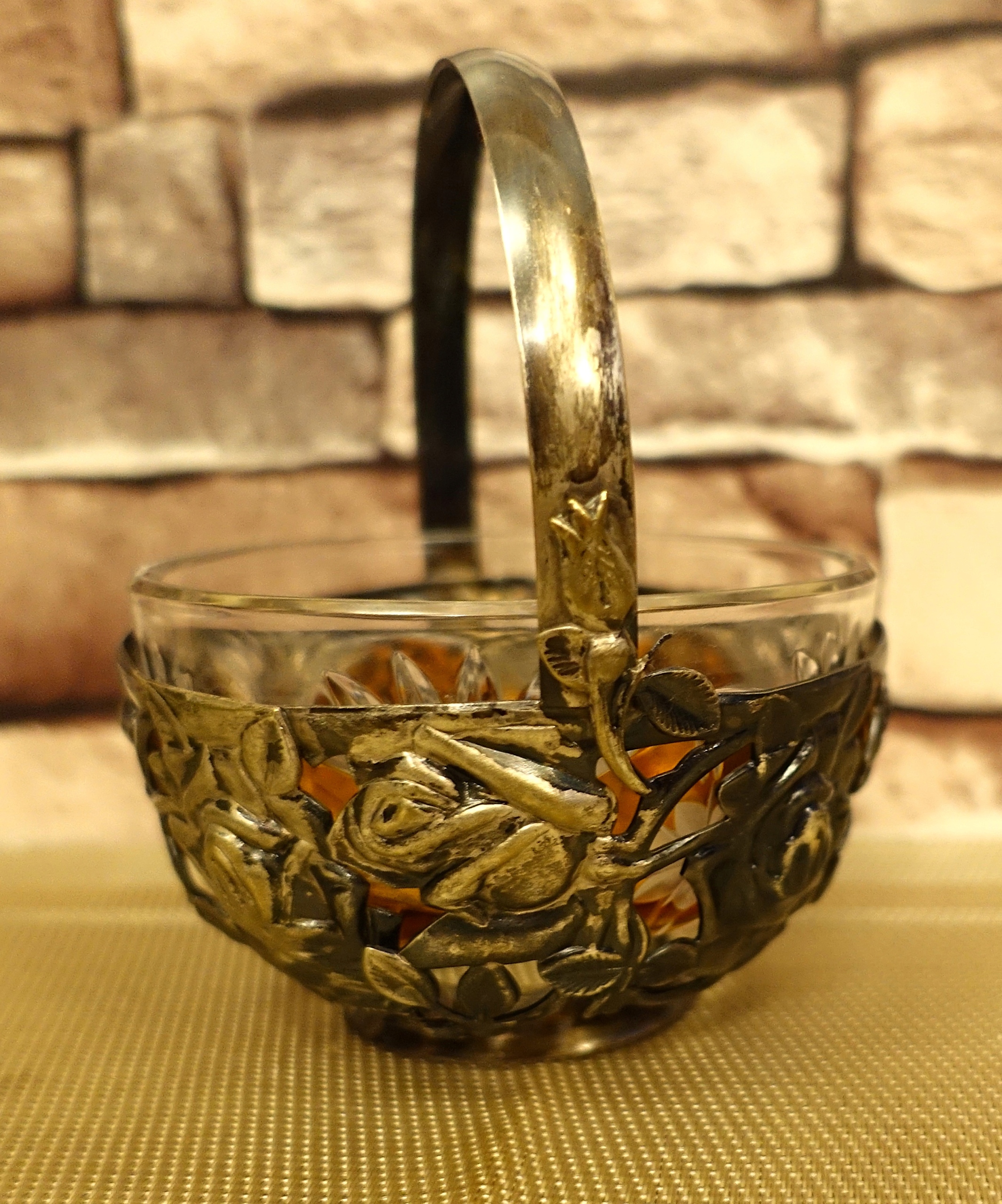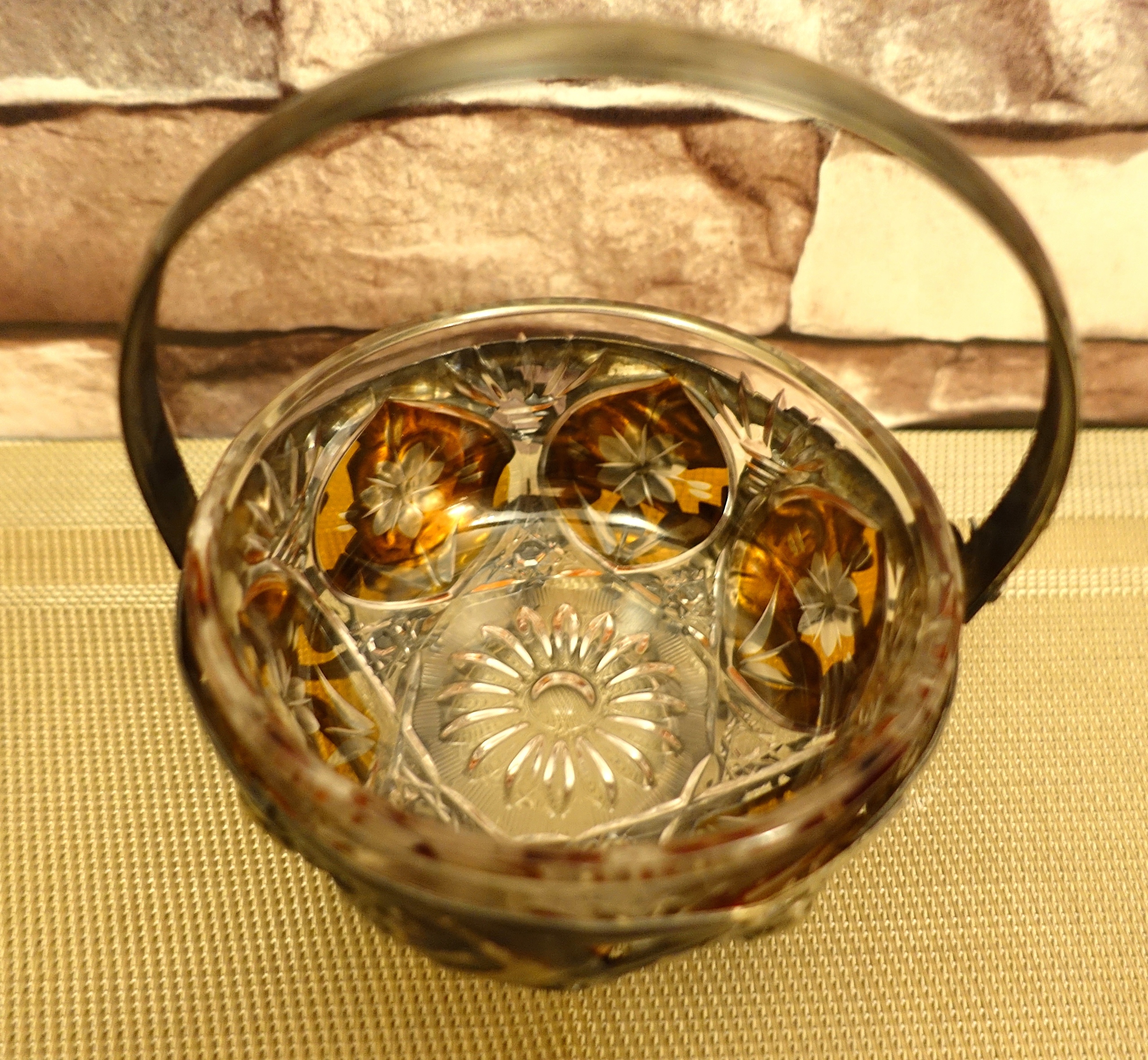 Чарівна цукерниця 1970-х і 1980-х років, виготовлена з кольорового кришталю в декоративному металевому каркасі з рослинними мотивами. Прекрасний приклад ретро-стилю, який поєднує в собі елегантність і функціональність.