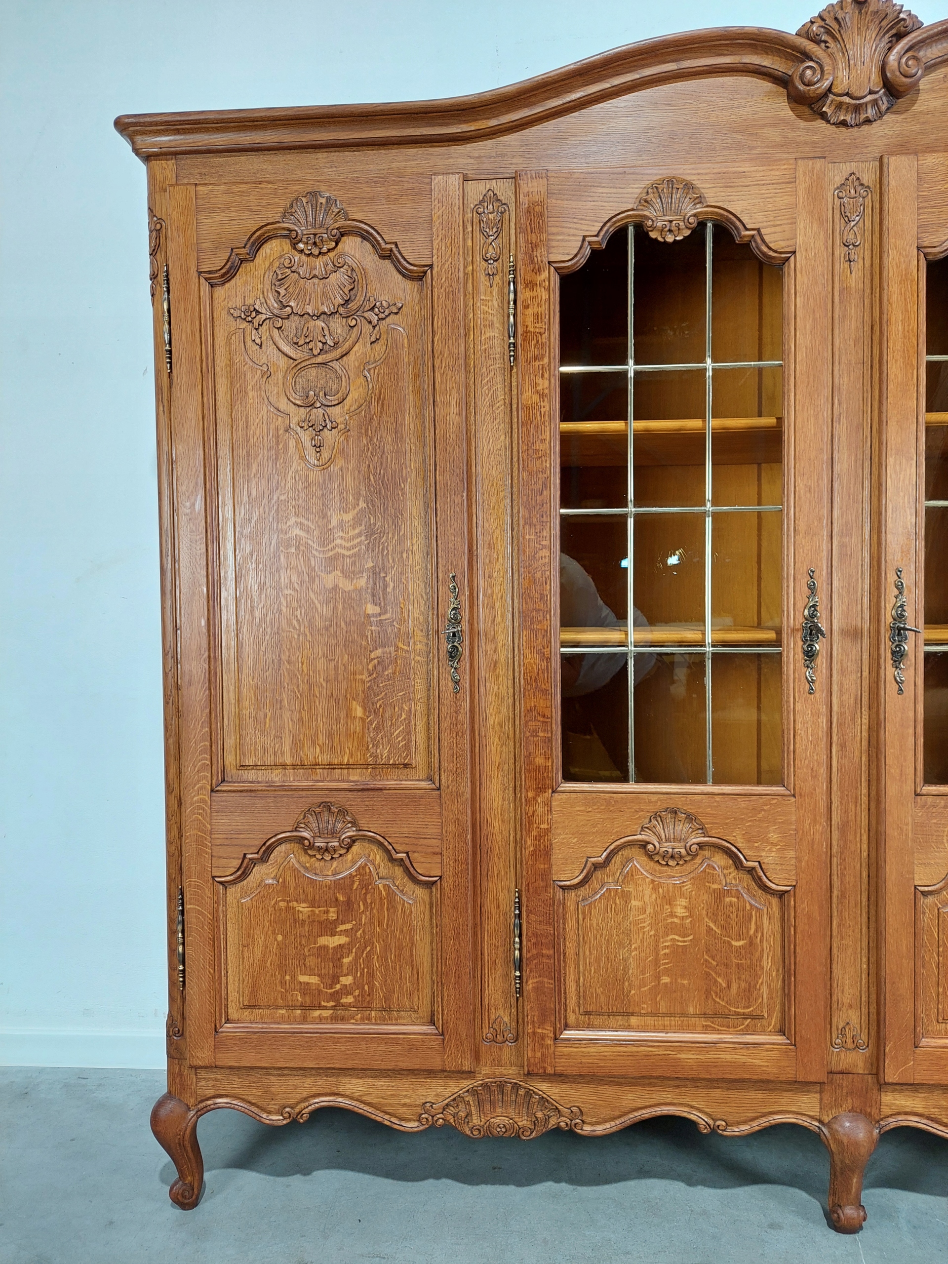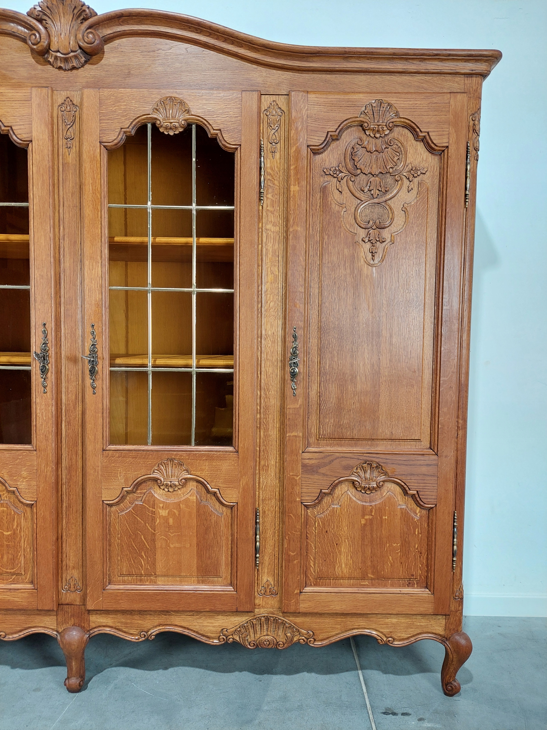 Стильна дубова чотирьохдверна бібліотека Людвіка в класичному вигляді, привезена з Франції, замки в робочому стані, чотири ключа. Меблі можна використовувати як бібліотеку, а також як сервант, тому що всі полиці виготовлені з масиву дуба. Кожну полицю можна вільно регулювати. Скло в дверях медового кольору, вітраж. Невелике заглиблення в підлозі (середня частина). Меблі поставляються елементами (проста збірка за допомогою 6 гвинтів) Детальні фотографії нижче