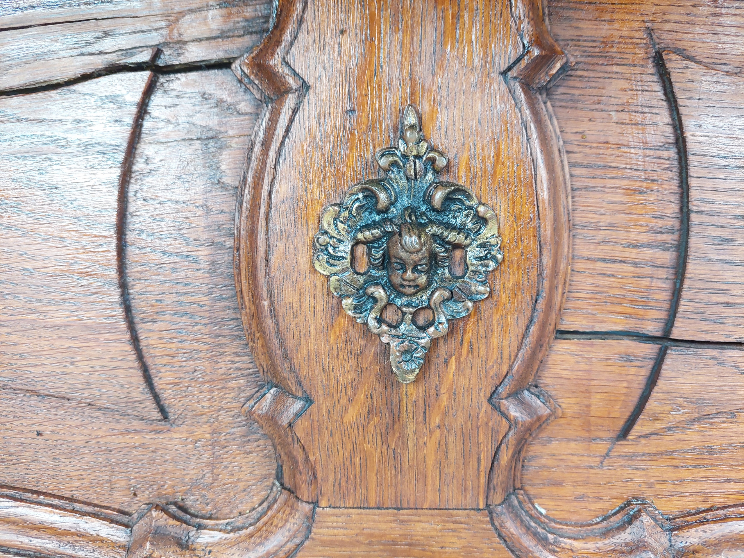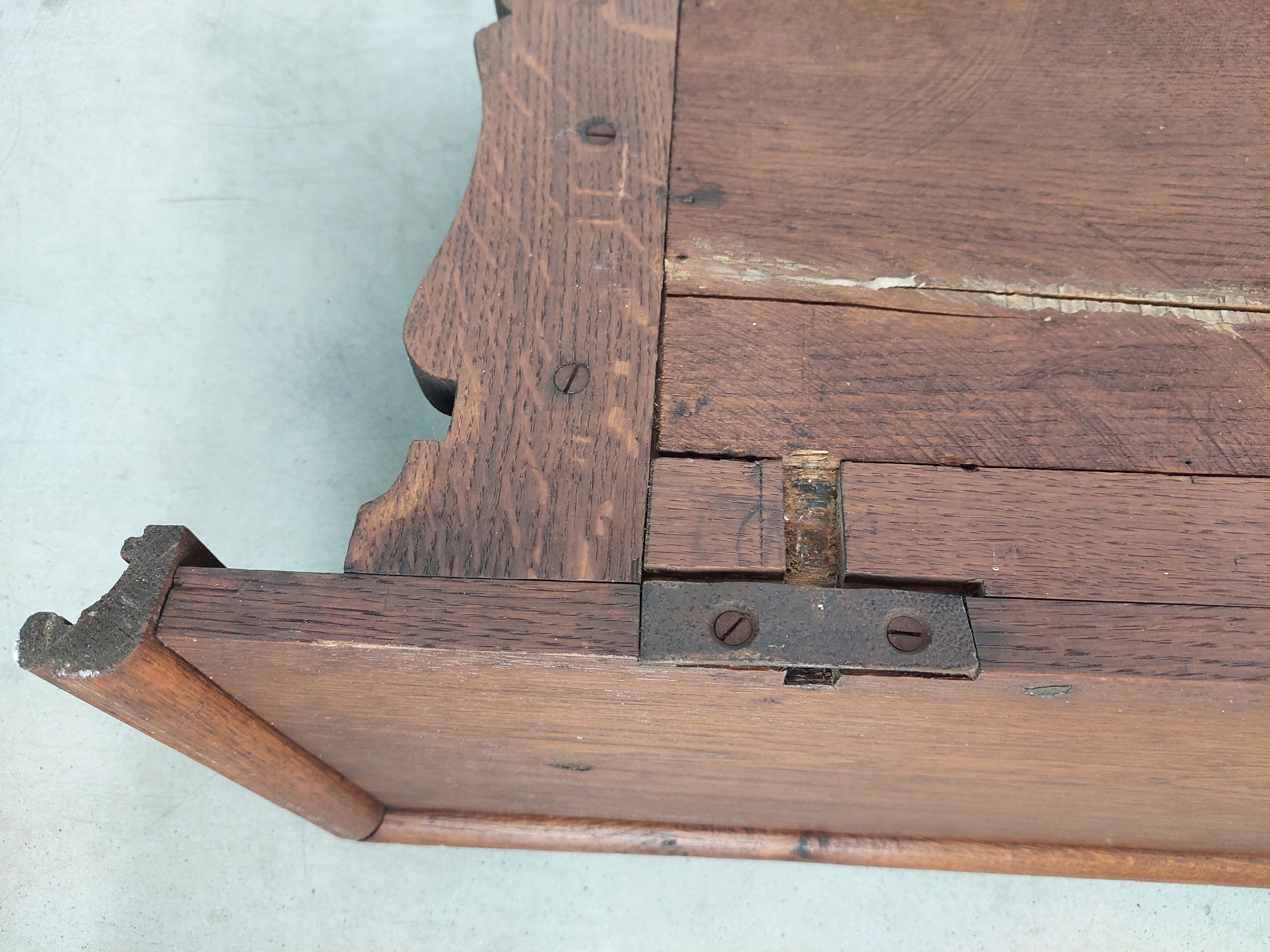 Стильна стародавня дубова настінна вішалка з полицею, масивна, виготовлена з твердого дуба з прекрасним дерев’яним деревом. Привезено з Франції, десять латунних гачків. Видимі корисні позначки, такі як розпад знебарвлення через вік. Деталі показані на малюнках.