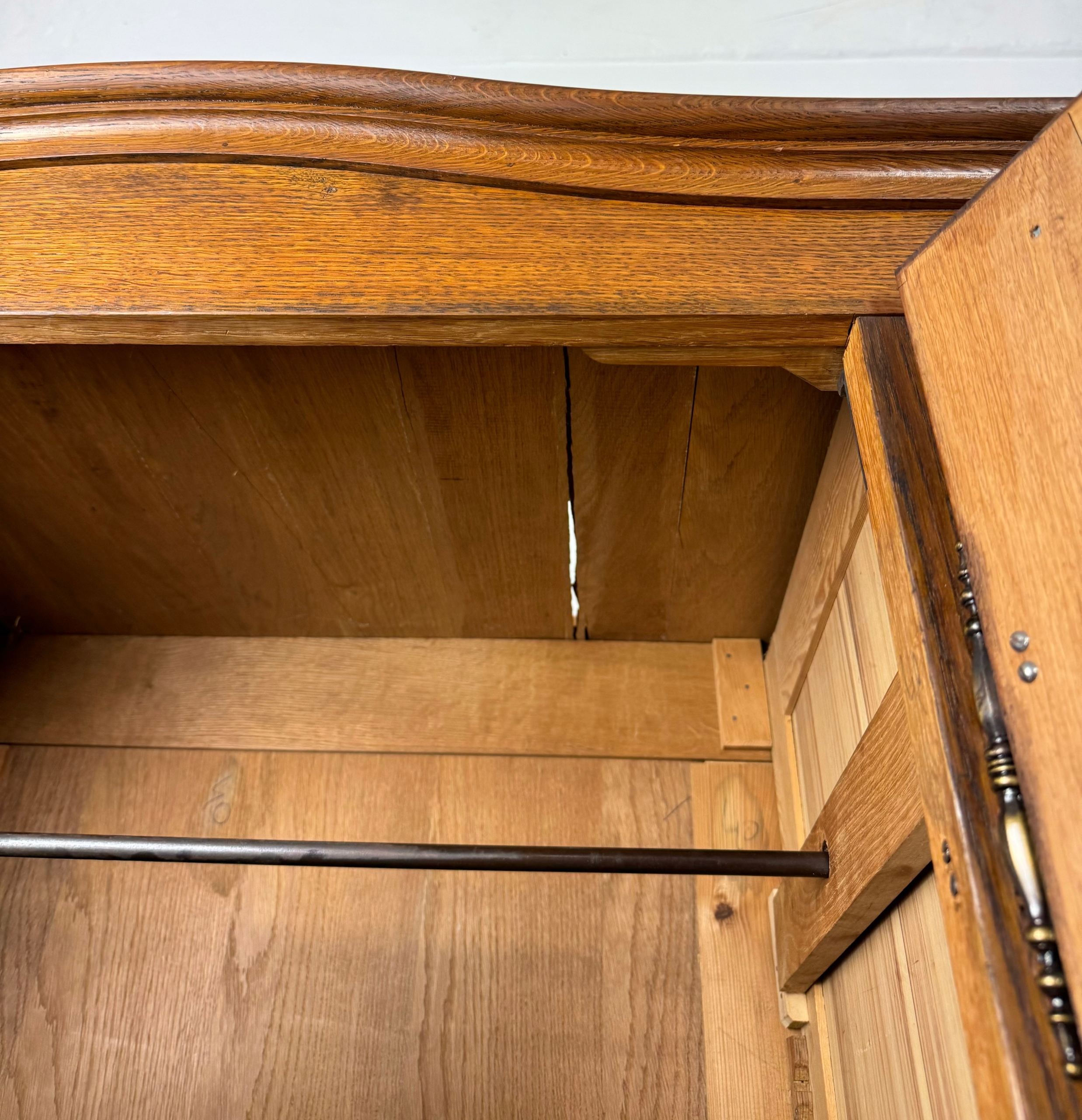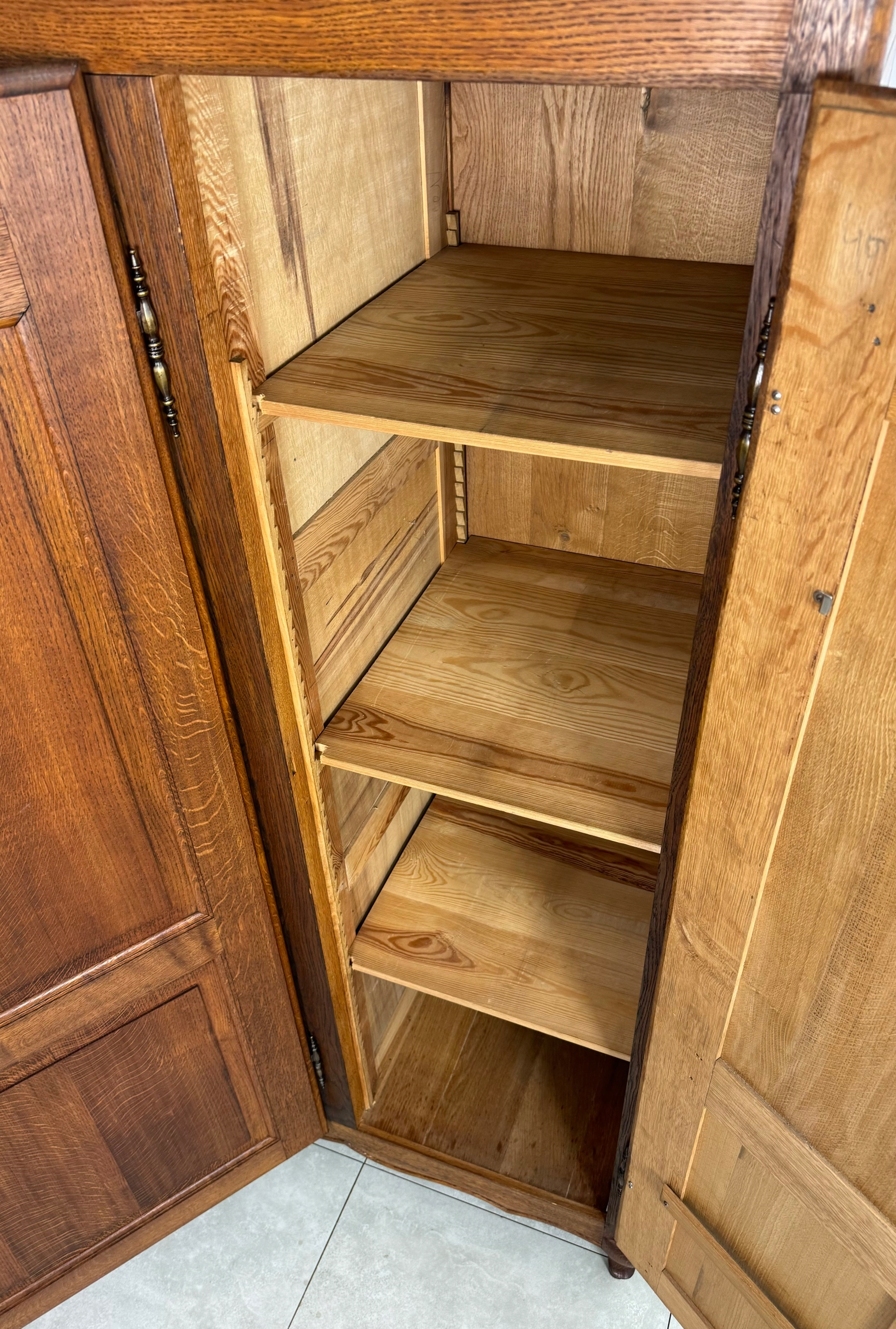 Всередині шафи є ручка і стійка з трьома регульованими по висоті дубовими полицями.