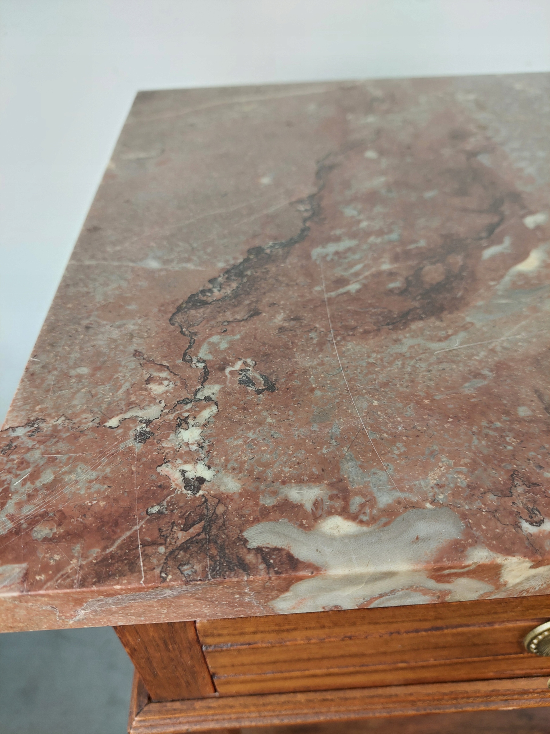 Стильна, еклектична тумбочка, виготовлена з дуба, з мармуровою стільницею. Через свій вік на меблях можуть бути сліди ремонту та використання (орієнтовний вік від 80 до 100 років). Стільниця міцно закріплена, з видимими дрібними подряпинами. Деталі показано на фотографіях нижче.