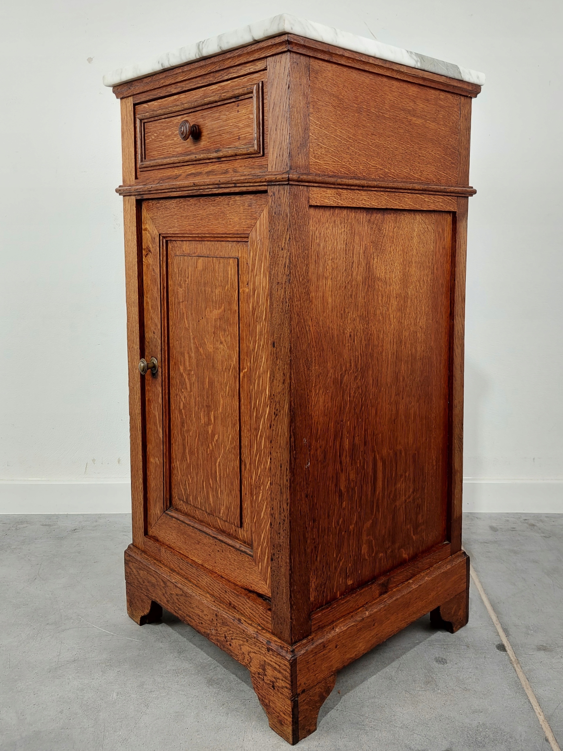 Стильна тумбочка еклектика, унікальна, рідкісна модель, виготовлена з дуба, з мармуровою стільницею. Через вік на меблях можуть бути сліди ремонту та використання, на дверях можуть бути відколи, але це не впливає на їх використання (вік оцінюється від 80 до 100 років). Стільниця стаціонарна, камінь в хорошому стані, без тріщин, окремих подряпин та потертостей. Деталі показано на фотографіях нижче.