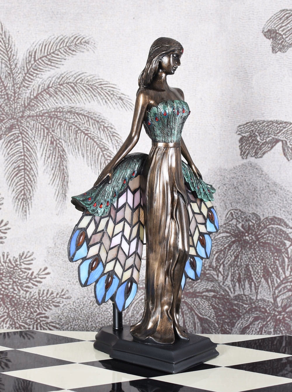 Вдячна скульптура жінки та світильник у стилі Тіффані.