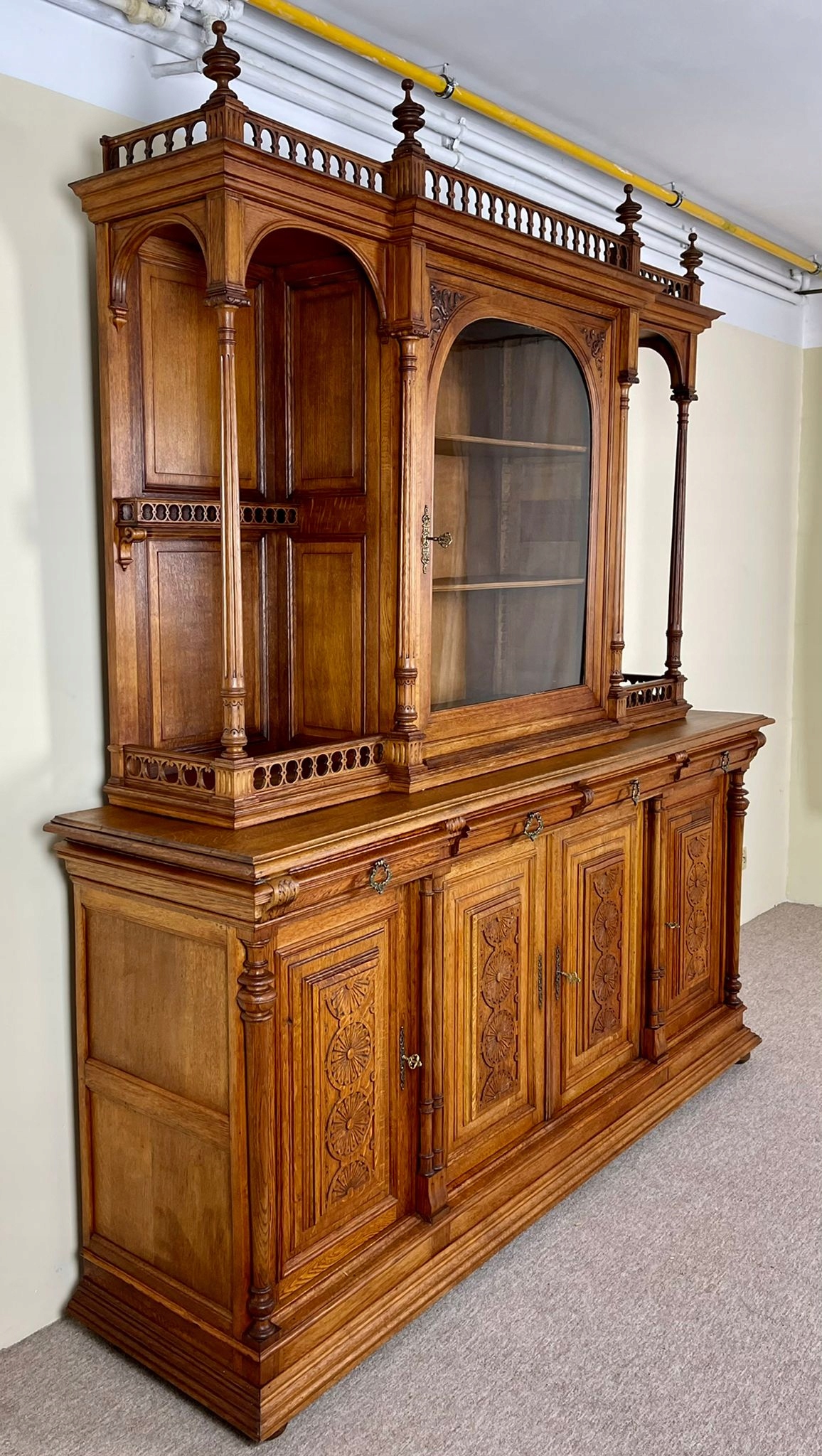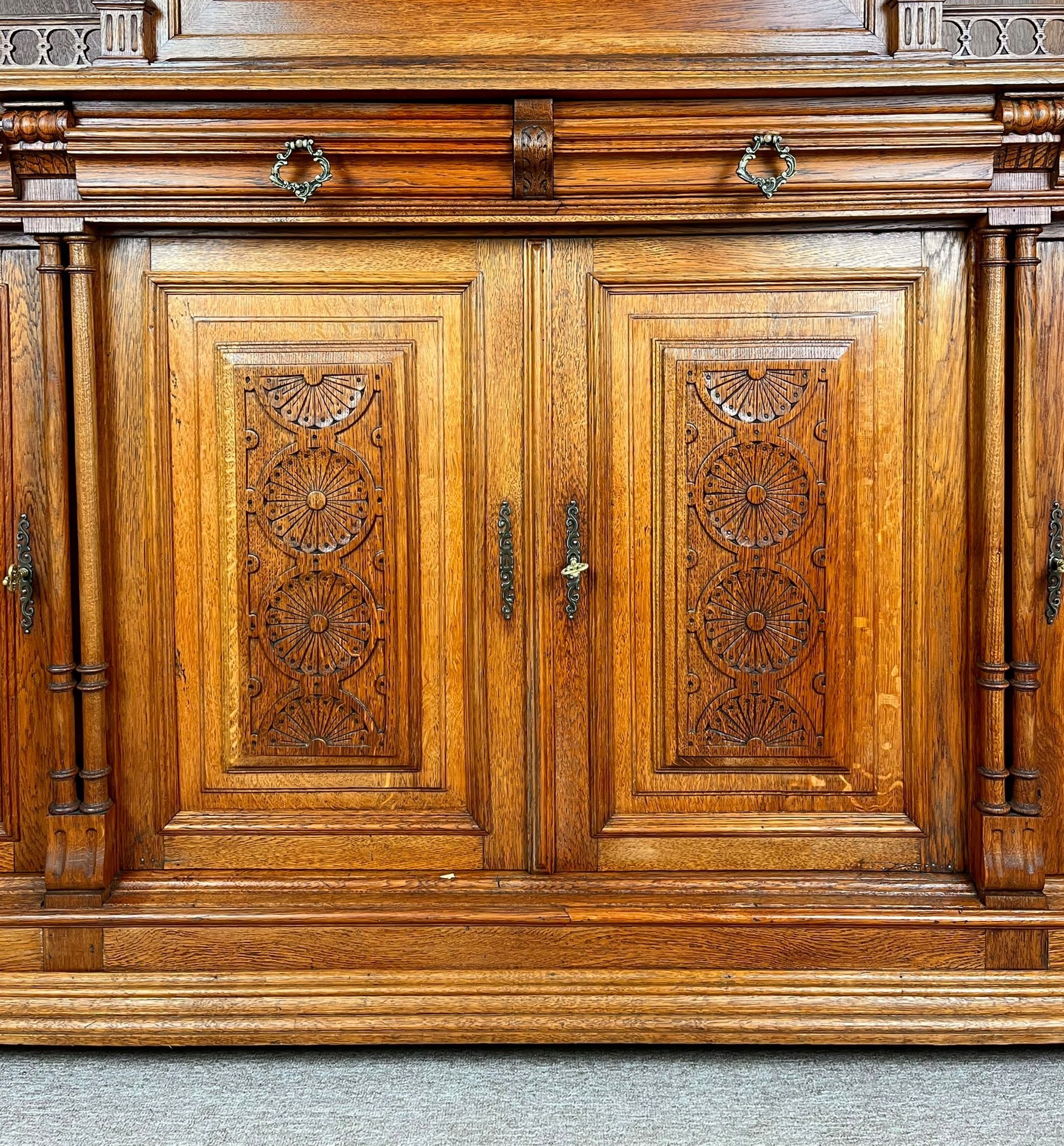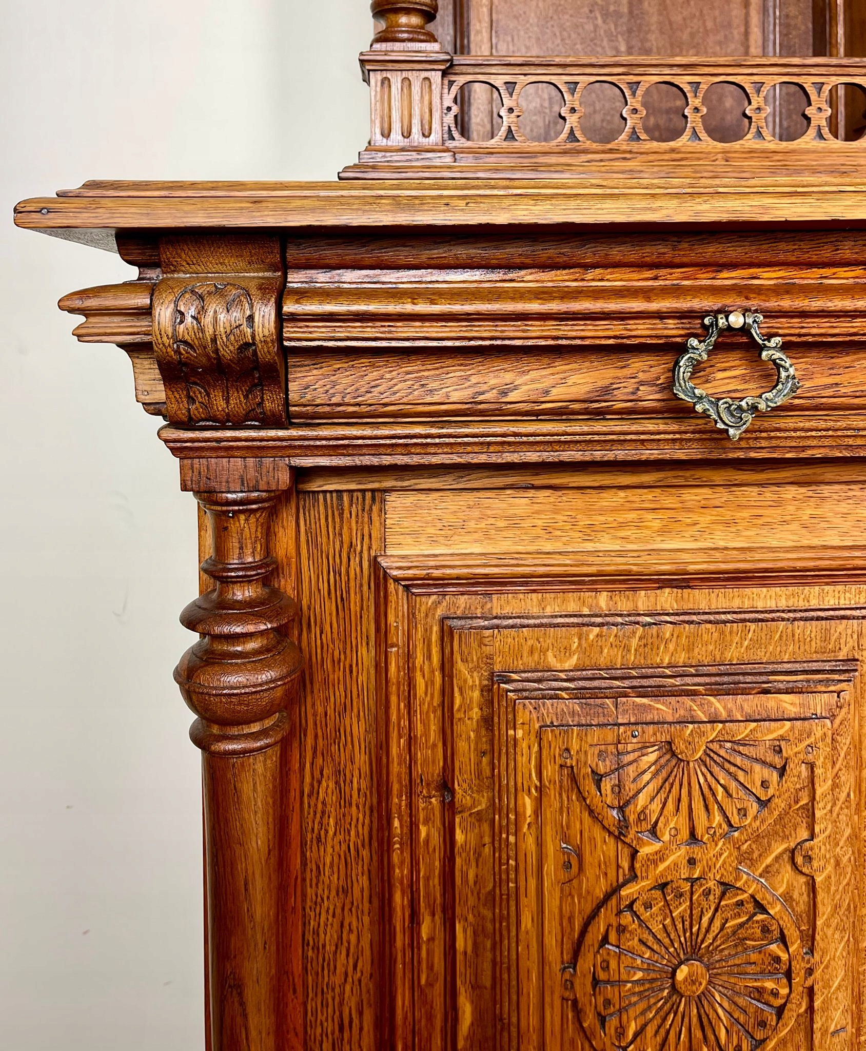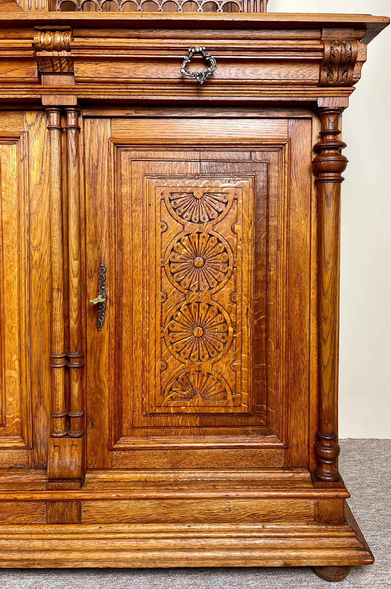 Красива, стильна тумба в стилі неоренесанс з масиву дуба. Він був виготовлений у Франції приблизно в 1900 році. Він прикрашений численним різьбленням, водяними знаками і численними колонами, що характеризують красу минулих епох. Меблі зберегли всі оригінальні покриття та знаходяться в дуже хорошому стані. Оригінальне рулонне скло. У серванті є всі ключі. Деталі на фото.