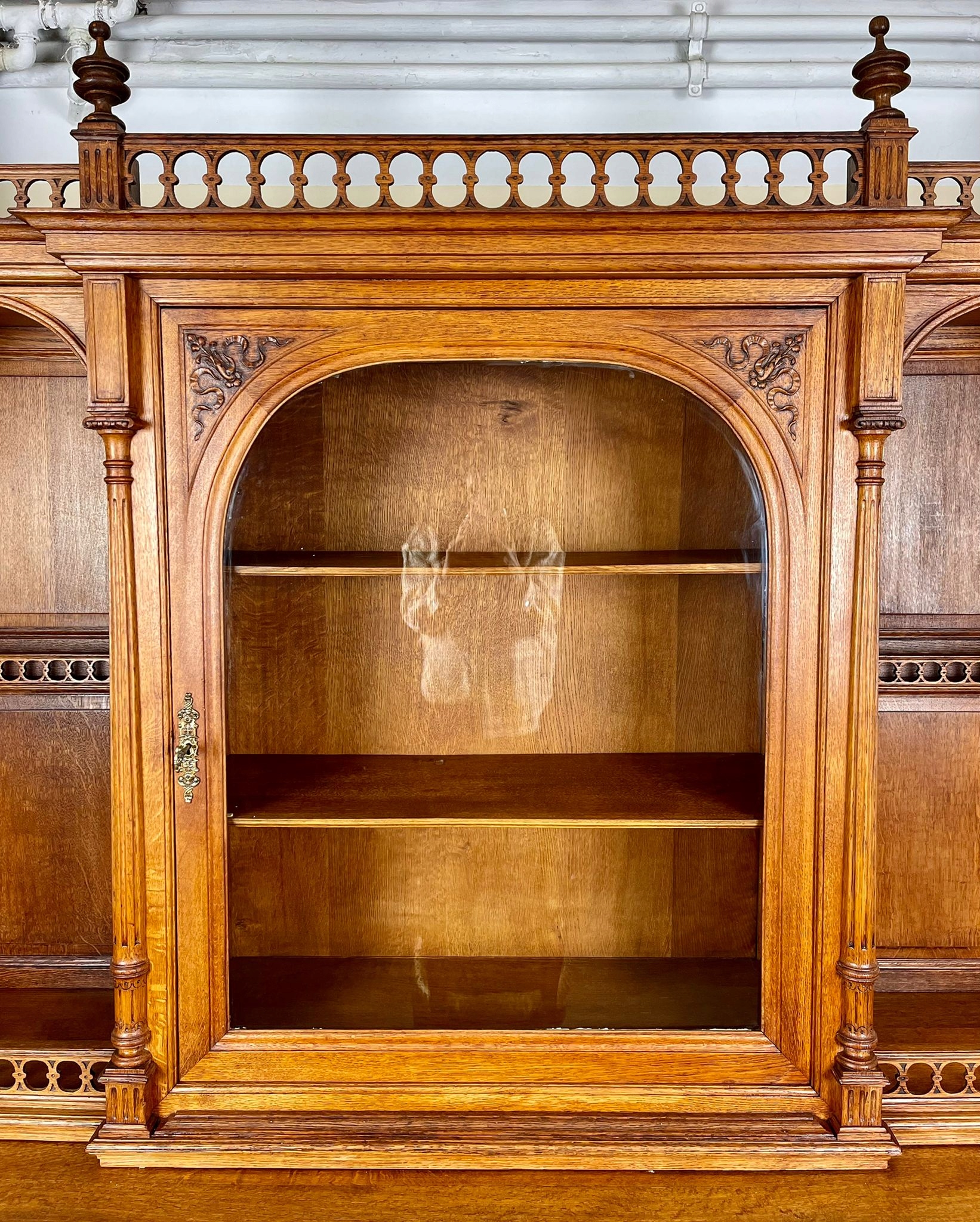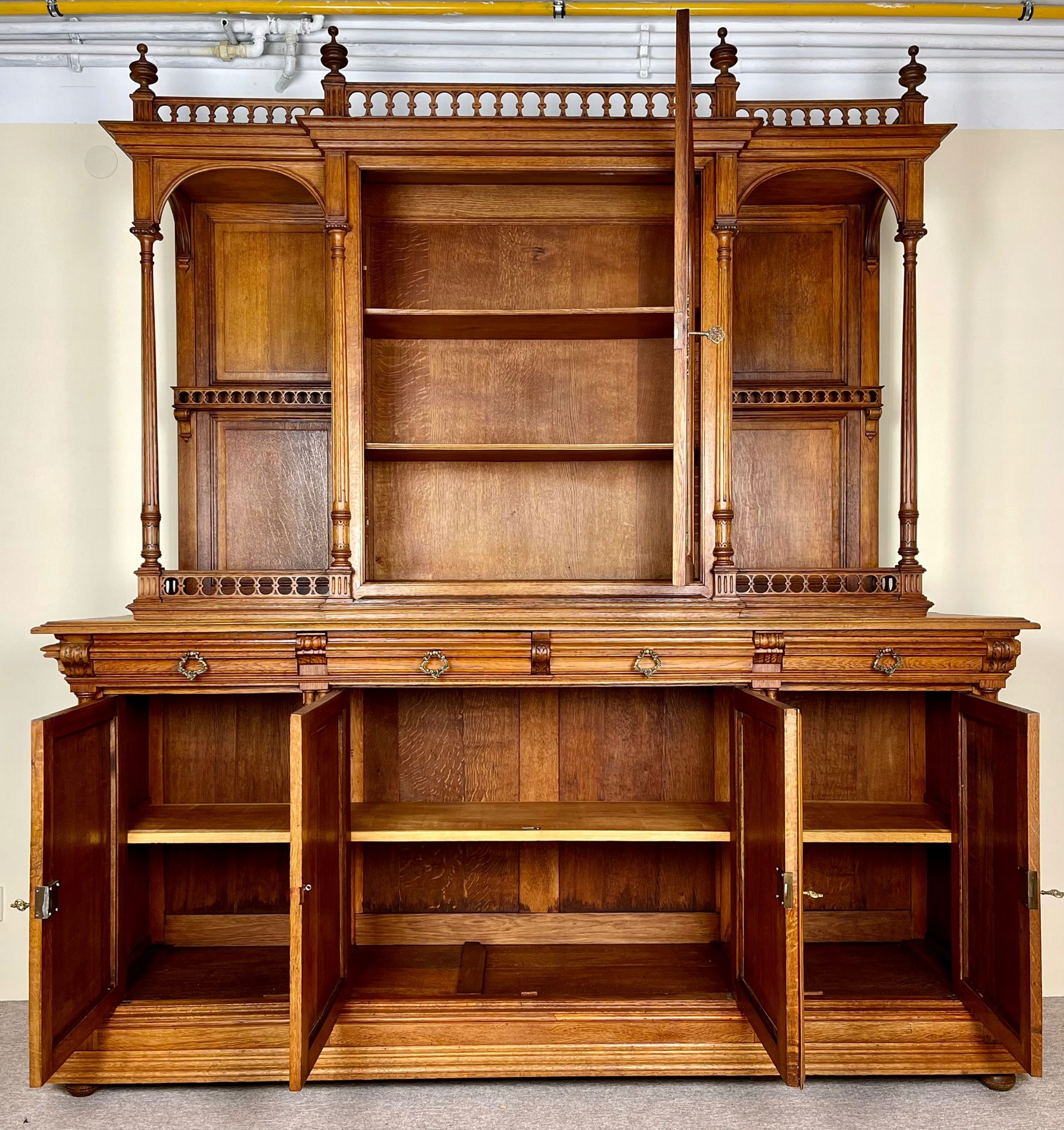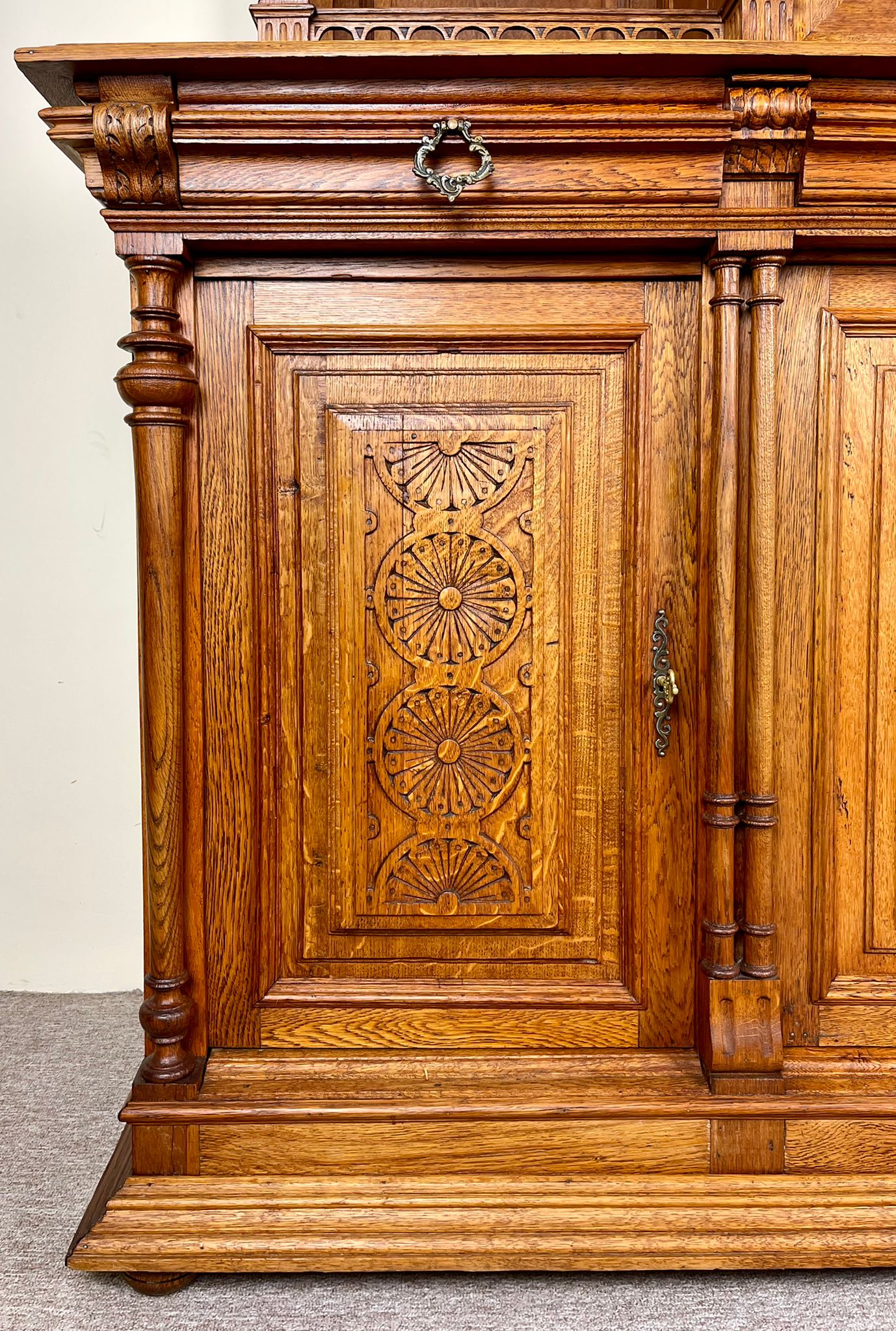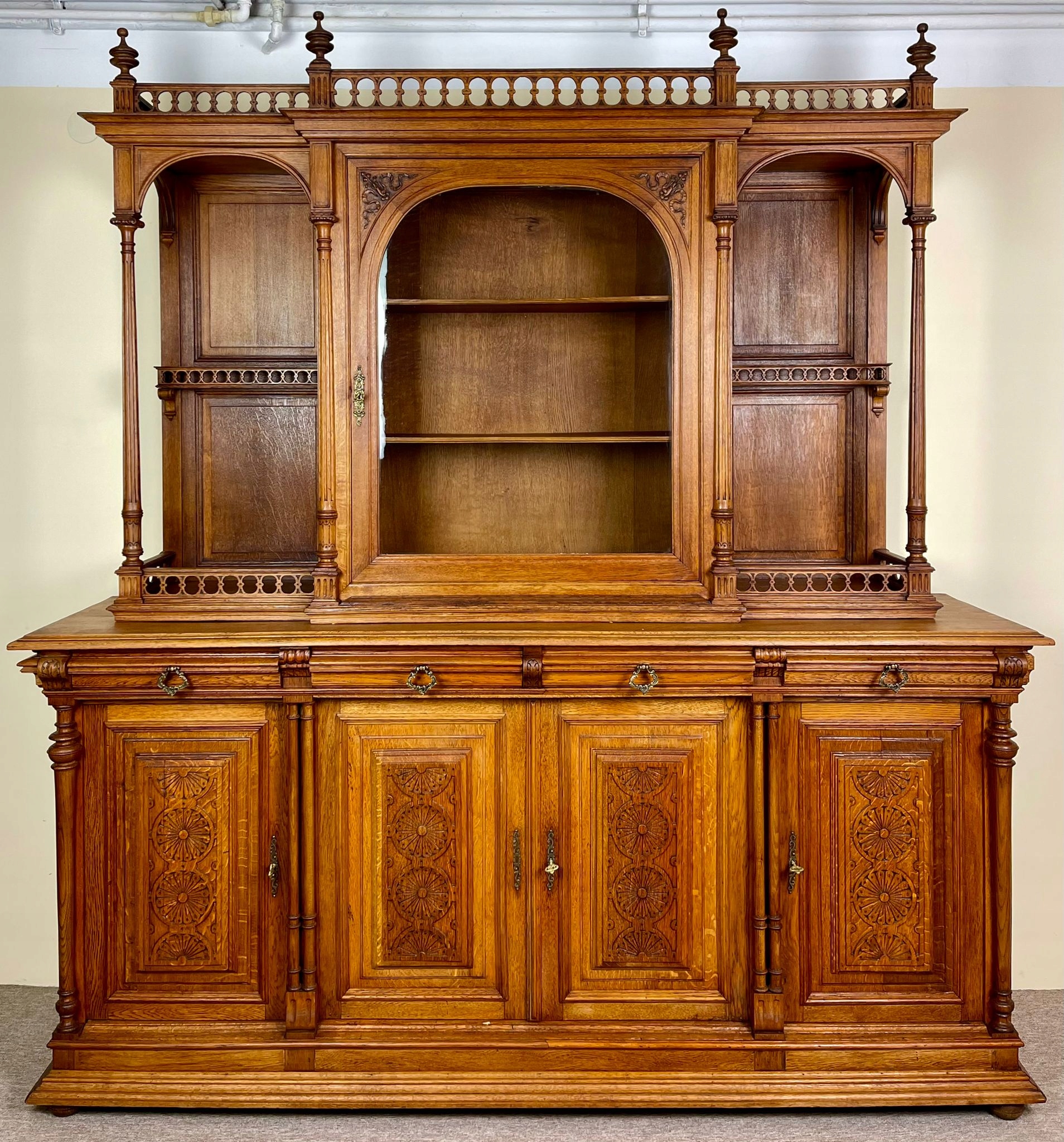 Красива, стильна тумба в стилі неоренесанс з масиву дуба. Він був виготовлений у Франції приблизно в 1900 році. Він прикрашений численним різьбленням, водяними знаками і численними колонами, що характеризують красу минулих епох. Меблі зберегли всі оригінальні покриття та знаходяться в дуже хорошому стані. Оригінальне рулонне скло. У серванті є всі ключі. Деталі на фото.