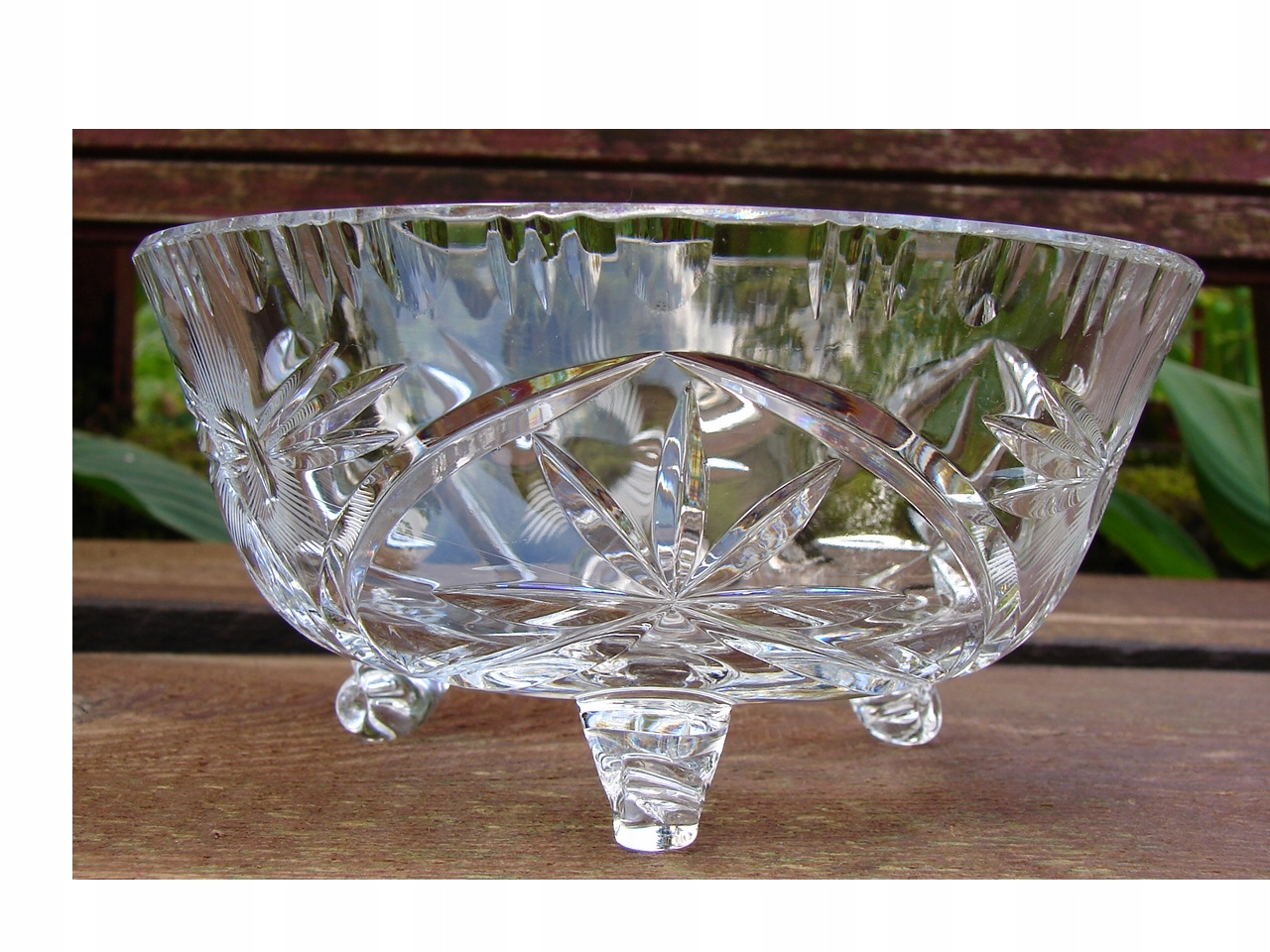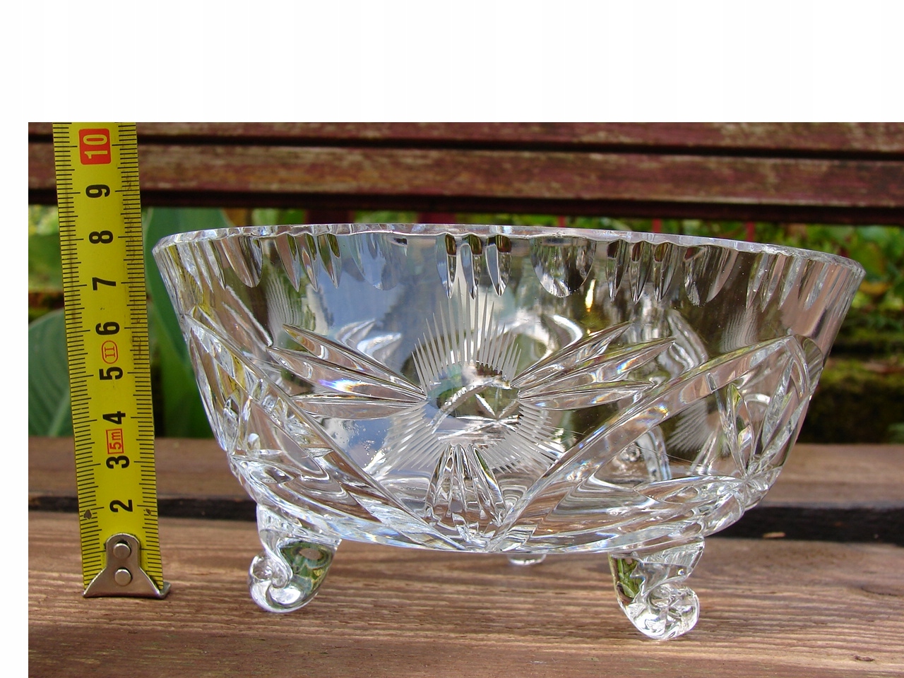 Стильна кришталева тарілка для подачі солодощів, виготовлена в декоративній формі, спирається на три ніжки.