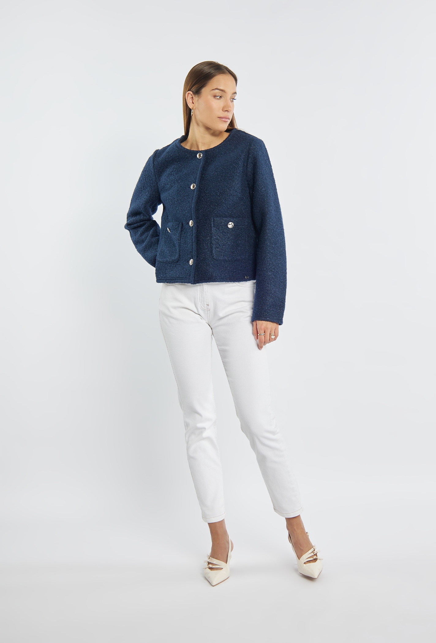 4 Кругле декольте та елегантні металеві ґудзики, розташовані по всій довжині, дають йому стиль. Дві практичні кишені з декоративними кнопками підкреслюють елегантний характер моделі. Ідеальний вибір як щодня, так і для більш офіційних випадків. Модель на малюнку висотою 177 см і представляє розмір 36.Параметри продукту:
