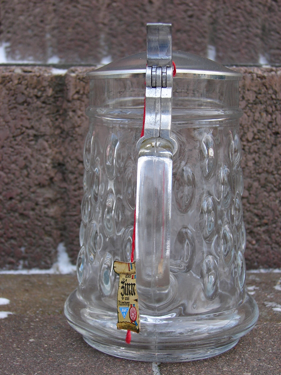 Стильний масивний скляний кухоль з жерстяною кришкою.