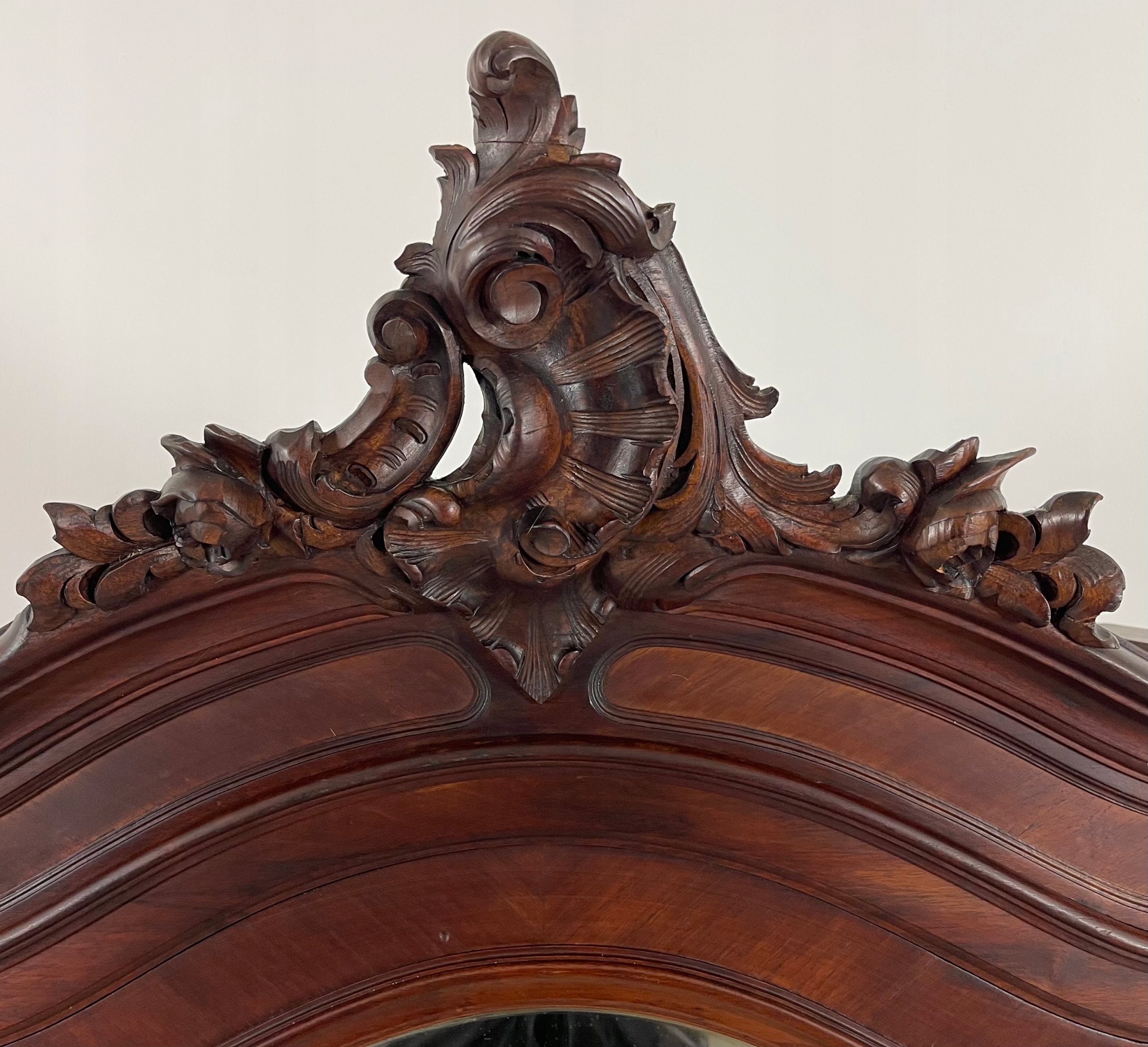 Предмет меблів прикрашений різьбленням і увінчаний характерним для стилю орнаментом. Він стоїть на гнутих різьблених ніжках.