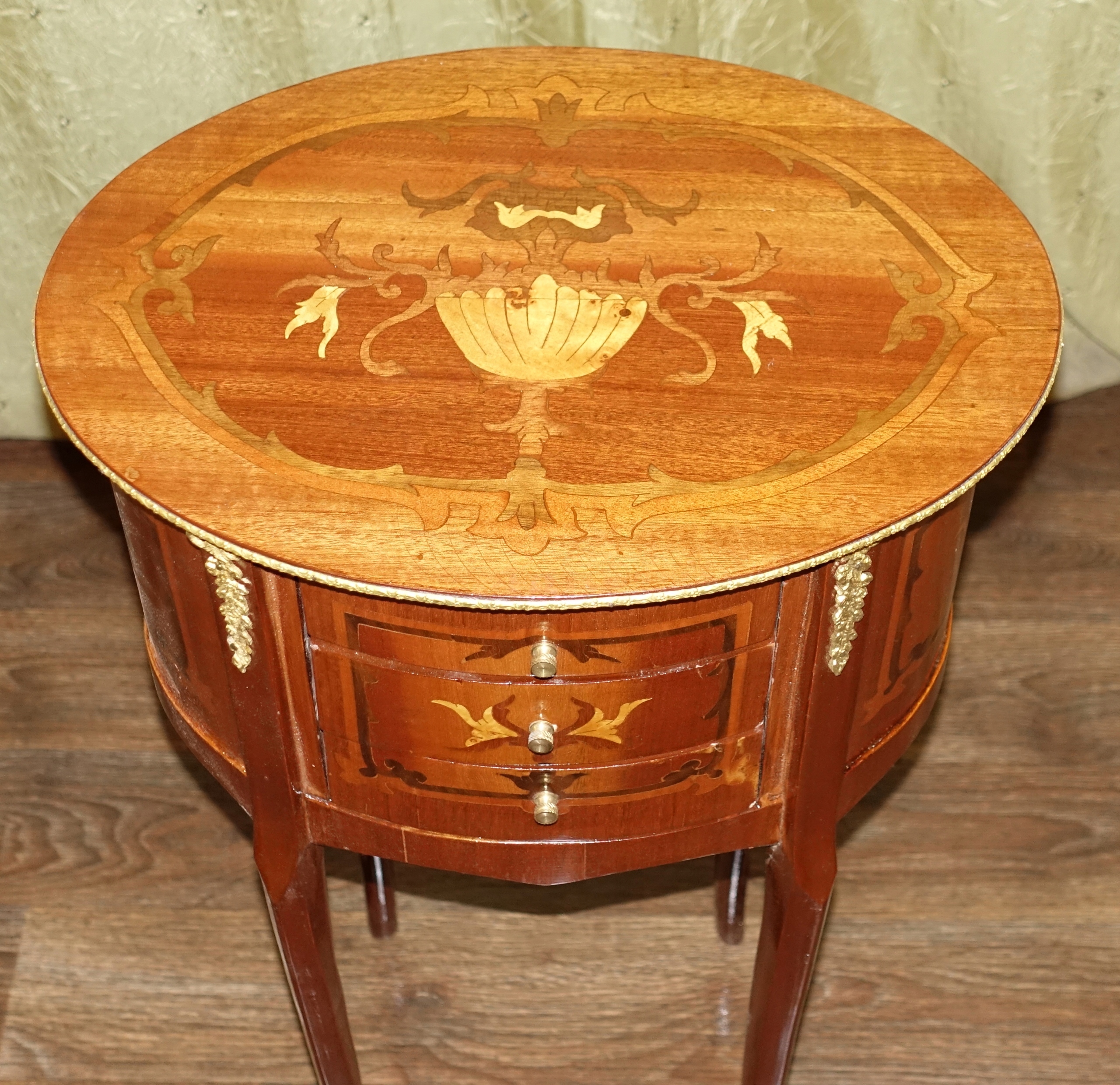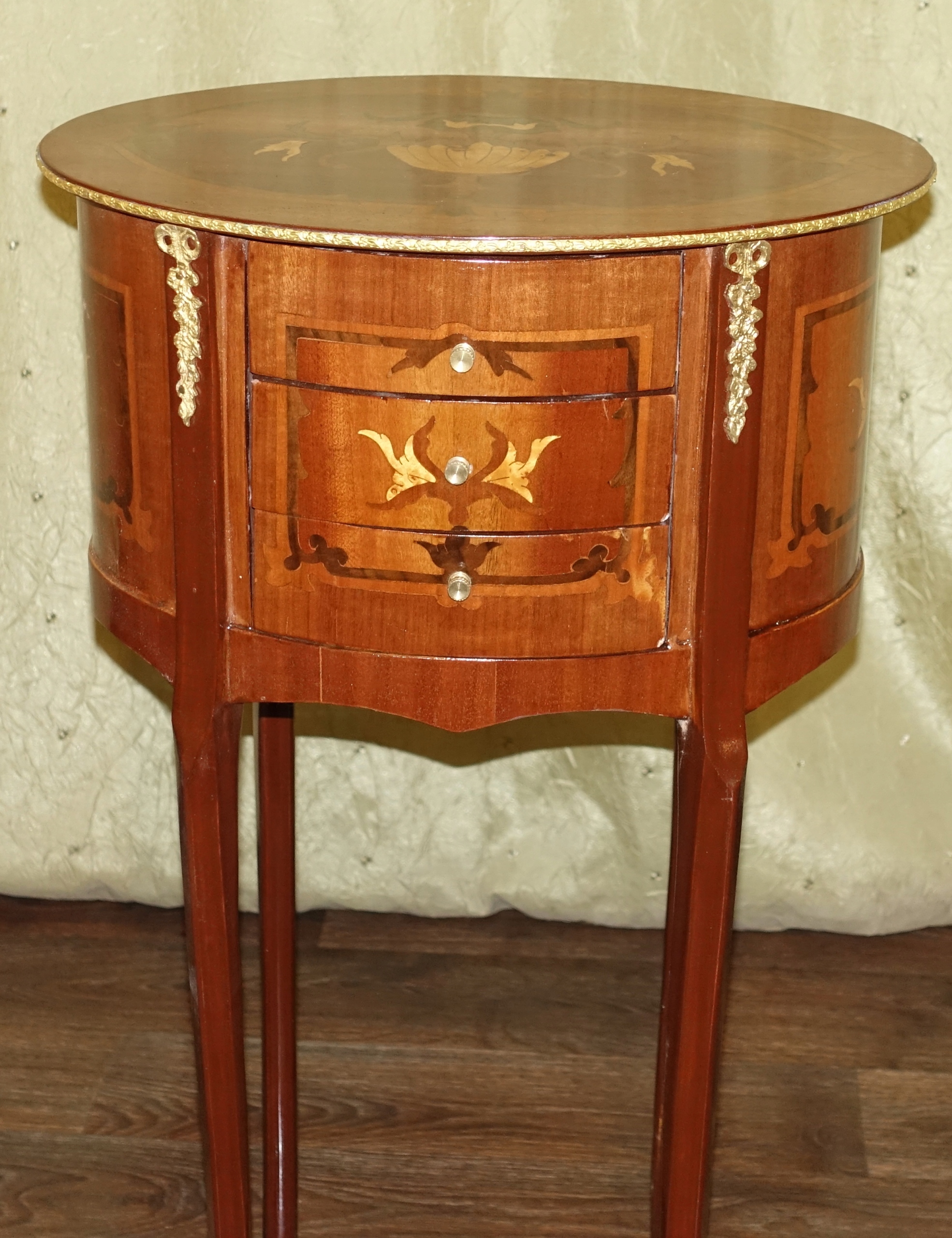Меблі виготовлені з дерева. У ньому є три ящики та мальовничі ущепки, він прикрашений латунними ручками та декорами. Колір меблів - темний волоський горіх, освітлений інкрустовкою.
