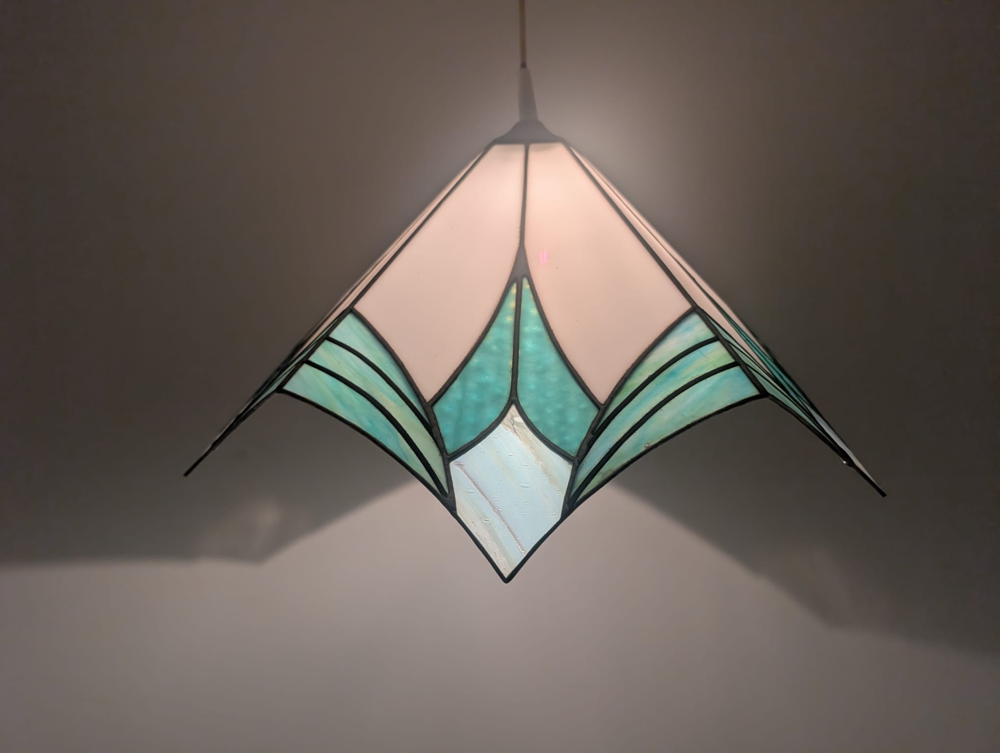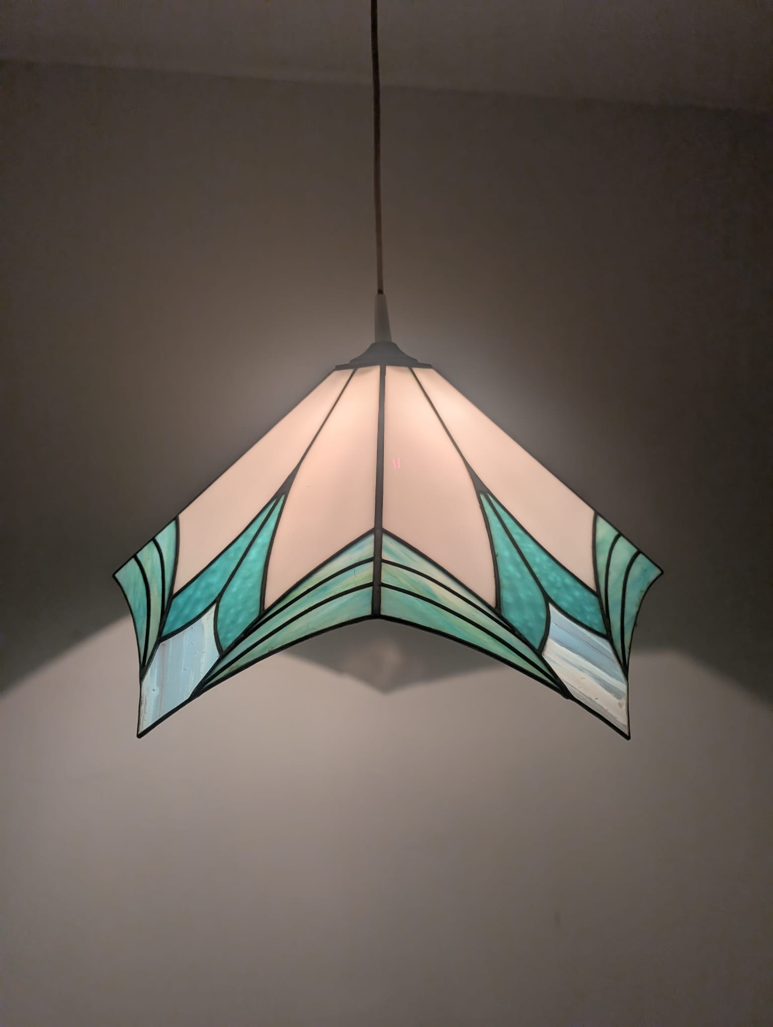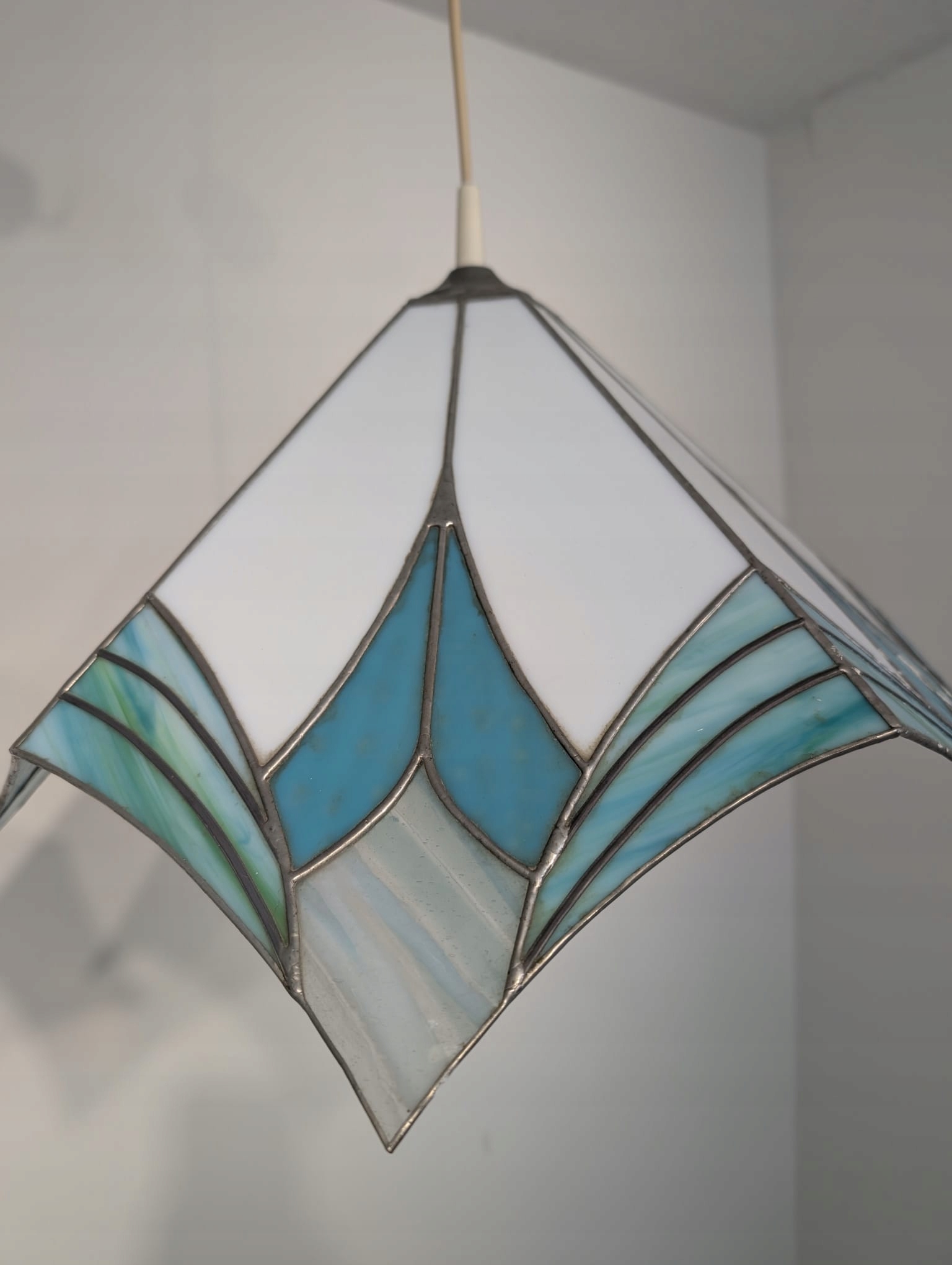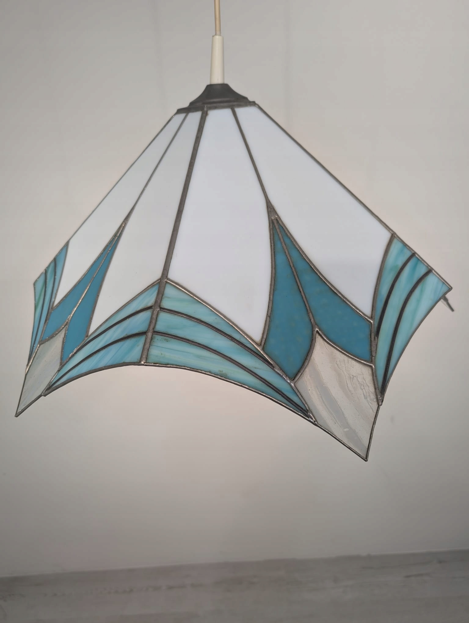 Стильна підвісна лампа в стилі Тіффані. Виготовлена з кольорового скла синіх відтінків, яке чудово підсвічує інтер'єр. Елегантний і сучасний дизайн, ідеально підходить для освітлення у вітальні, спальні чи їдальні.