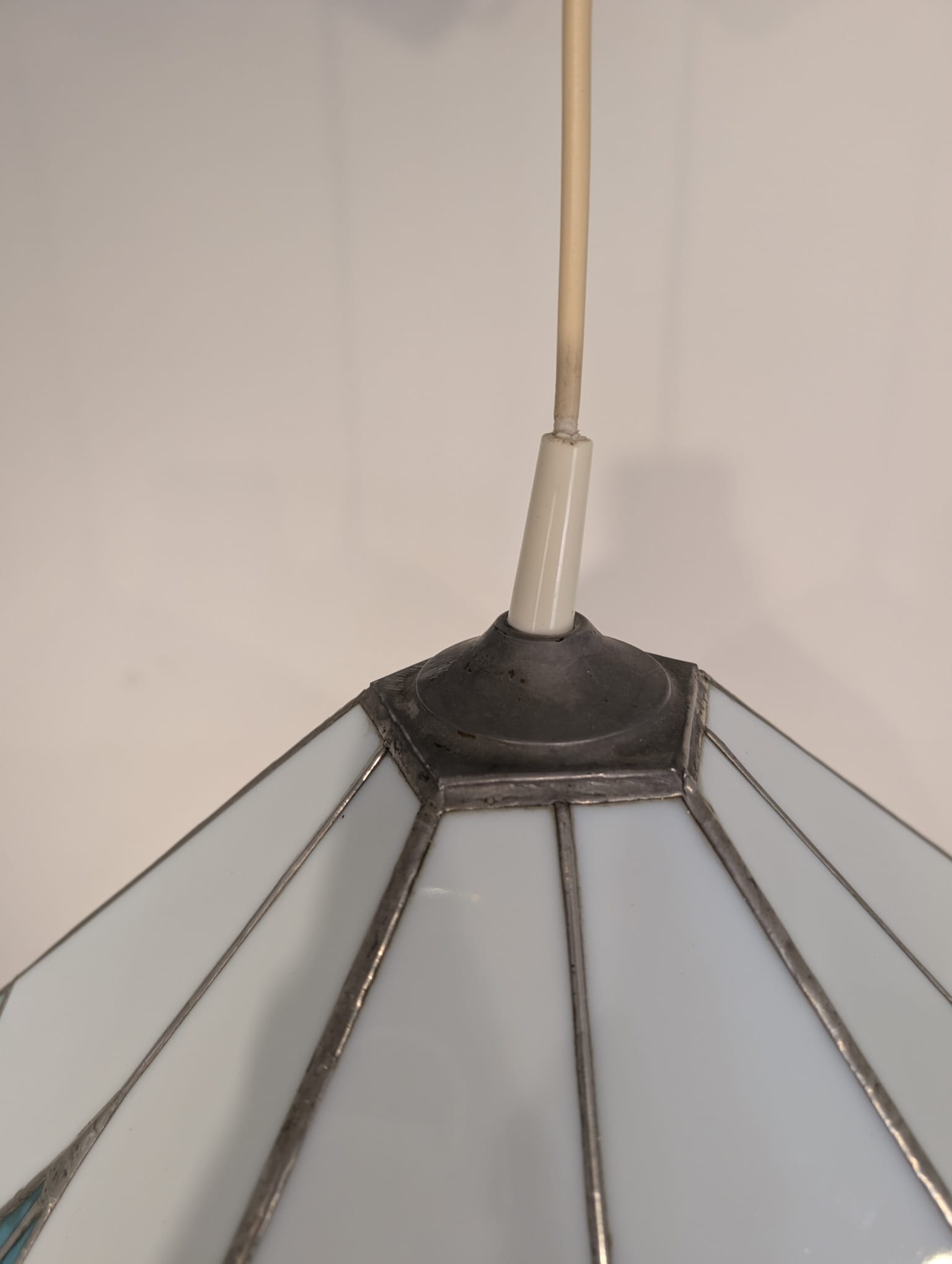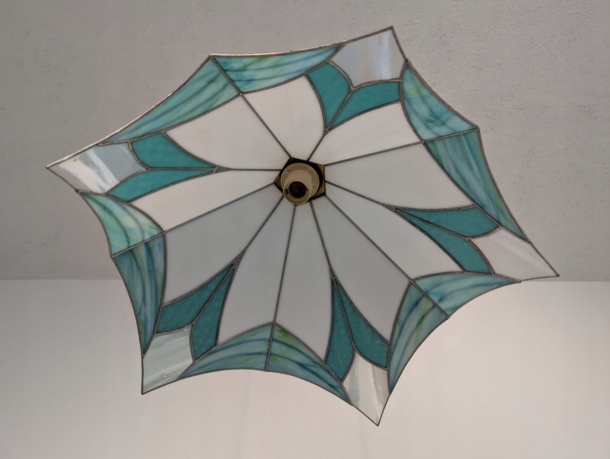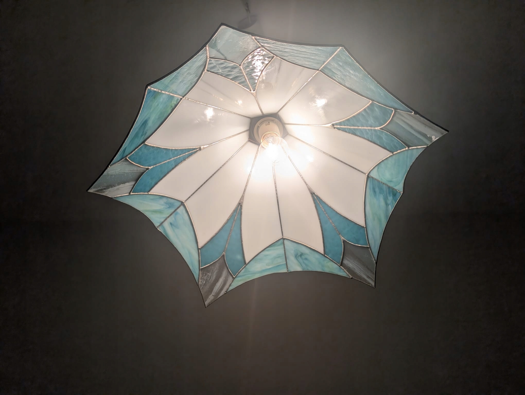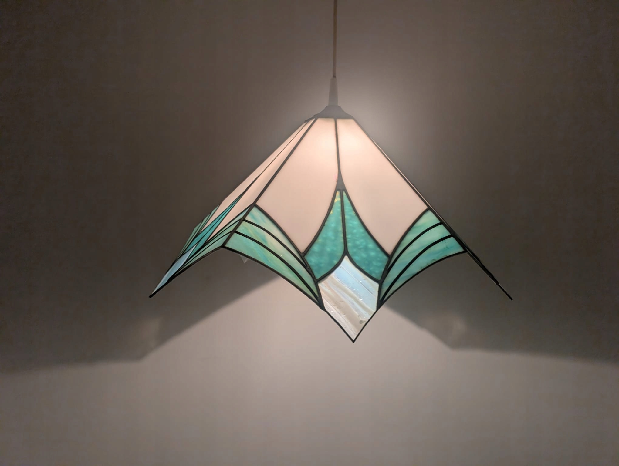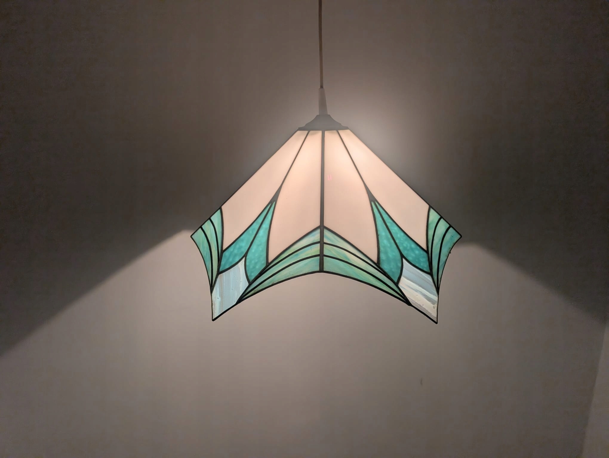 Стильна підвісна лампа в стилі Тіффані. Виготовлена з кольорового скла синіх відтінків, яке чудово підсвічує інтер'єр. Елегантний і сучасний дизайн, ідеально підходить для освітлення у вітальні, спальні чи їдальні.