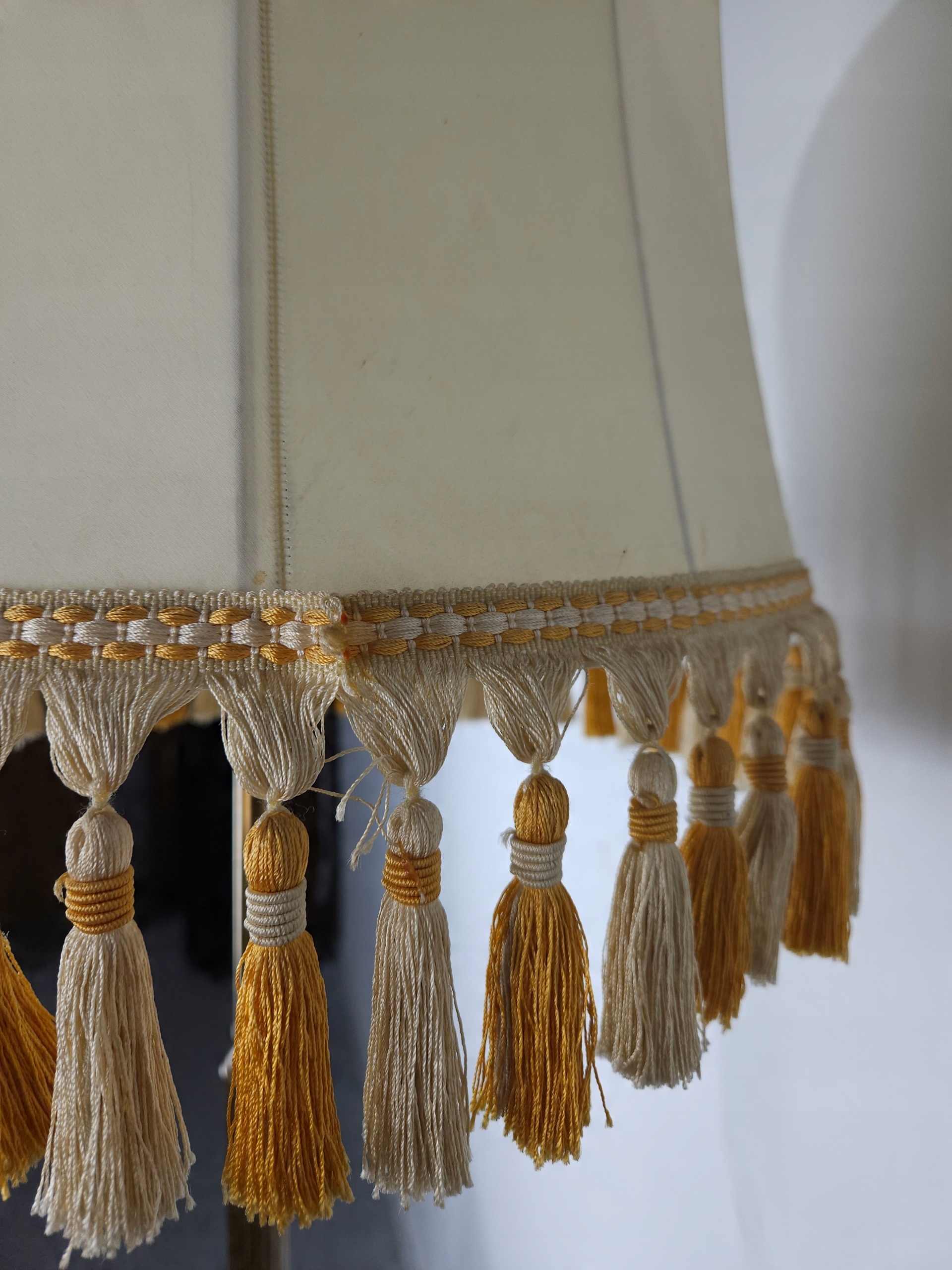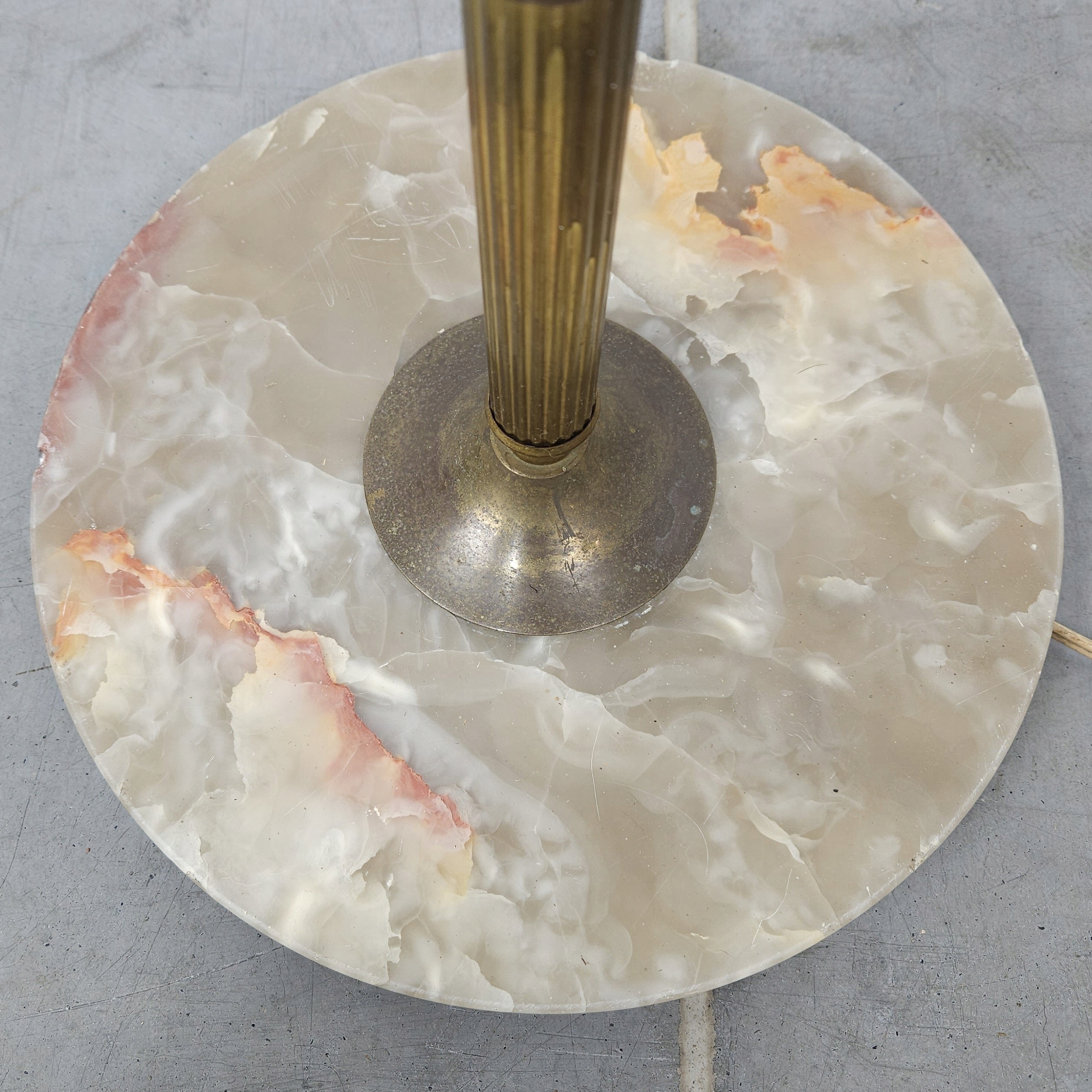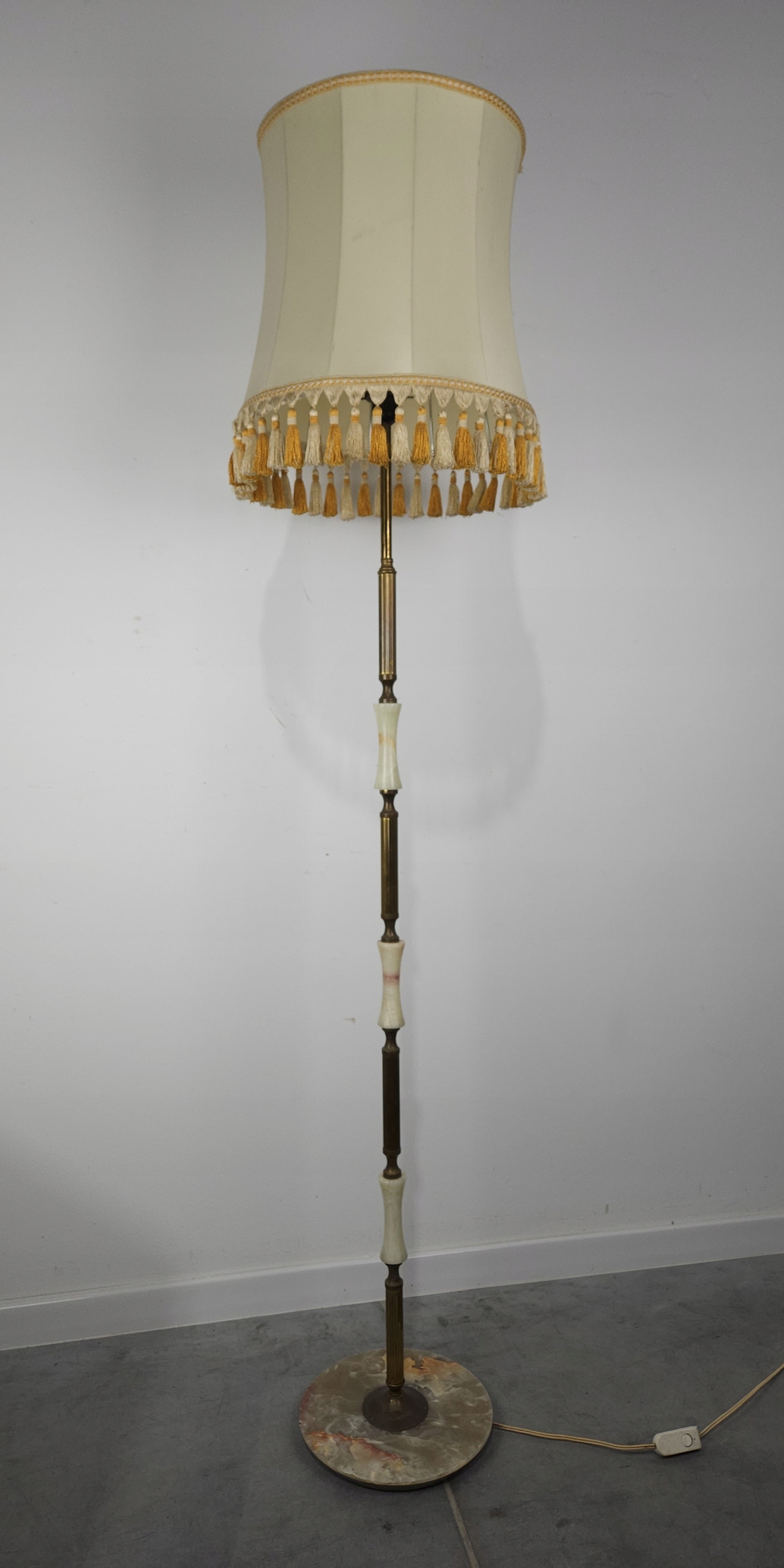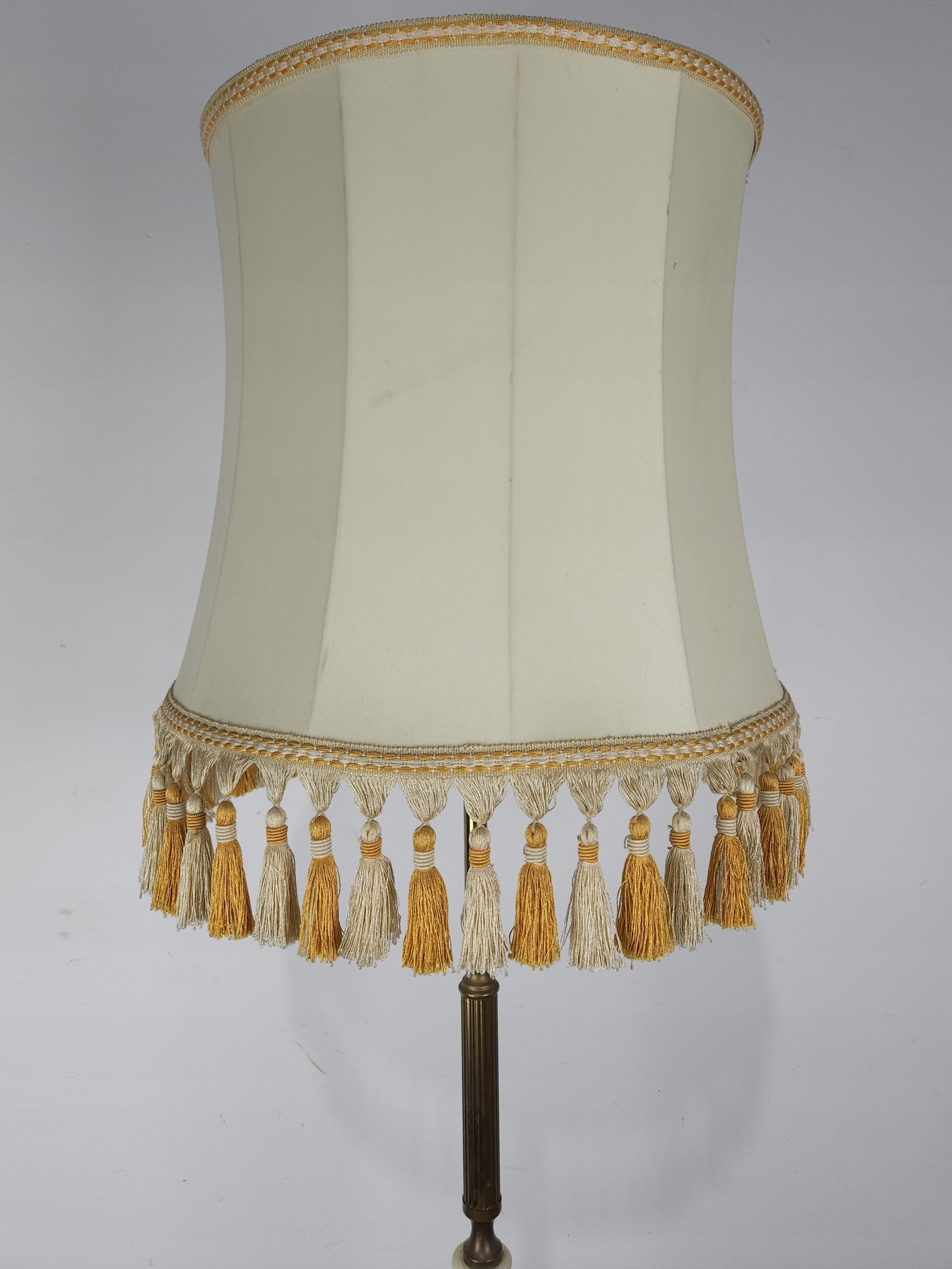 Стильна лампа стоячої лампи, на латуні ноги онікс, ліхтарі, оброблені бежевим матеріалом, для легкого оновлення (плями на матеріалі). Привезений з Франції. Зроблено в 80/90. Кам'яна основа має корисні сліди, потертості. Лампа функціональна, на малюнках під ним показано, що світло дає після запалення, лампочки не включаються. Деталі показані на малюнках.