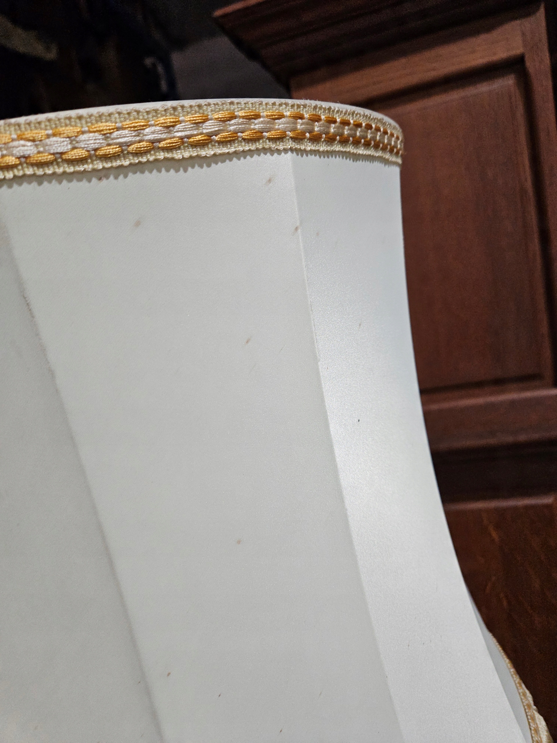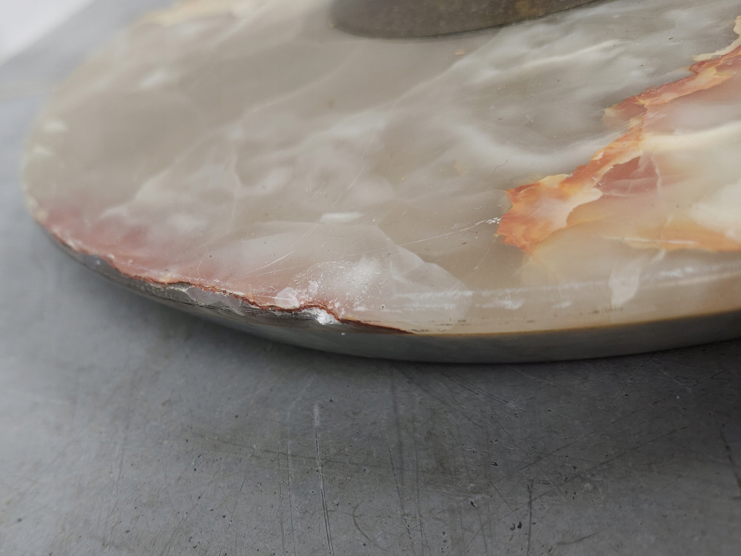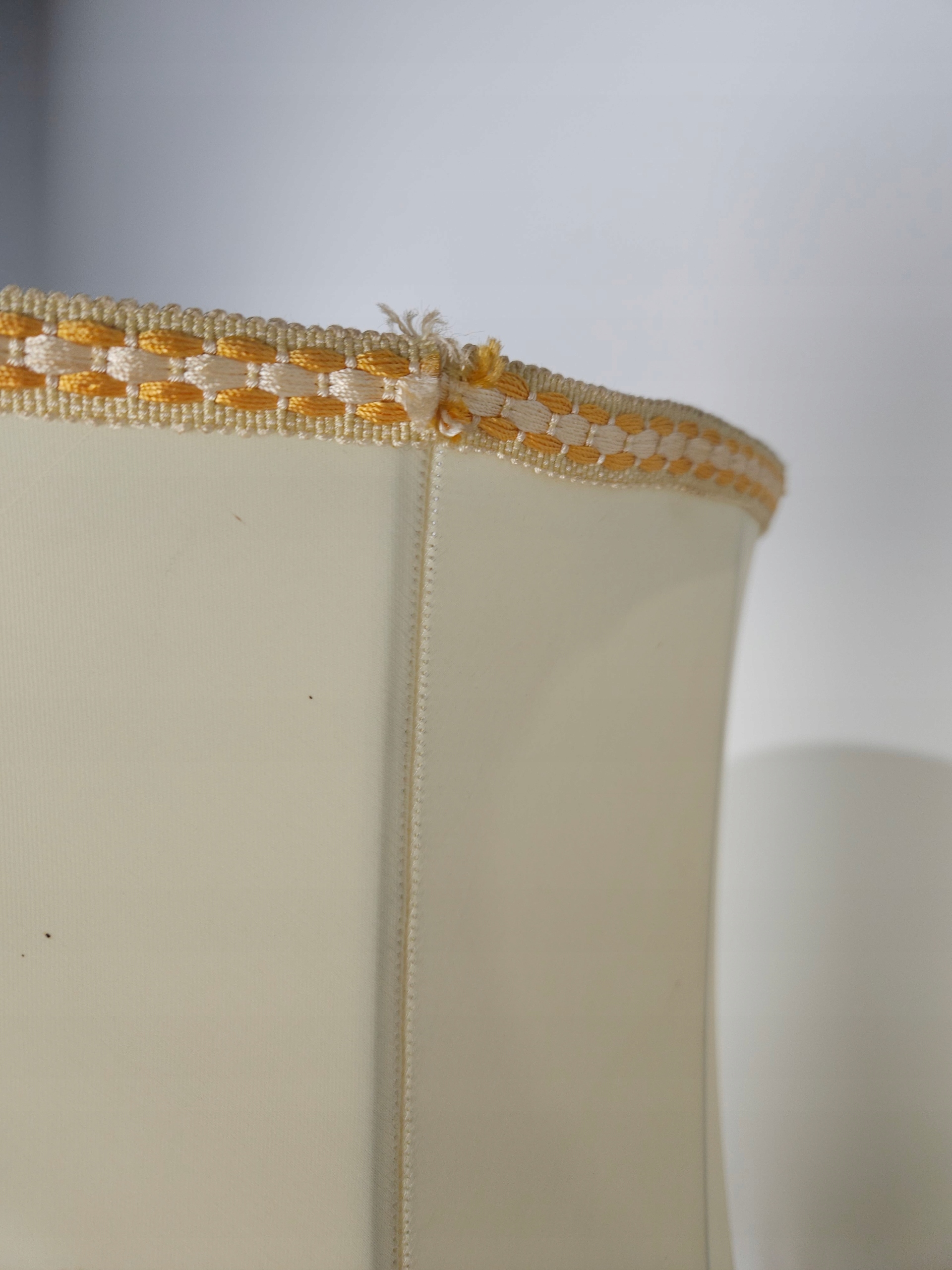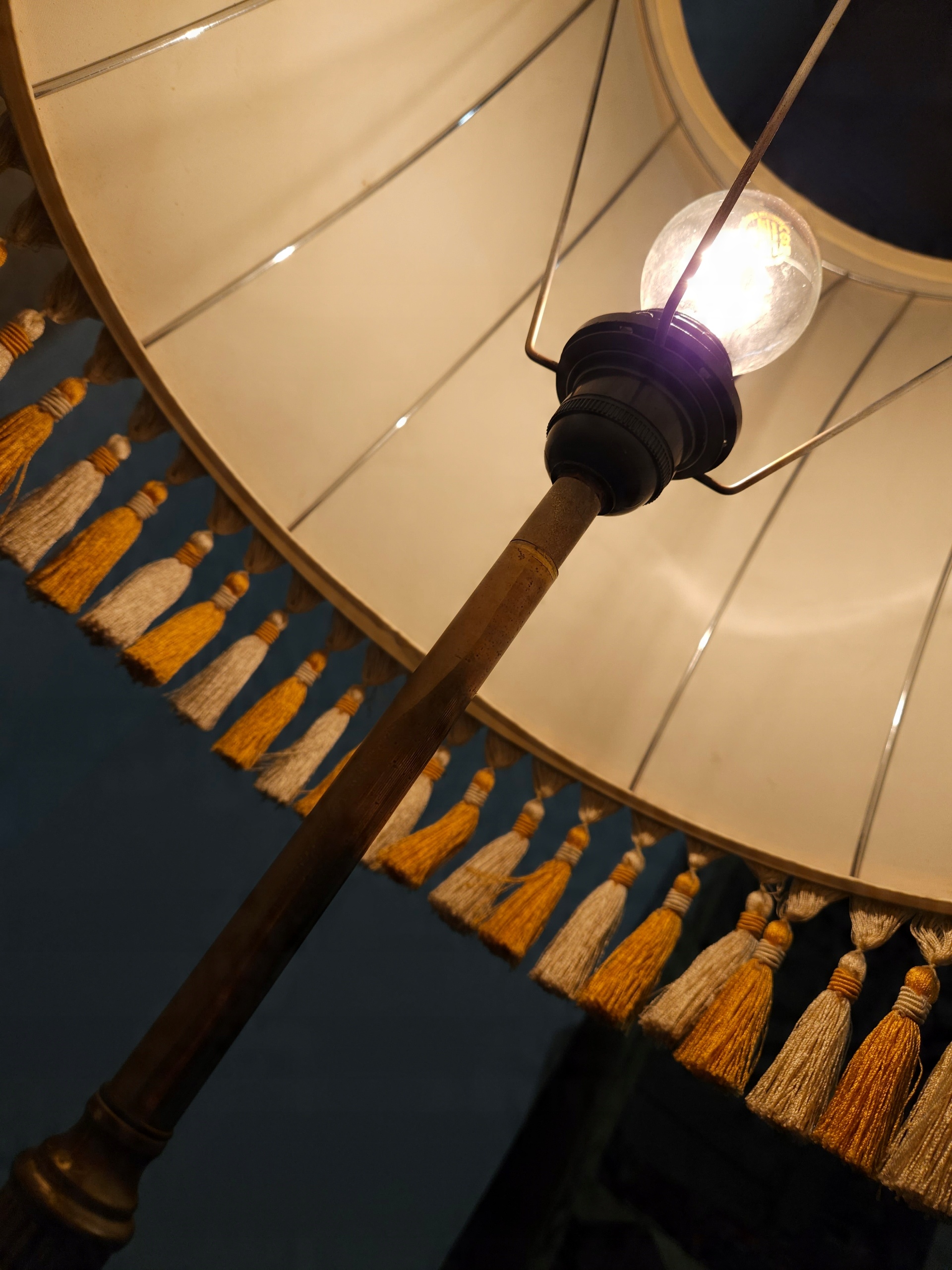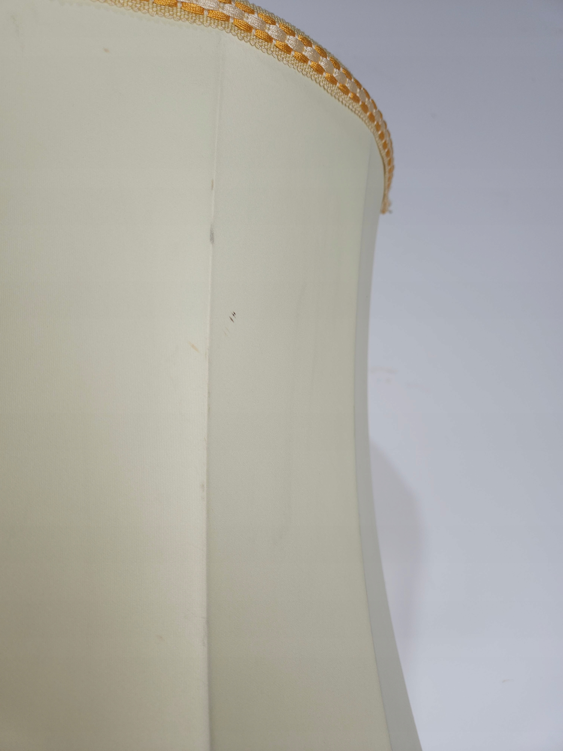 Стильна лампа стоячої лампи, на латуні ноги онікс, ліхтарі, оброблені бежевим матеріалом, для легкого оновлення (плями на матеріалі). Привезений з Франції. Зроблено в 80/90. Кам'яна основа має корисні сліди, потертості. Лампа функціональна, на малюнках під ним показано, що світло дає після запалення, лампочки не включаються. Деталі показані на малюнках.