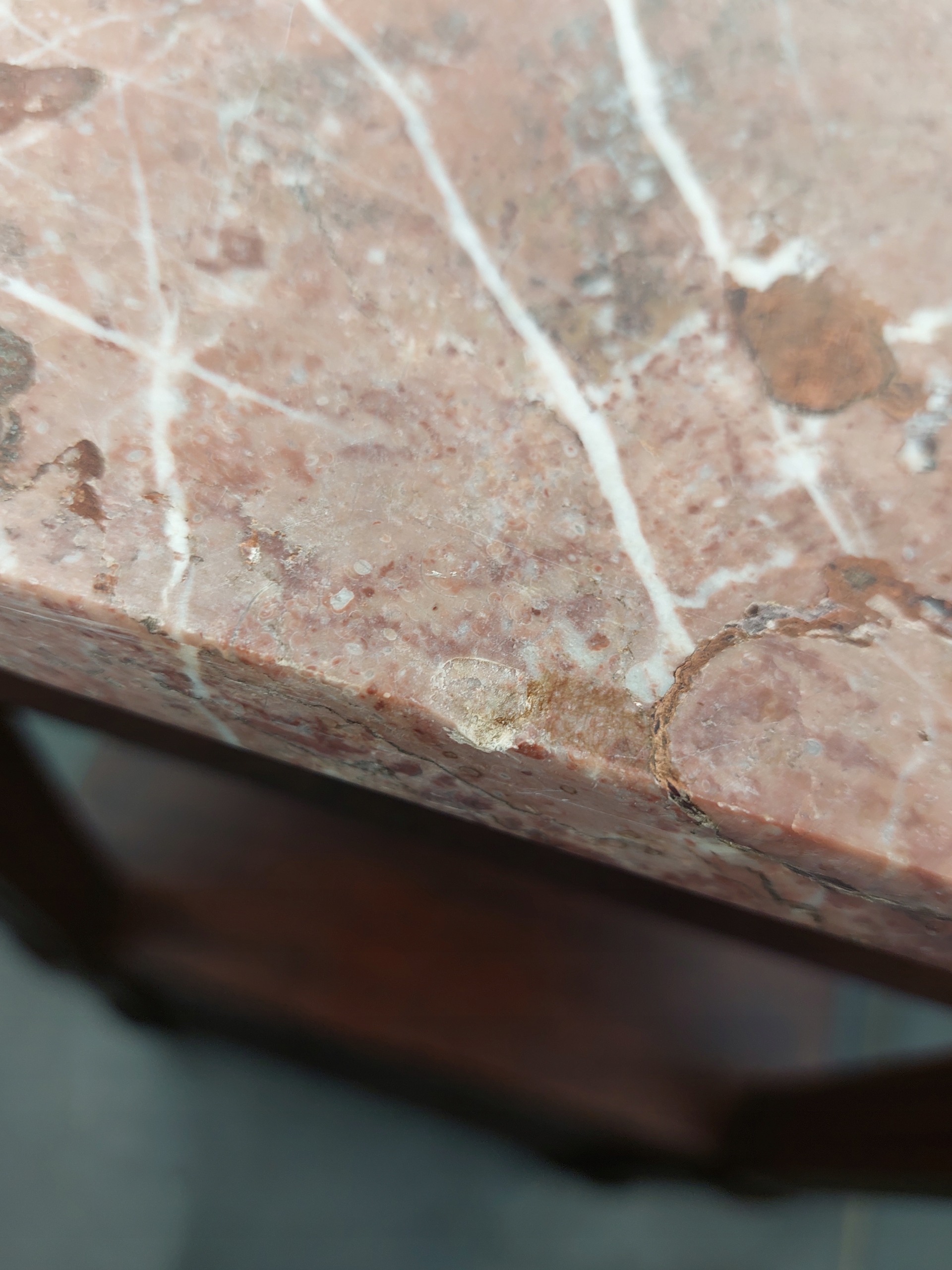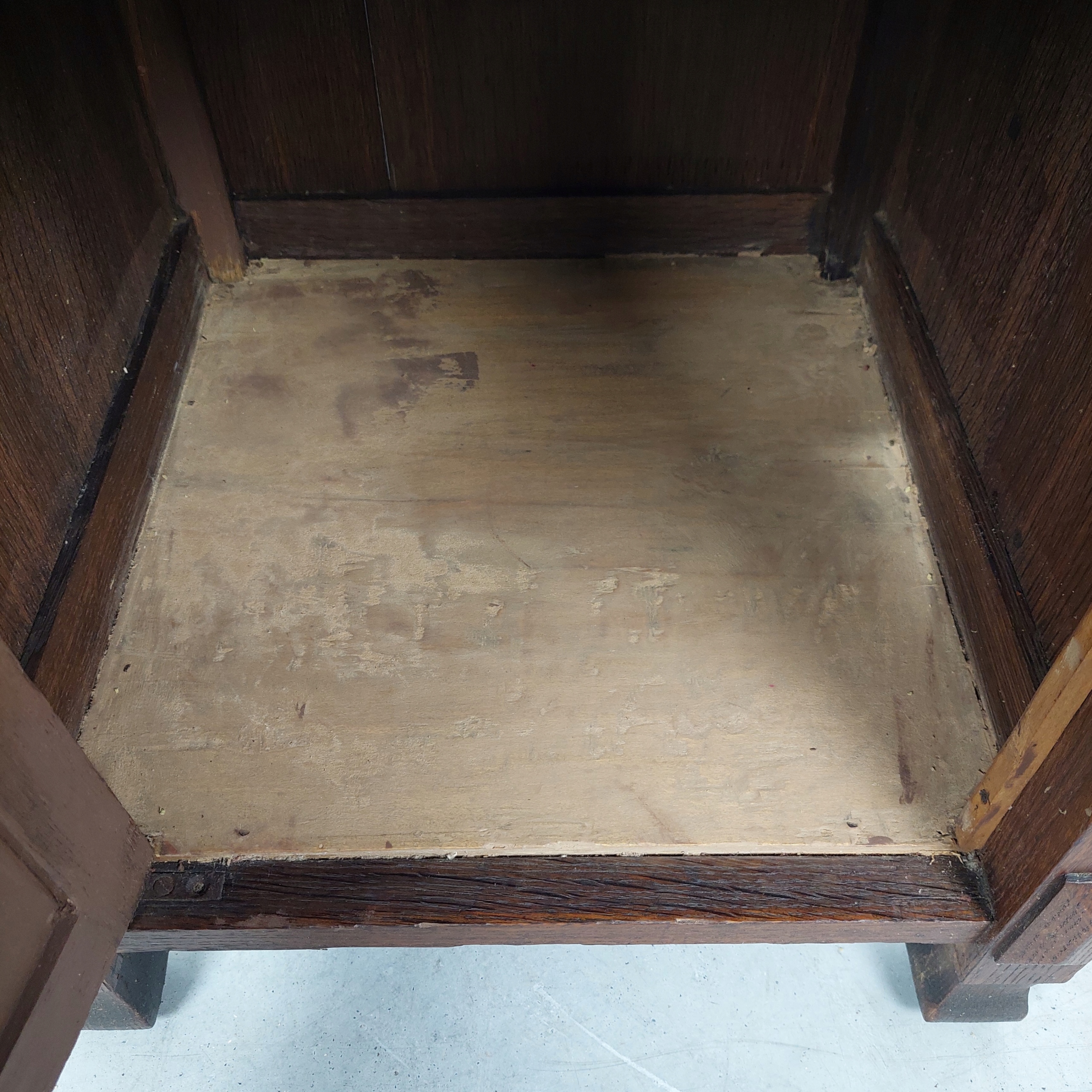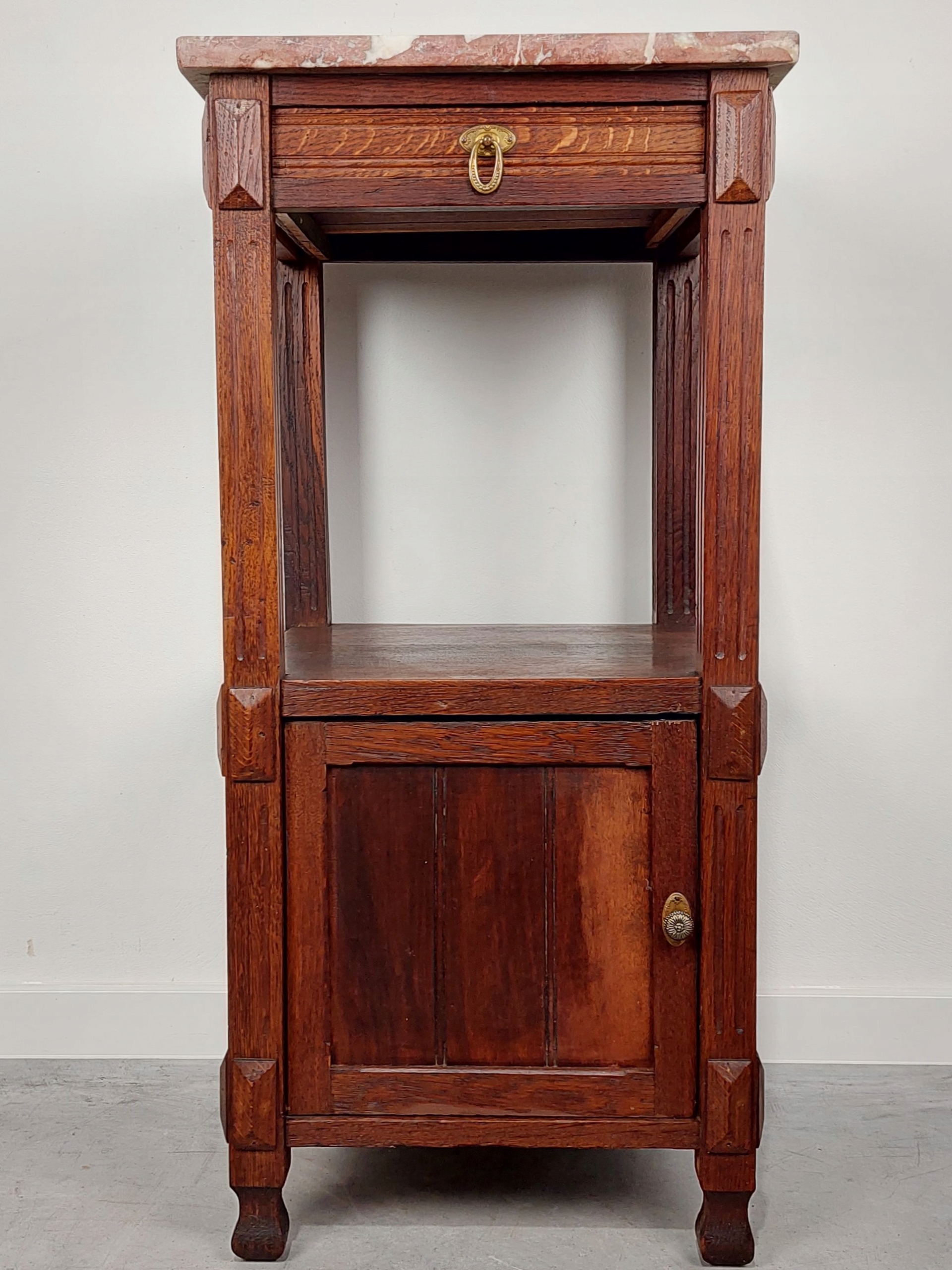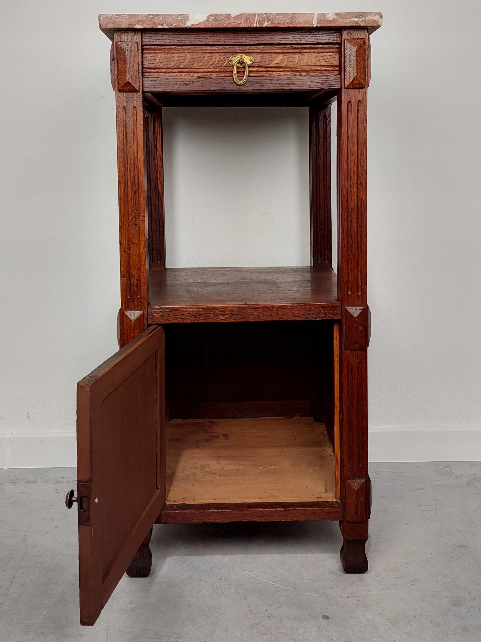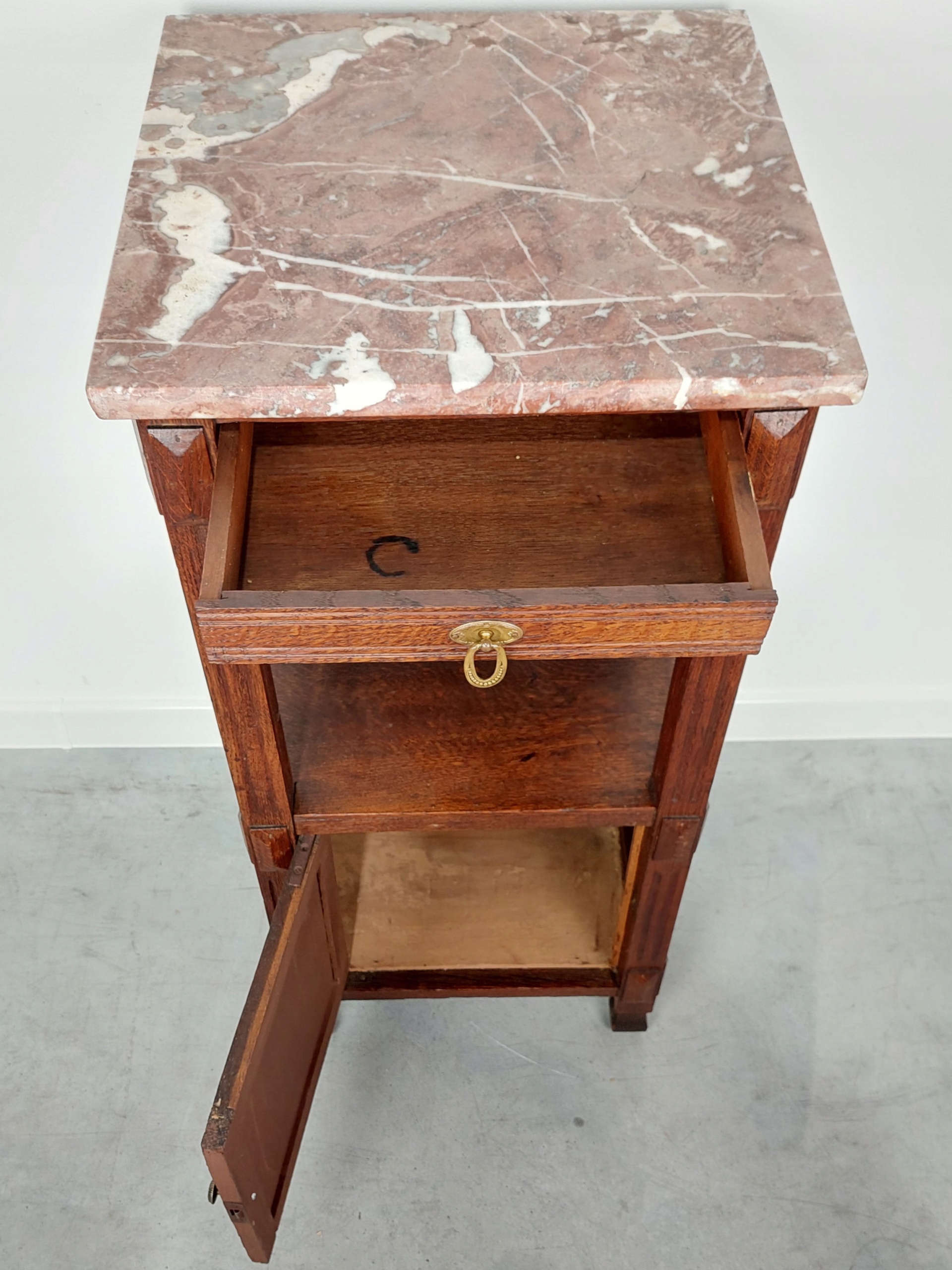 Стильна тумбочка епохи модерн, виготовлена з дуба, з мармуровою стільницею. На меблях через вік є сліди ремонту та використання, такі як подряпини на стільниці, засохлі плями в нижній частині шафи тощо (орієнтовний вік від 80 до 100 років). Стільниця постійно прикріплена. Деталі показано на фотографіях нижче.