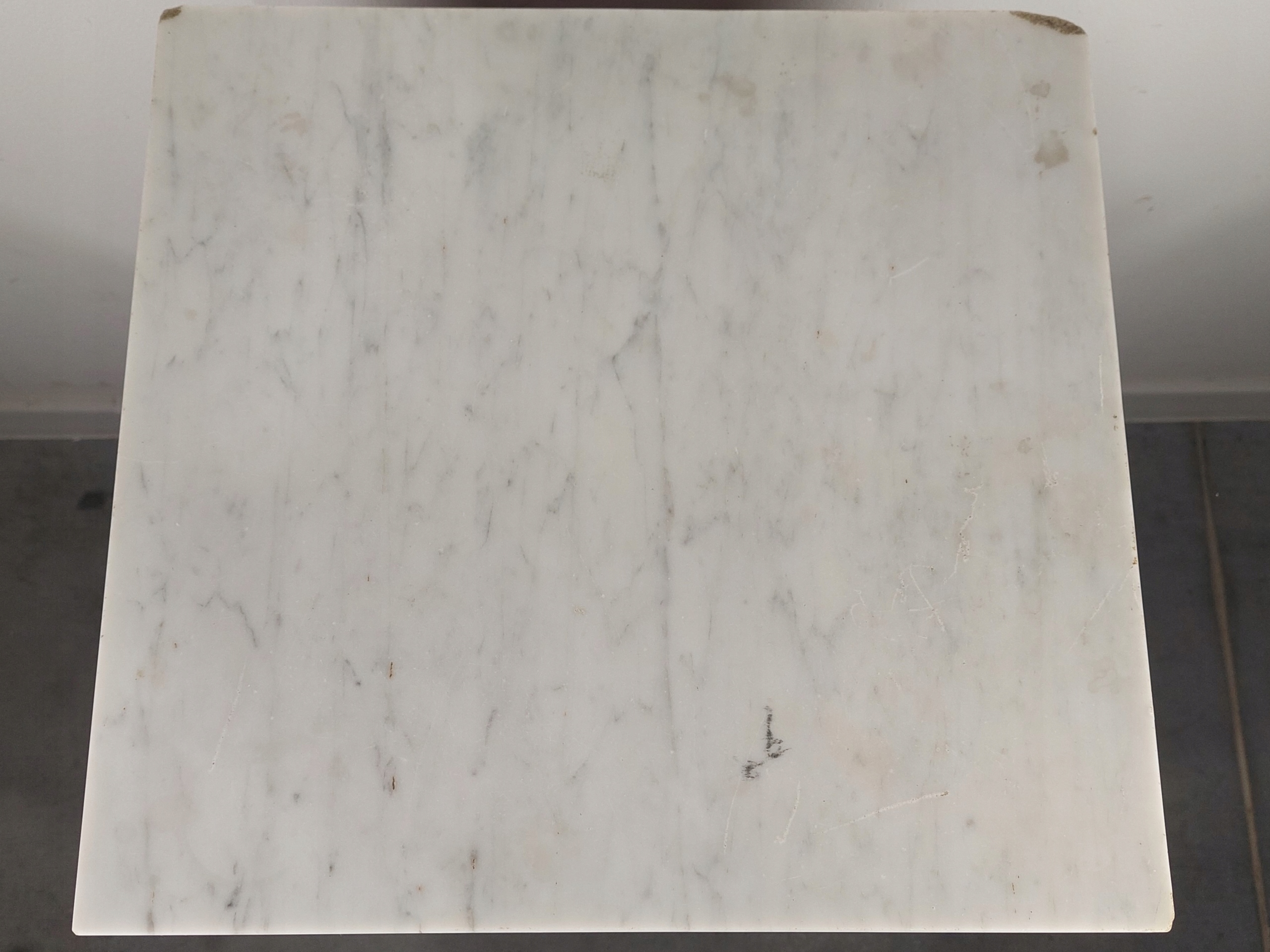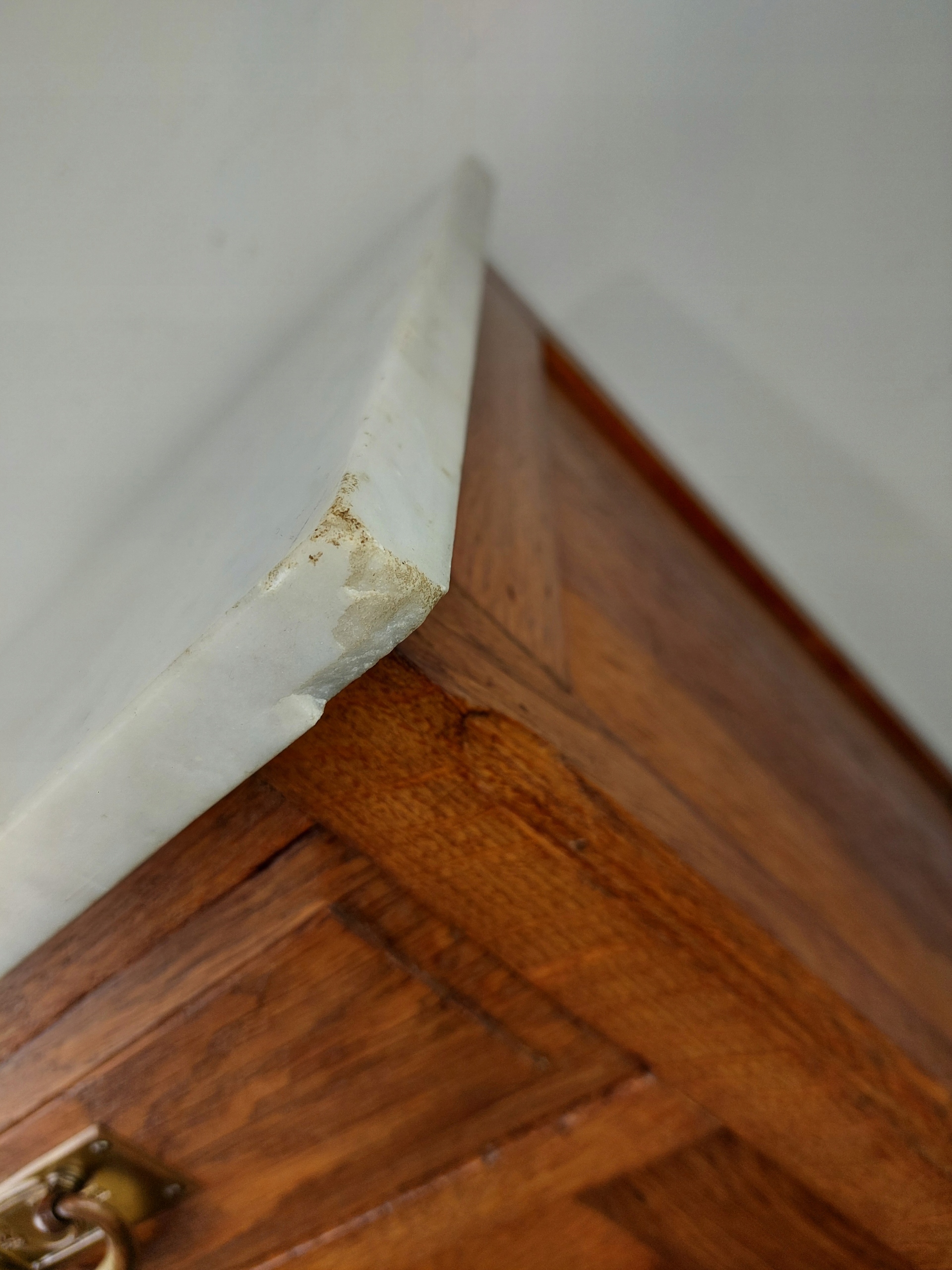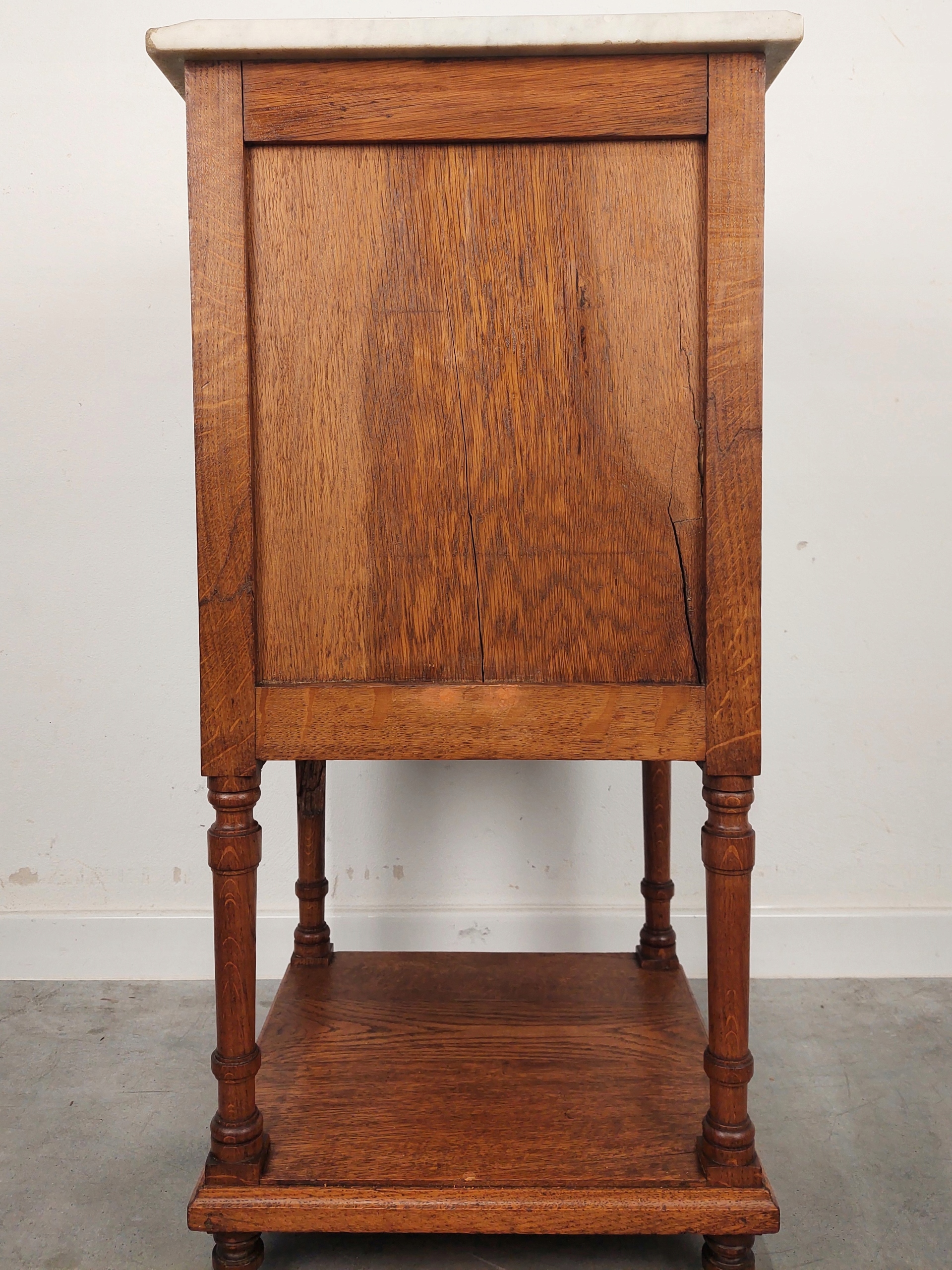 Стильна, еклектична тумбочка, виготовлена з дуба з мармуровою стільницею. Через свій вік меблі мають сліди ремонту та використання, такі як подряпини на стільниці або незначні потертості (орієнтовний вік від 80 до 100 років). У нижній смузі та на задній стороні правої передньої ноги є втрати деревини. Верх прикріплений на постійній основі, у дверцятах немає кулькової засувки. Деталі показано на фотографіях нижче.