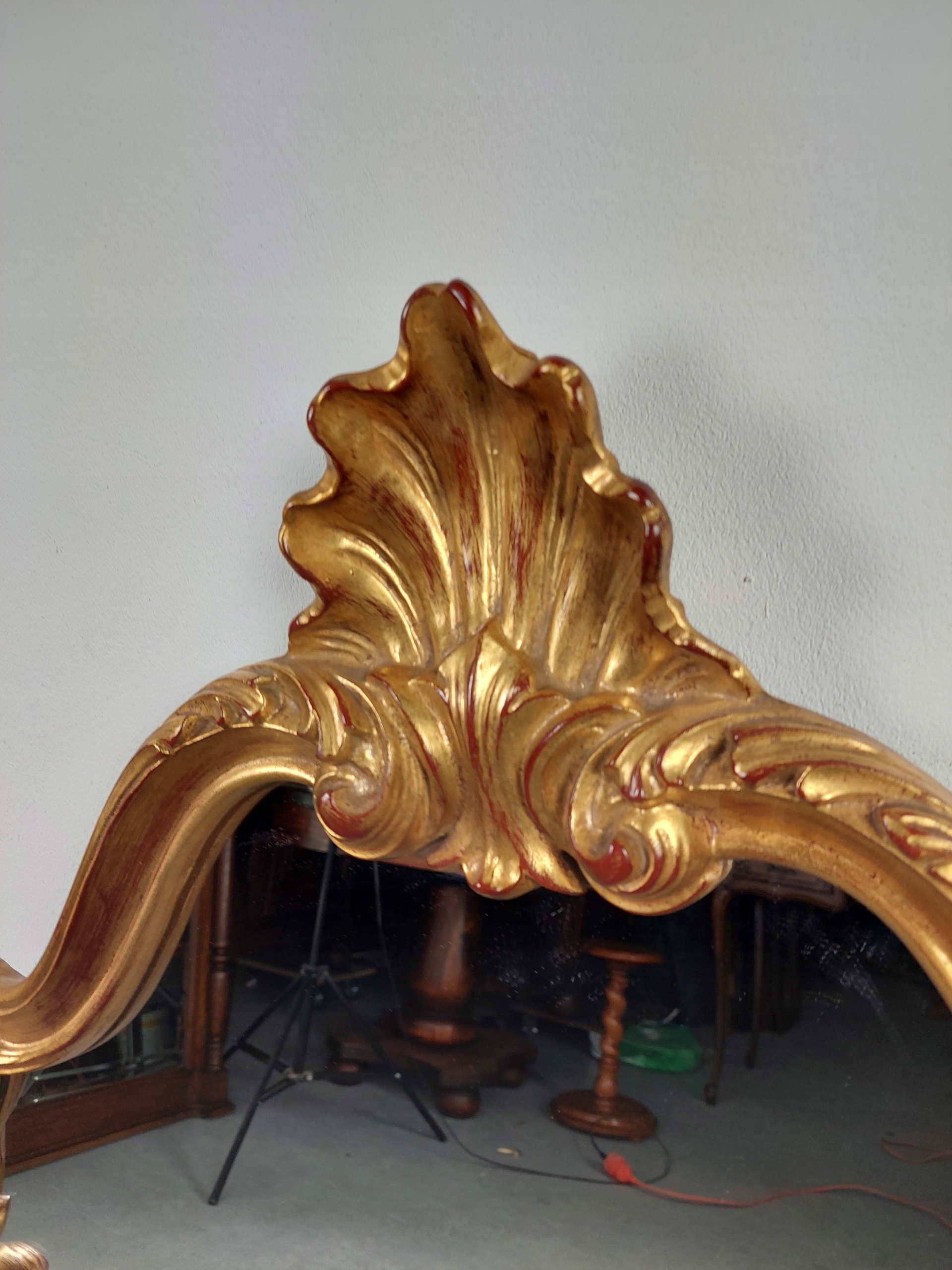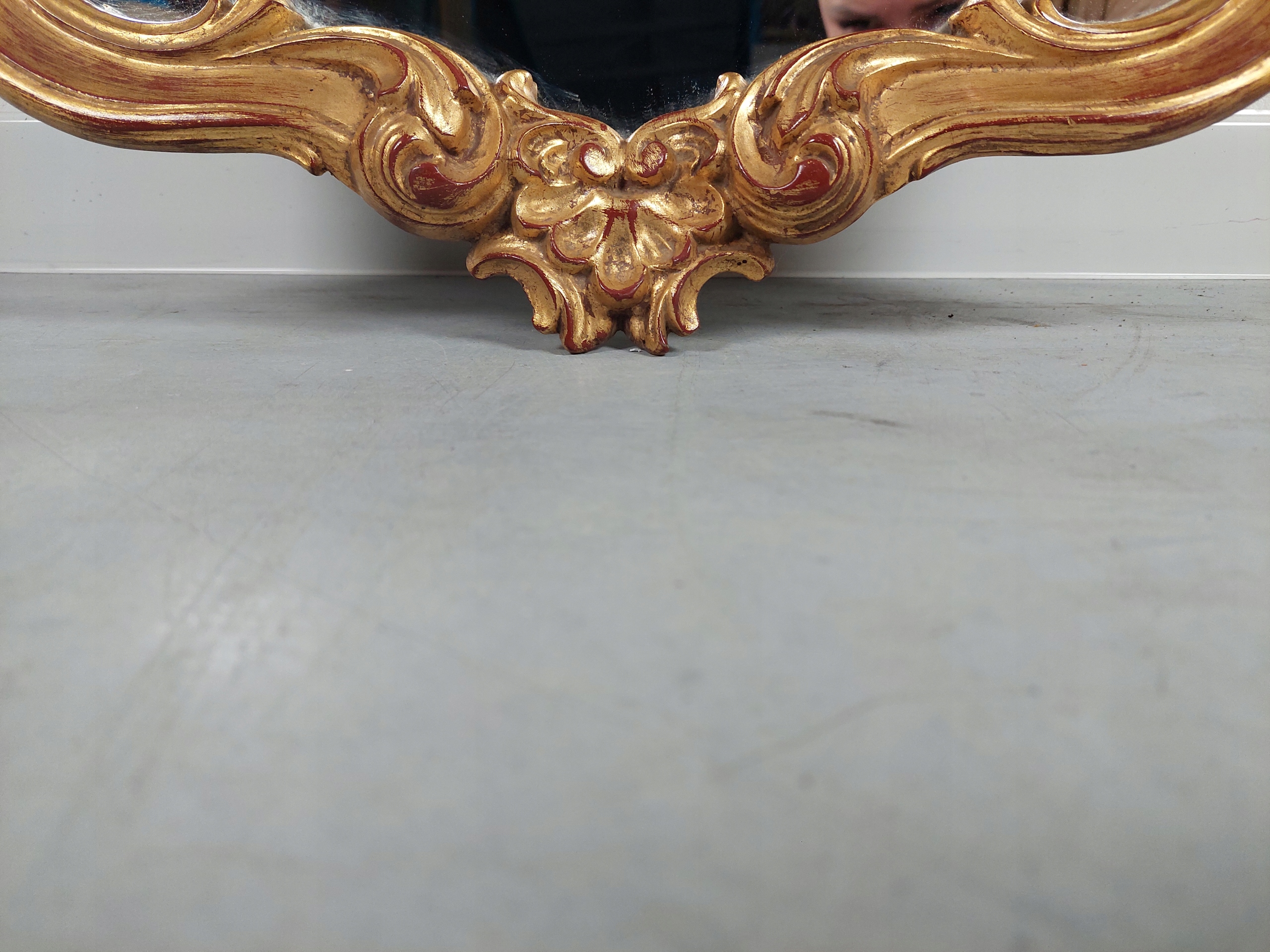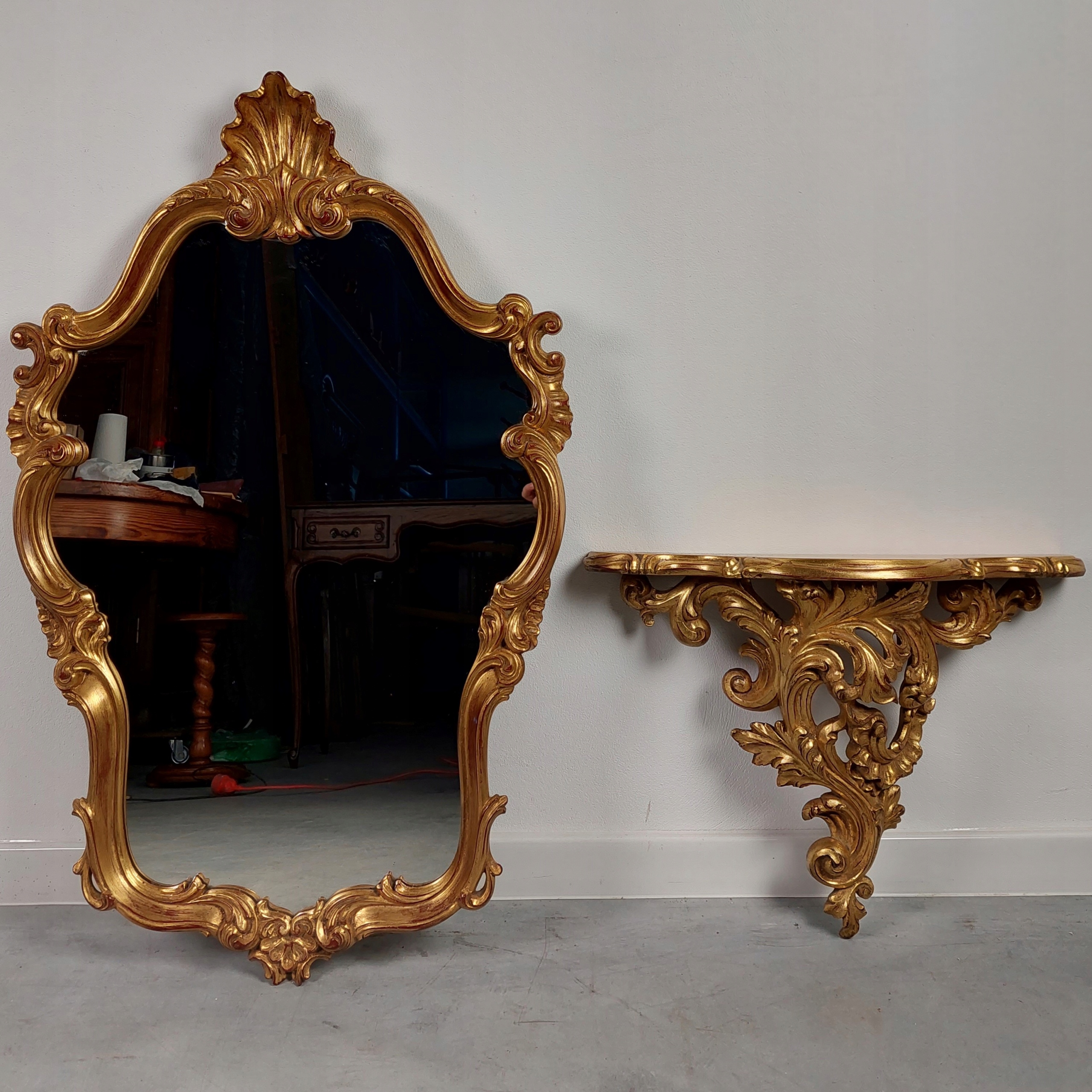 Стильне дзеркало в стилі бароко з підвісною консоллю. Простирадло в хорошому стані, без видимих дефектів. Каркас, декорації та верх консолі виготовлені з матеріалу на основі смоли та алебастру. Дзеркало і консоль призначені для підвішування на стіну. Набір має сліди використання (переважно консоль). Деталі на фотографіях нижче.