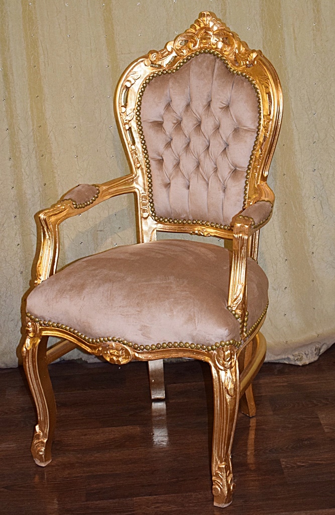 Стильне бароко -крісло з підлокітками. Старий золотий колір. Оббивка, виготовлена ​​з матеріалу плюшевого відтінку бежевого, закінченого зі смаком латунної сосни - дуже хороший стан.