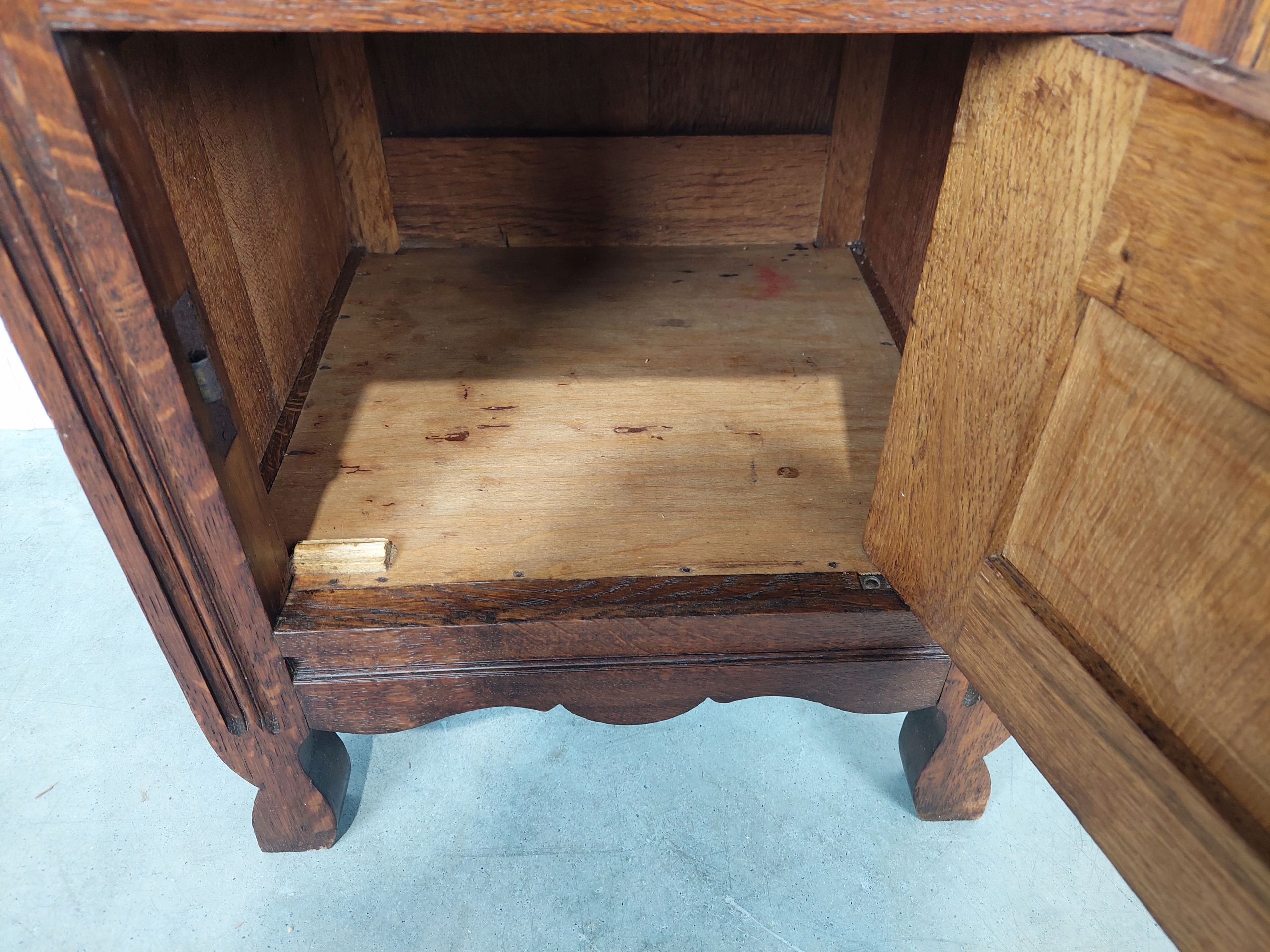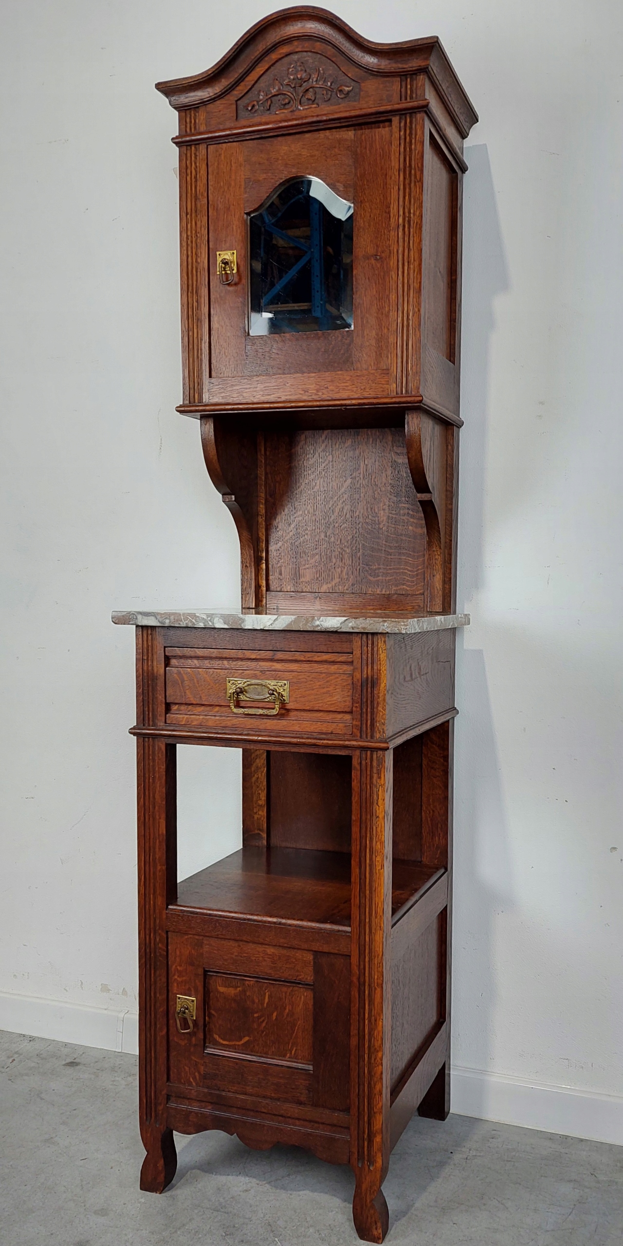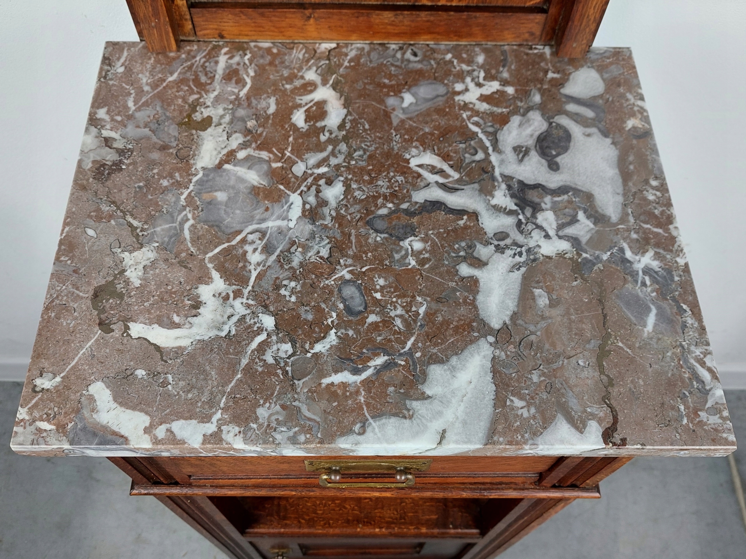 Стильне потужне ліжко з модерну з суцільного дуба в комплекті з ліжковим столом, привезеним з Франції. Унікальна модель, рідкісна, насичена дерев’яна муцент. Суцільна конструкція, обидві меблі, виготовлені повністю з твердого дуба. Існують комерційні позначки, такі як подряпини на знебарвлення, делікатні натуральні науки/ ремонтні сліди через вік. Орієнтовний час повстання - 1920/1930. Ціна призначена для набору: Ліжко з ліжковим столом у мармуровому шафі, фіксованому назавжди. CM)