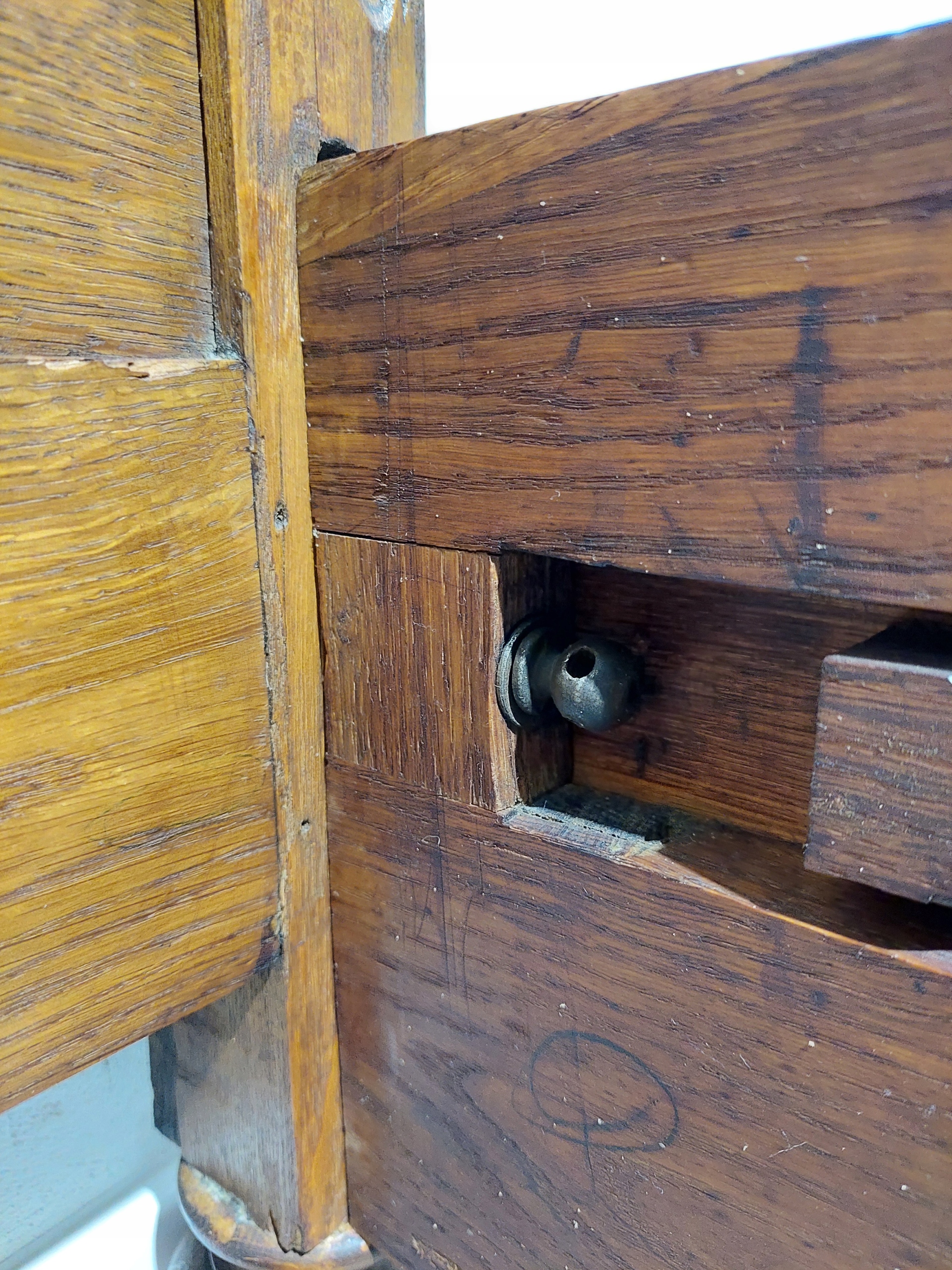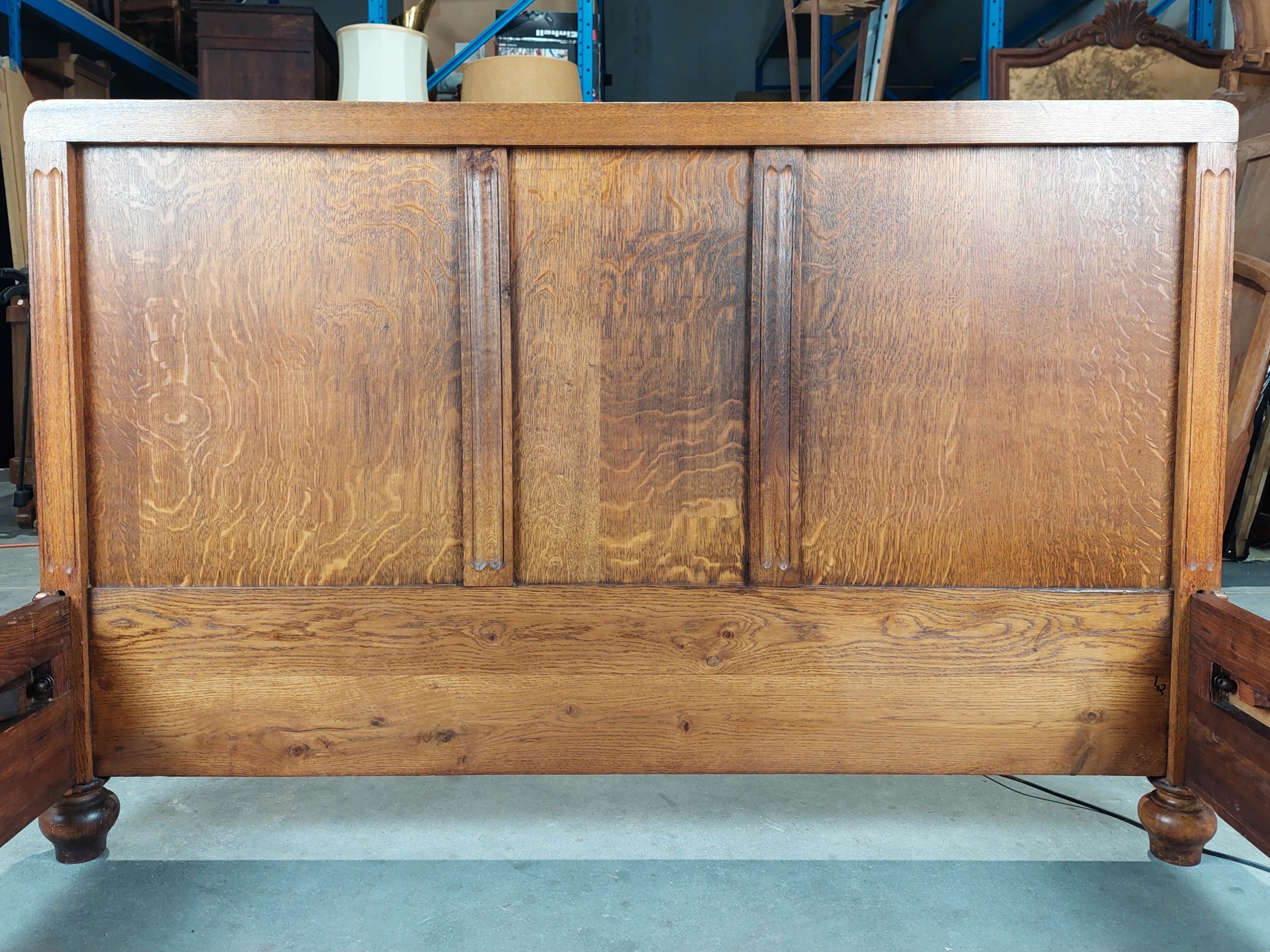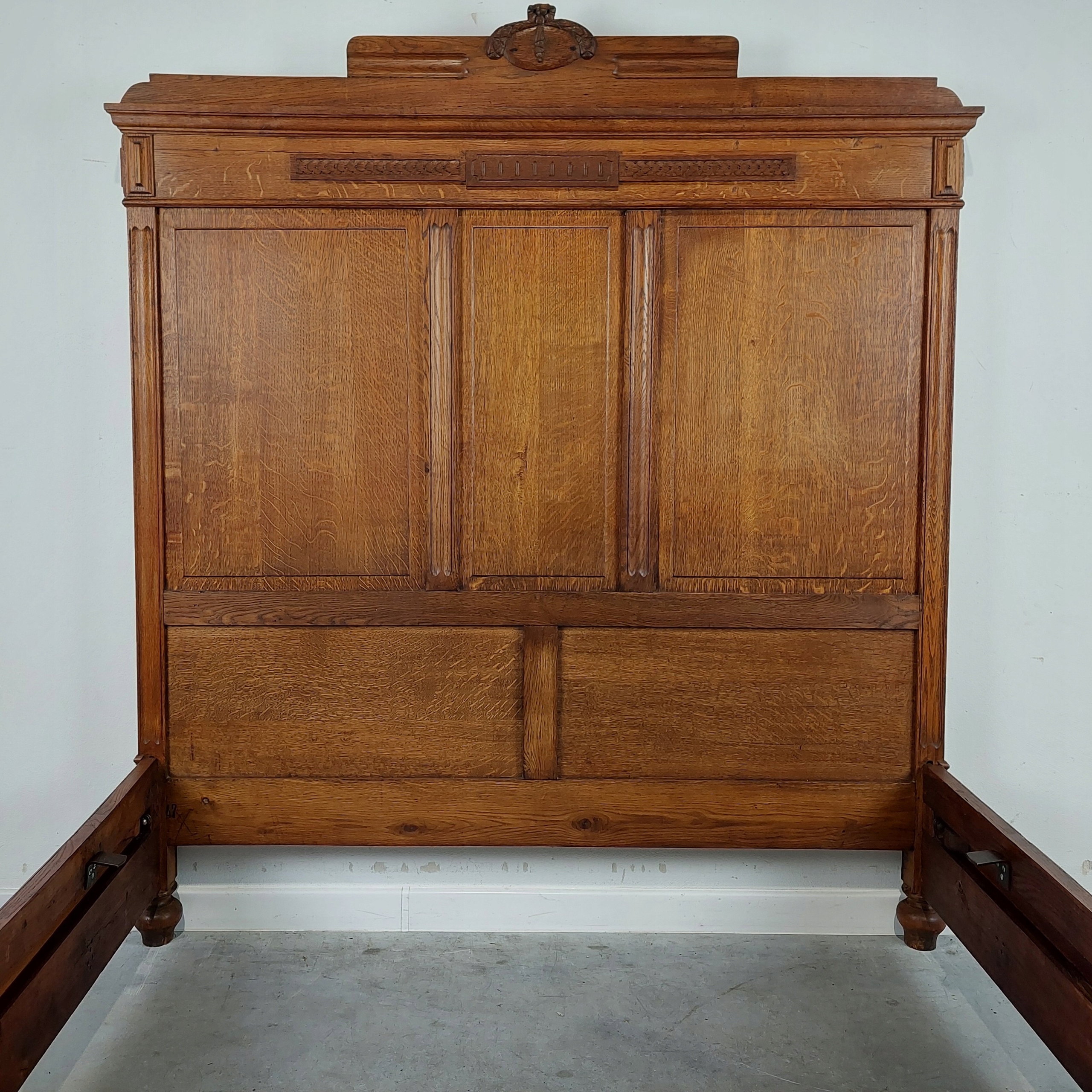 Стильне дубове ліжко в стилі модерн/еклектика, імпортоване з Франції. Міцна конструкція, повністю виготовлена з масиву дуба. Ліжко стійке і зберігає компактну форму. Подовжувач узголів'я знімається. На меблях сліди дрібного ремонту. Є типові сліди використання, такі як зміна кольору та подряпини. Орієнтовний час створення – рубіж 1920/1930 рр. Деталі описані та показані на фотографіях.