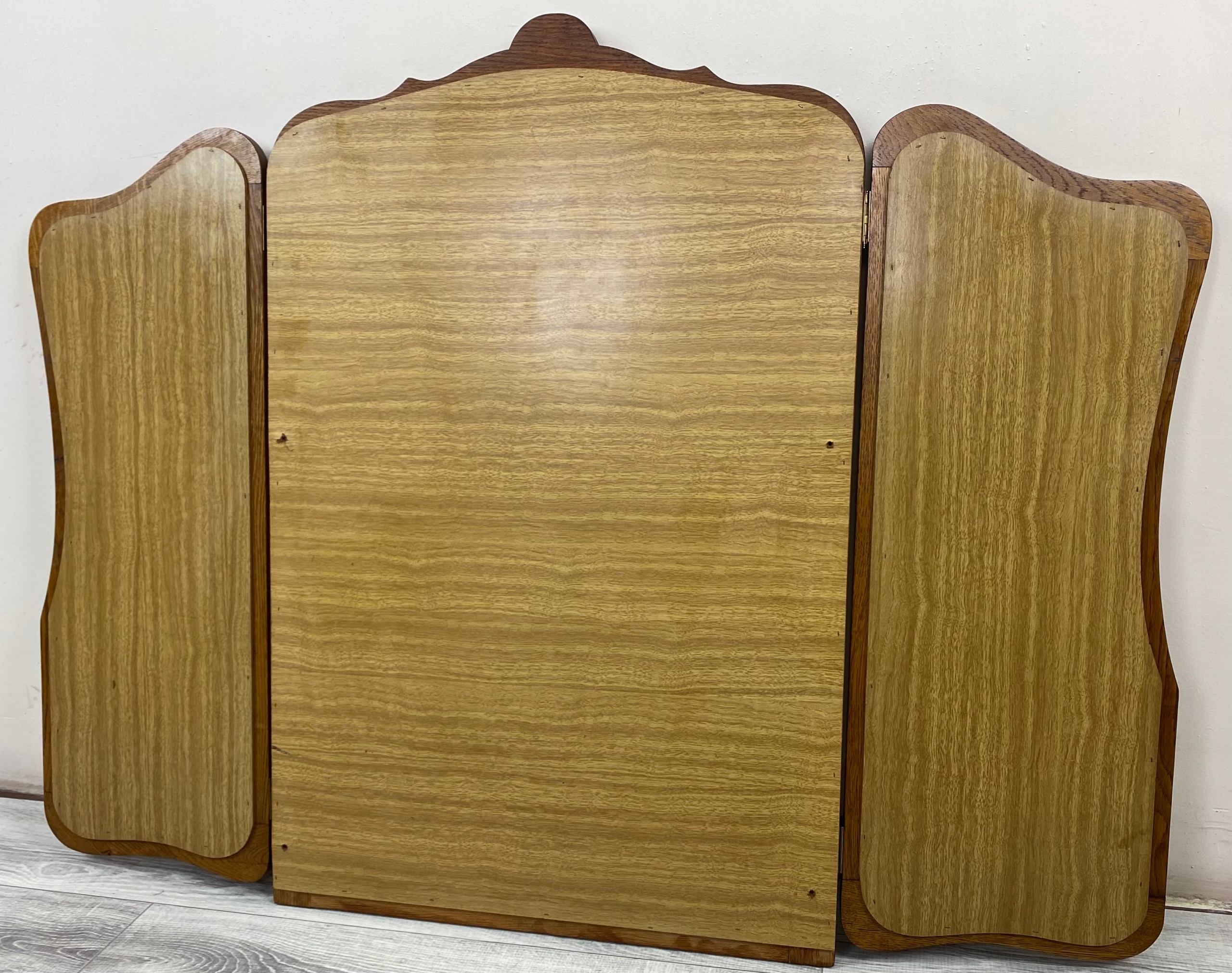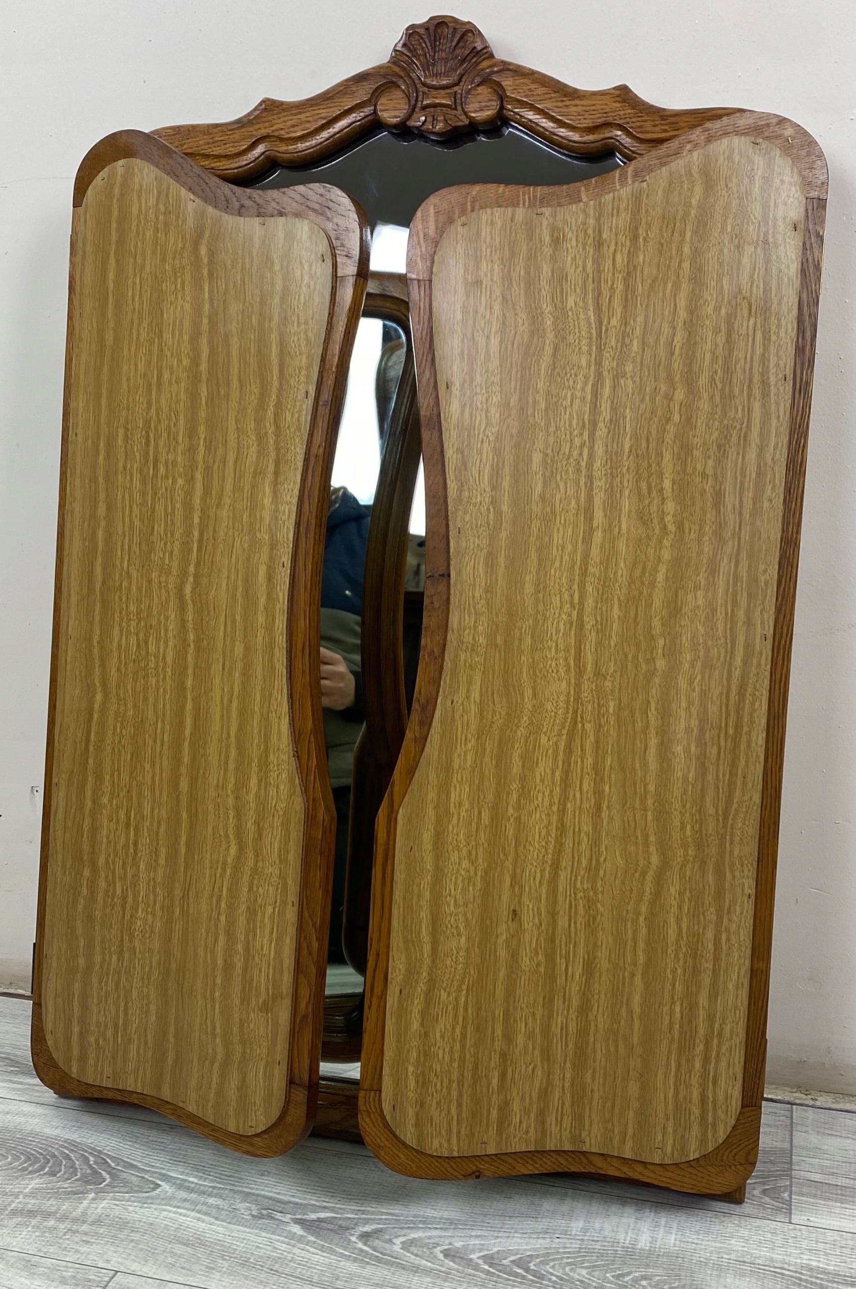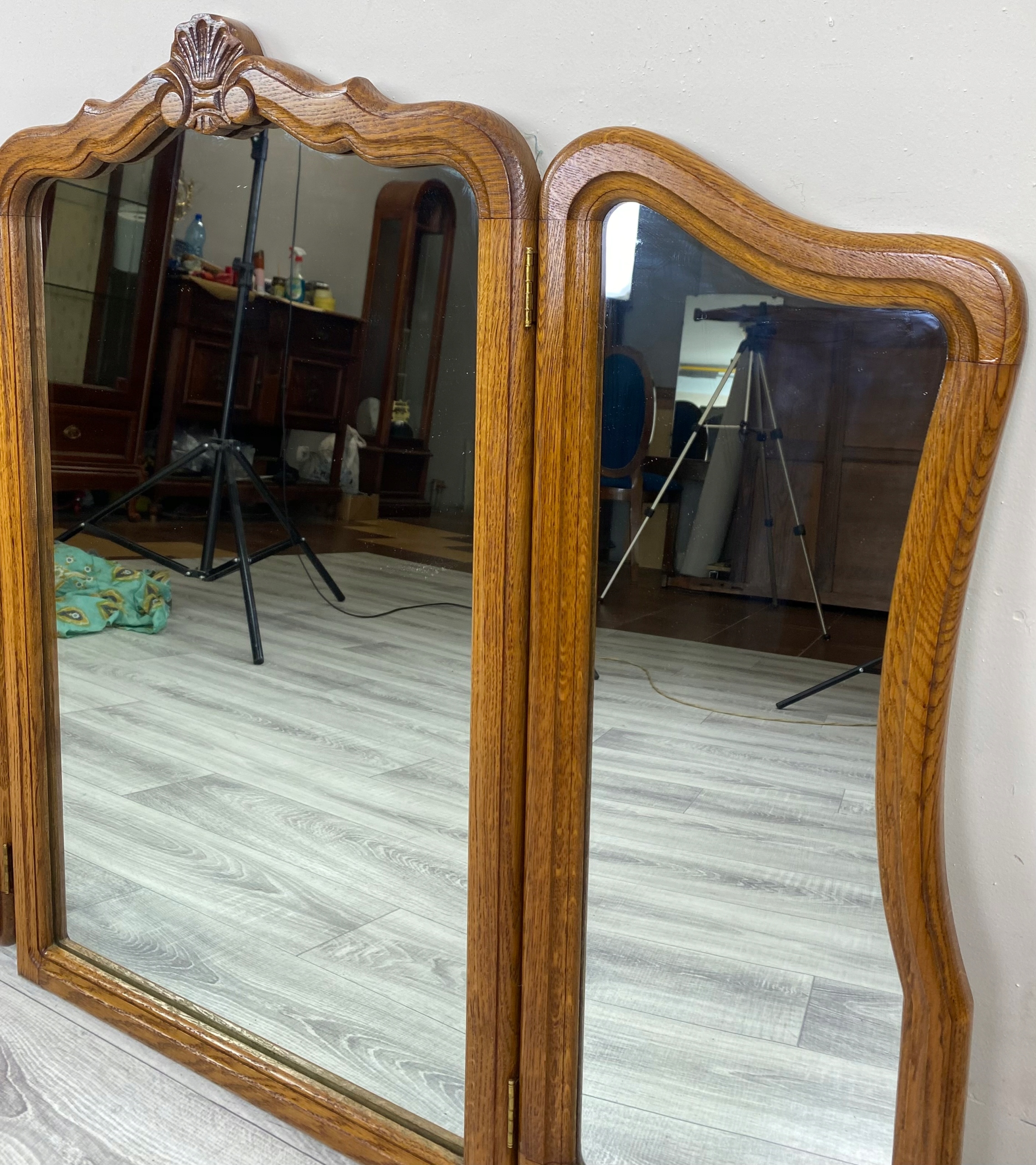 Дзеркало складається з трьох стекол - одного більшого, середнього і два. менші, бічні, які рухливі завдяки петлям. Таке розташування дозволяє зручно встановлювати стулки під різними кутами, що дозволяє бачити відображення з кількох ракурсів одночасно - ідеальне рішення для туалетного столика або шафи.
